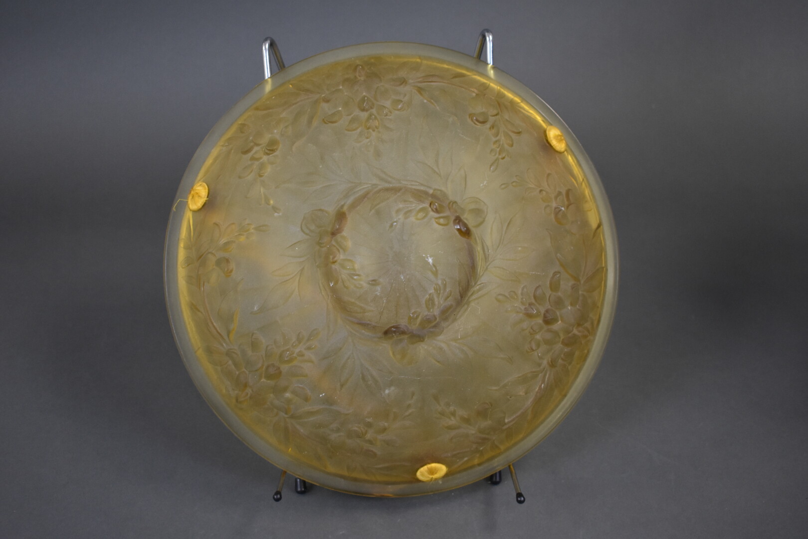 Suspension à vasque en verre moulé tabac à décor de glycine. Début XXe siècle. Diam. : 35,5 cm.