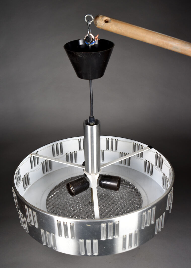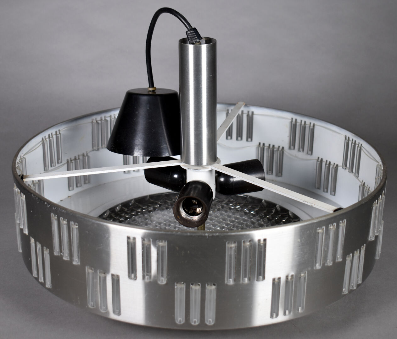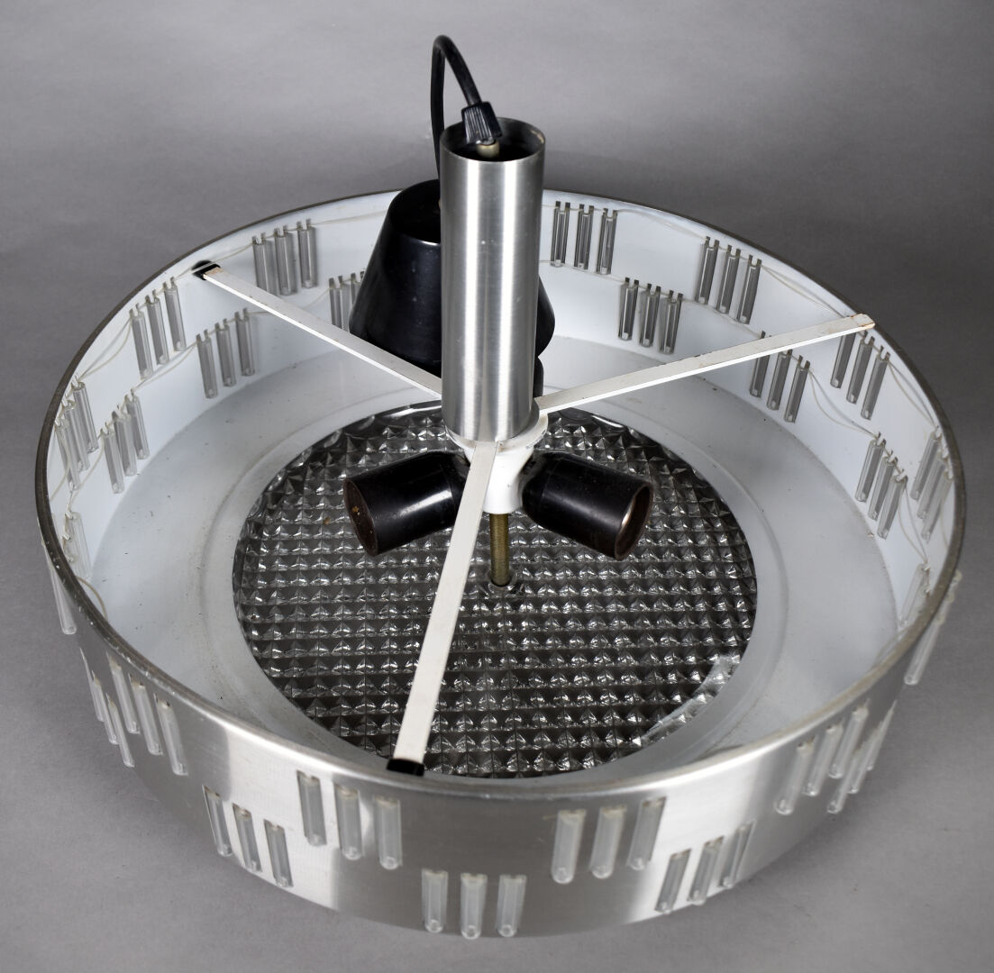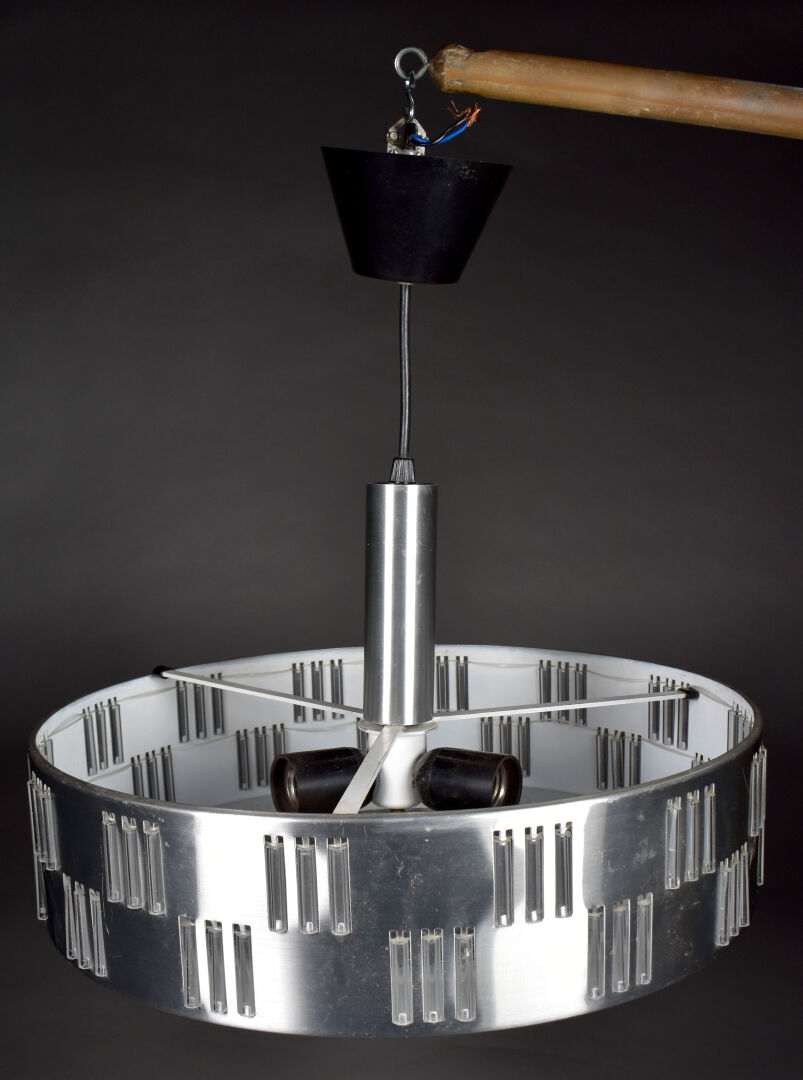 Suspension en métal brossé, verre et tubes de plexiglas (usures et frottements). Seconde moitié du XXe siècle. Haut. : 51 cm – Diam. : 43,5 cm.