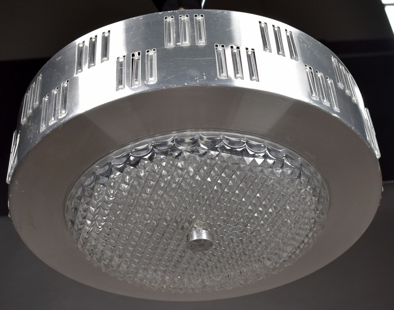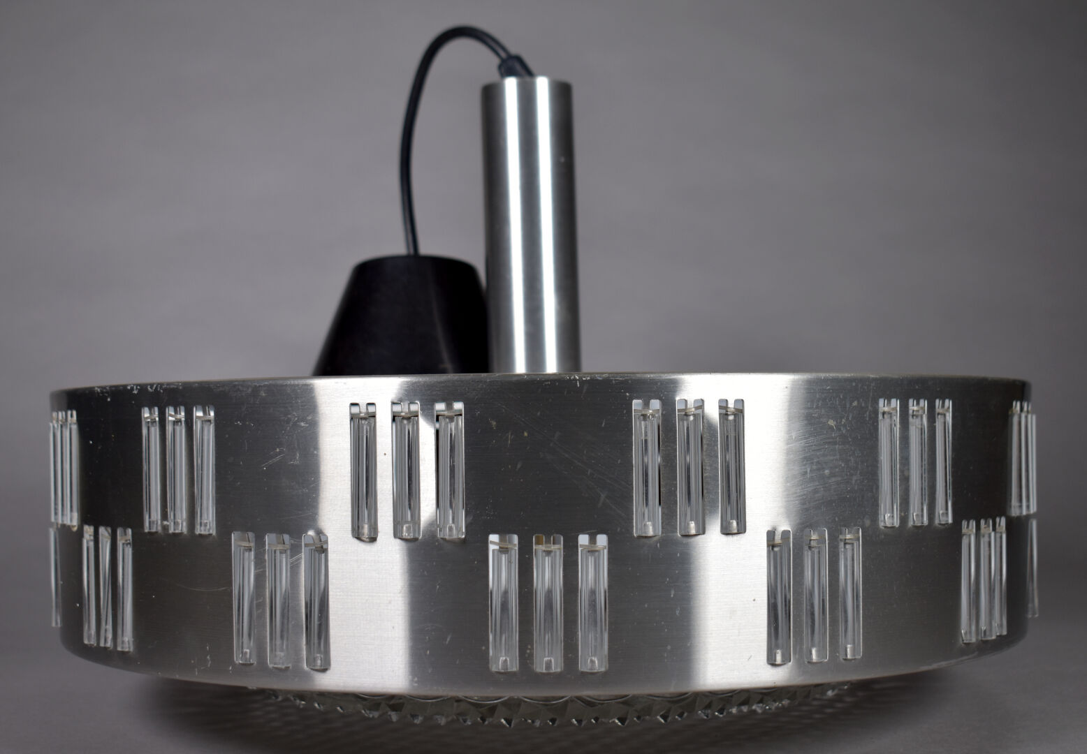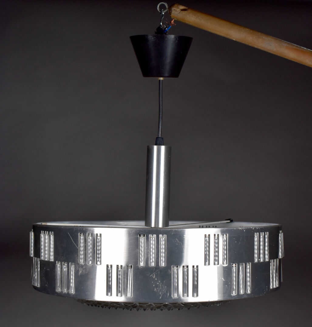 Suspension en métal brossé, verre et tubes de plexiglas (usures et frottements). Seconde moitié du XXe siècle. Haut. : 51 cm – Diam. : 43,5 cm.