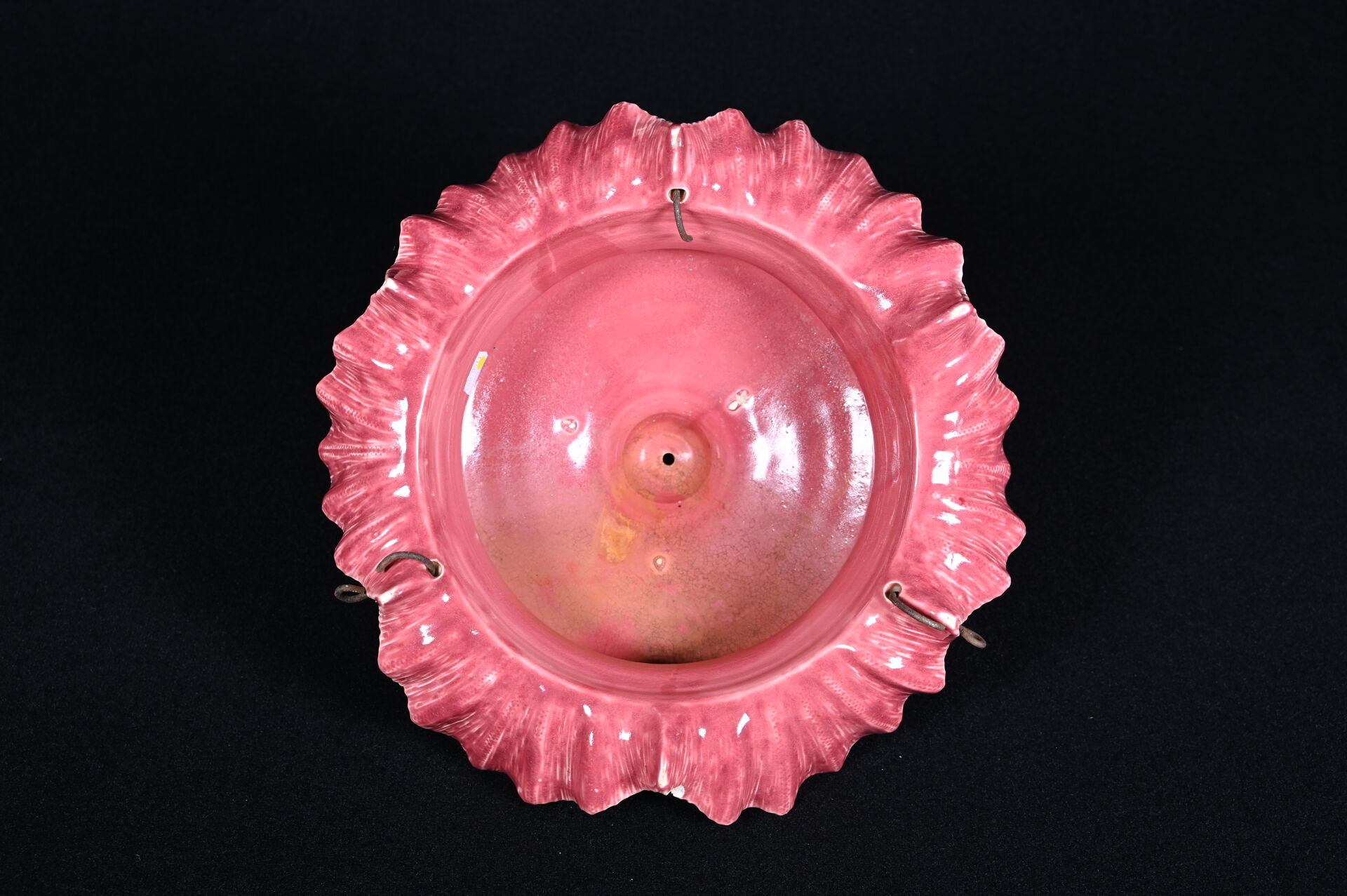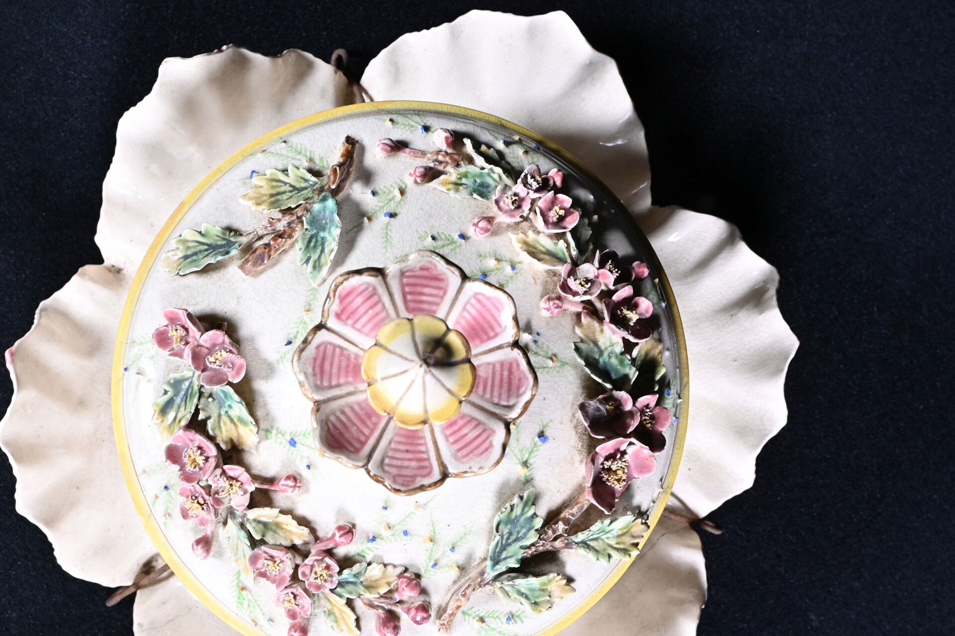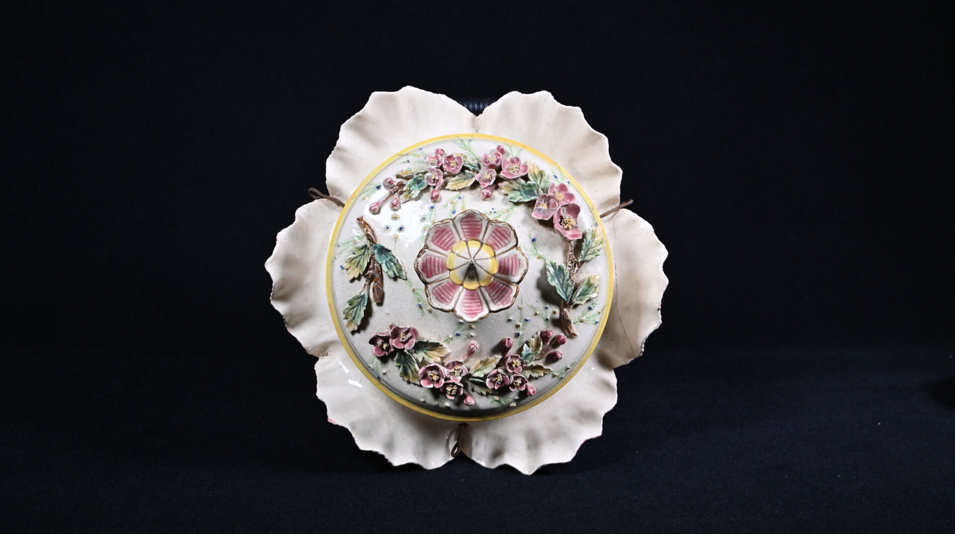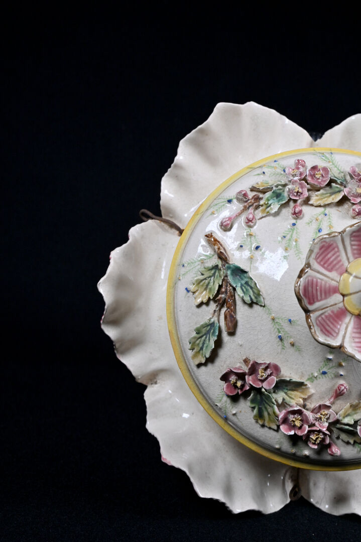 Suspension florale en barbotine (un accident restauré). Vers 1900. Haut. : 29 cm – Diam. : 40 cm.