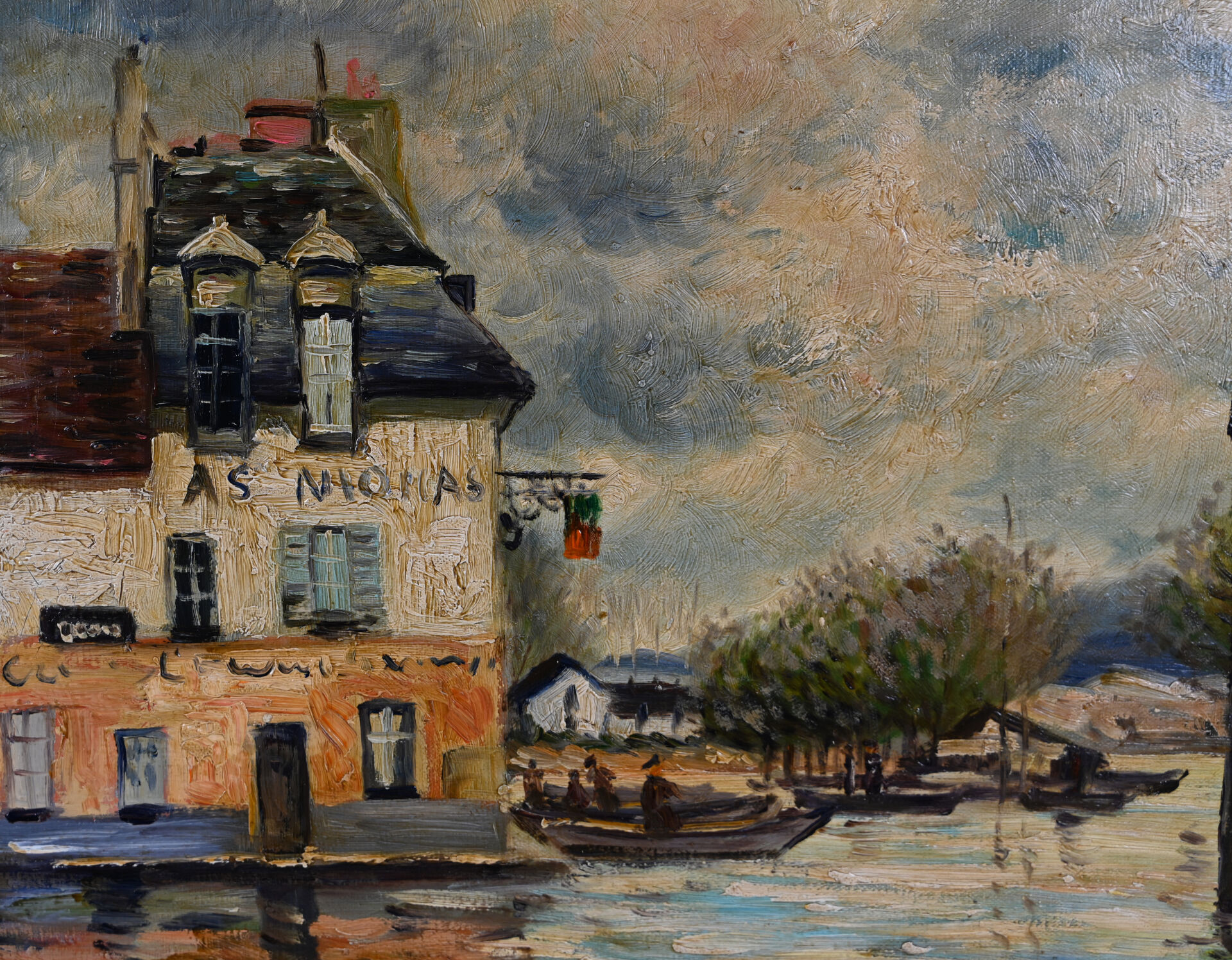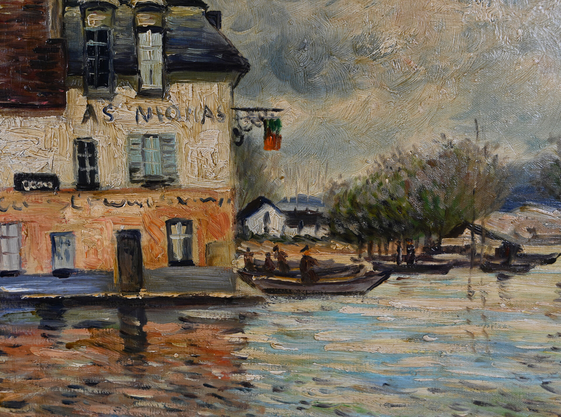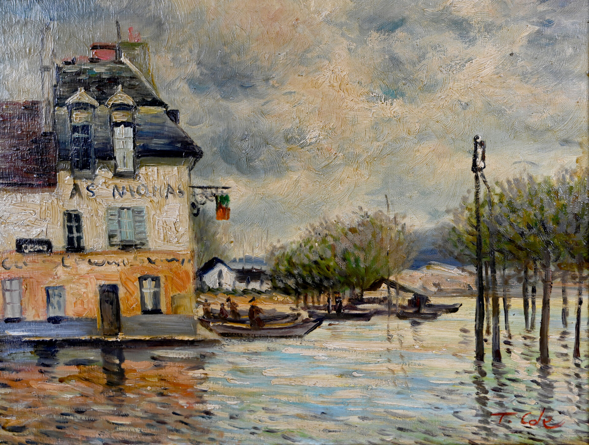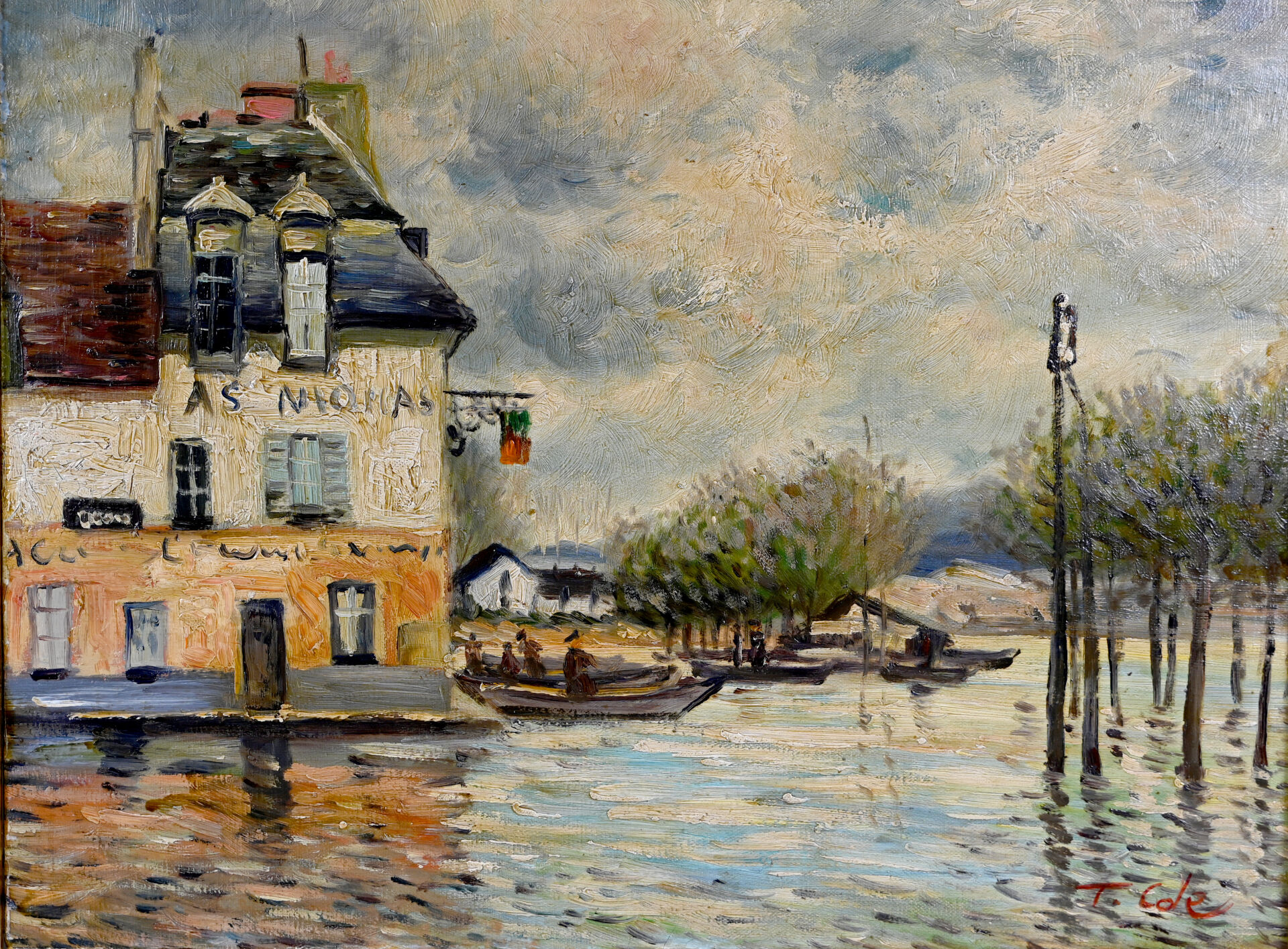 T.COLE (XXe siècle) d’après SISLEY. Inondations à Port-Marly. Huile sur toile signée en bas à droite. 31 x 40 cm.