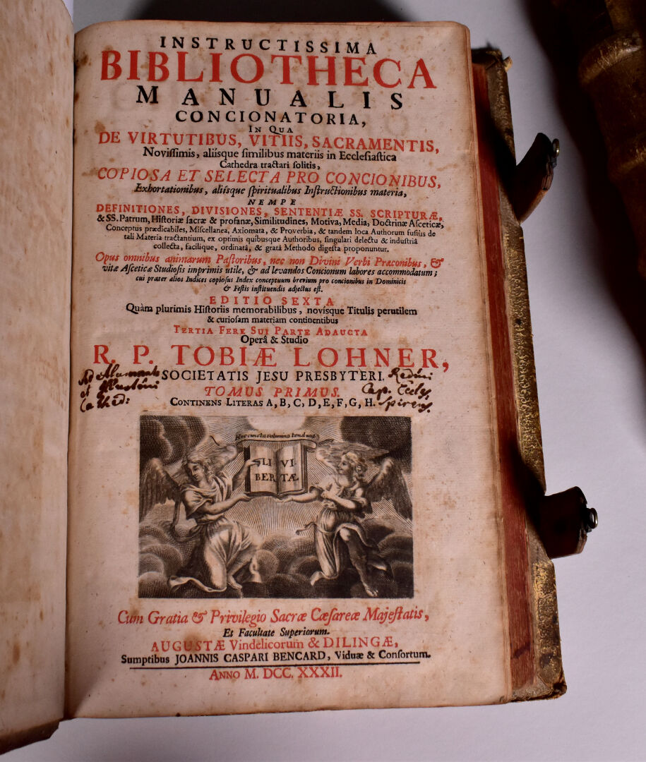 Tabiae LOHNER – INSTRUCTISSIMA BIBLIOTHECA MANUALIS CONCIONATORIA, in Qua… Joannis Caspari Bencard. 1732. Trois volumes In-4 (rousseurs). reliure vélin avec fermoirs en métal (usures).