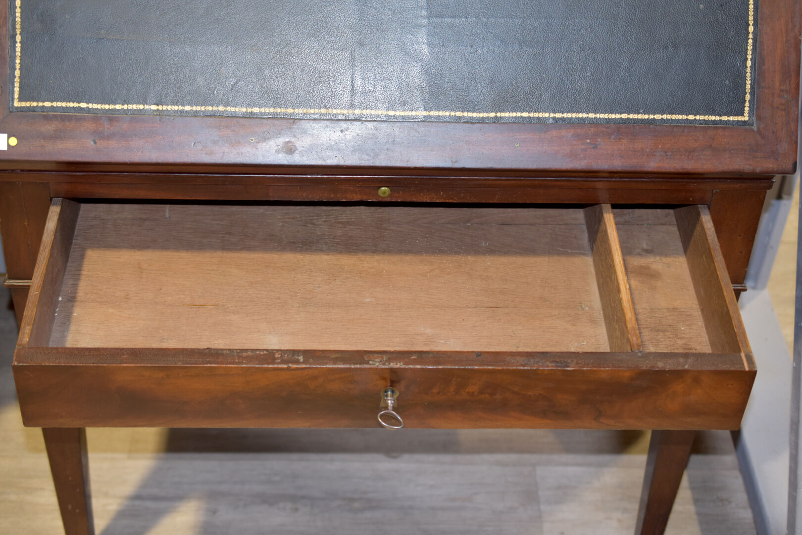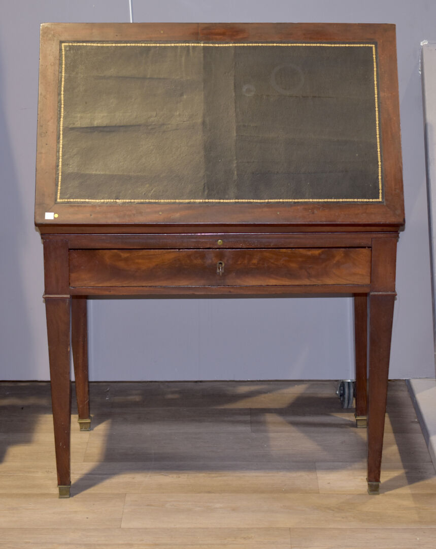 Table à écrire en acajou et placage d’acajou. Elle ouvre à un tiroir et deux tirettes latérales en ceinture et repose sur quatre pieds gaine terminés par des sabots de laiton. Plateau à crédence inclinable. Gainé de cuir noir doré aux petits fers (rayures, usures, éclats sur les tablettes et mouillure). Style Louis XVI, fin du XIXe ou début du XXe siècle. Dim. fermée : Haut. : 75,5 cm – Larg. : 89 cm – Prof. : 53,5 cm.