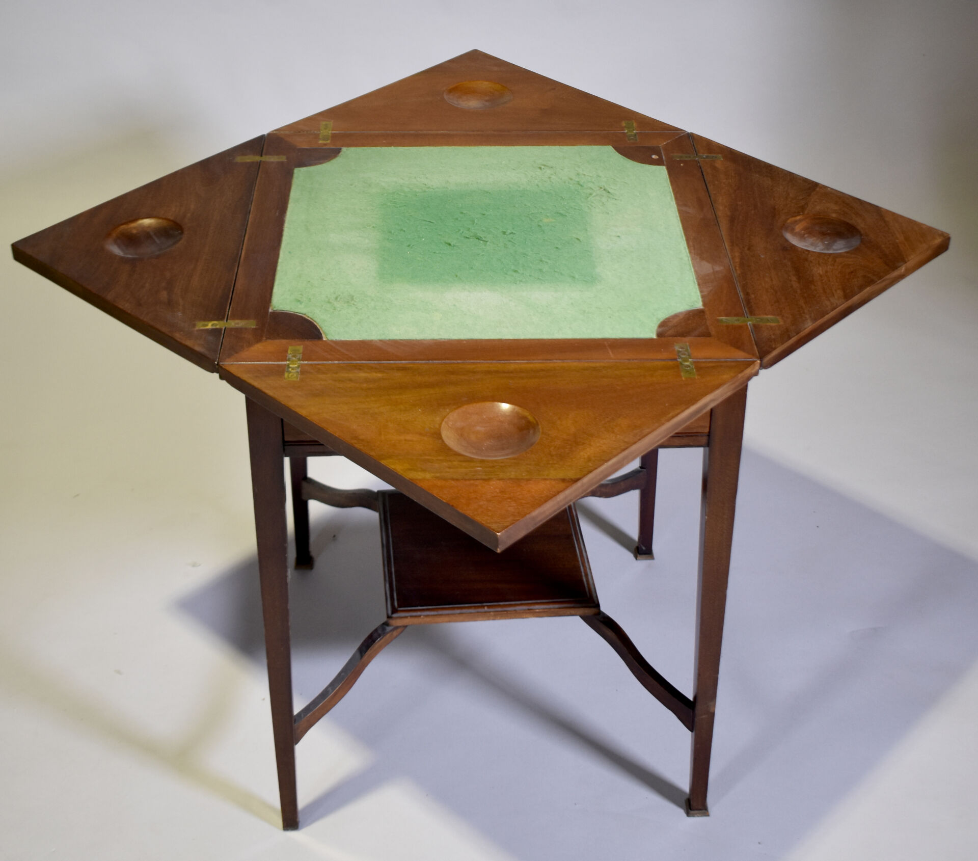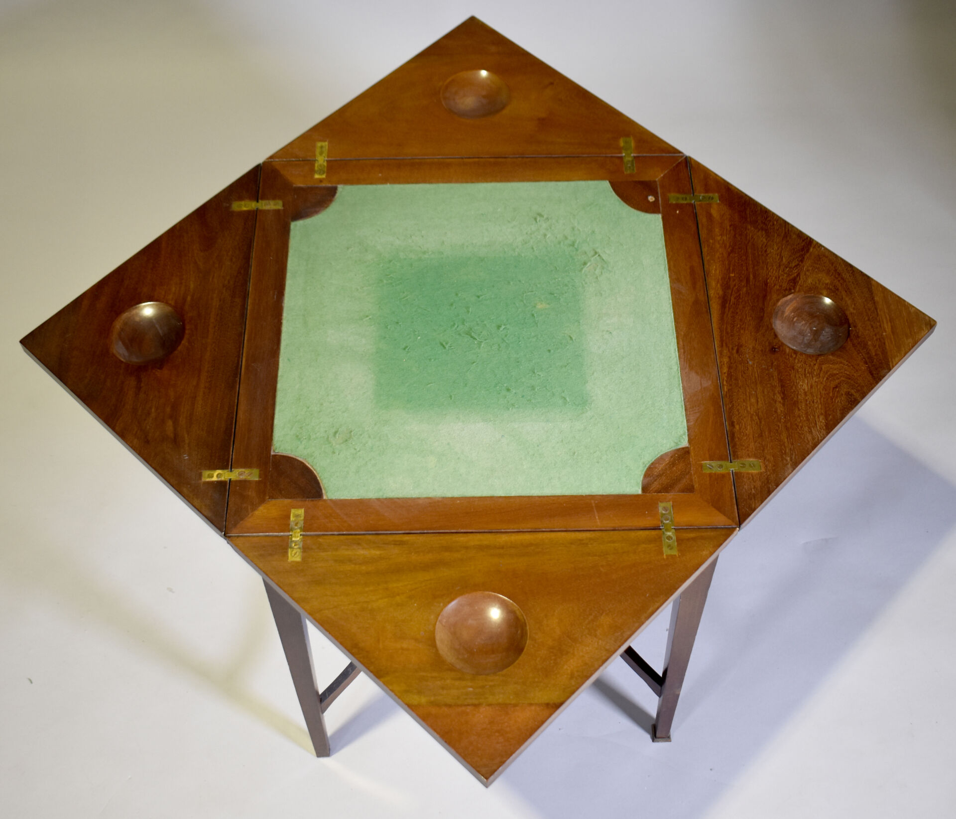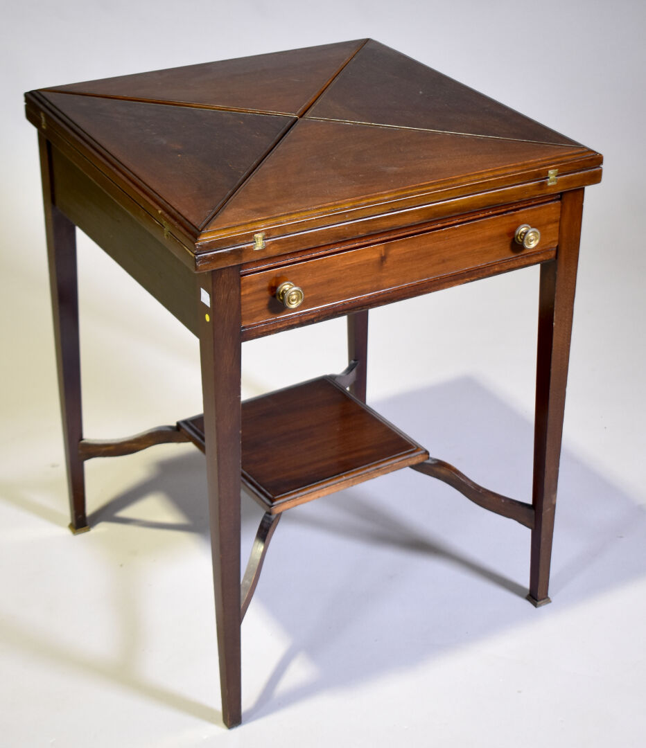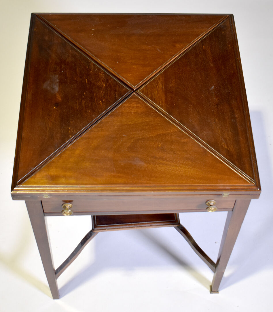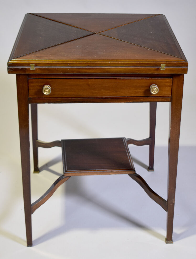 Table à jeu en acajou et placage d’acajou à plateau dit en « mouchoir » intérieur en feutre vert (insolé, usures). Elle ouvre à un tiroir en ceinture, les pieds en gaine terminé par des sabots de laiton (un à refixer). Travail Anglais. DIm. fermée : Haut. : 72 cm – Larg. : 56 cm – Prof. : 56 cm.