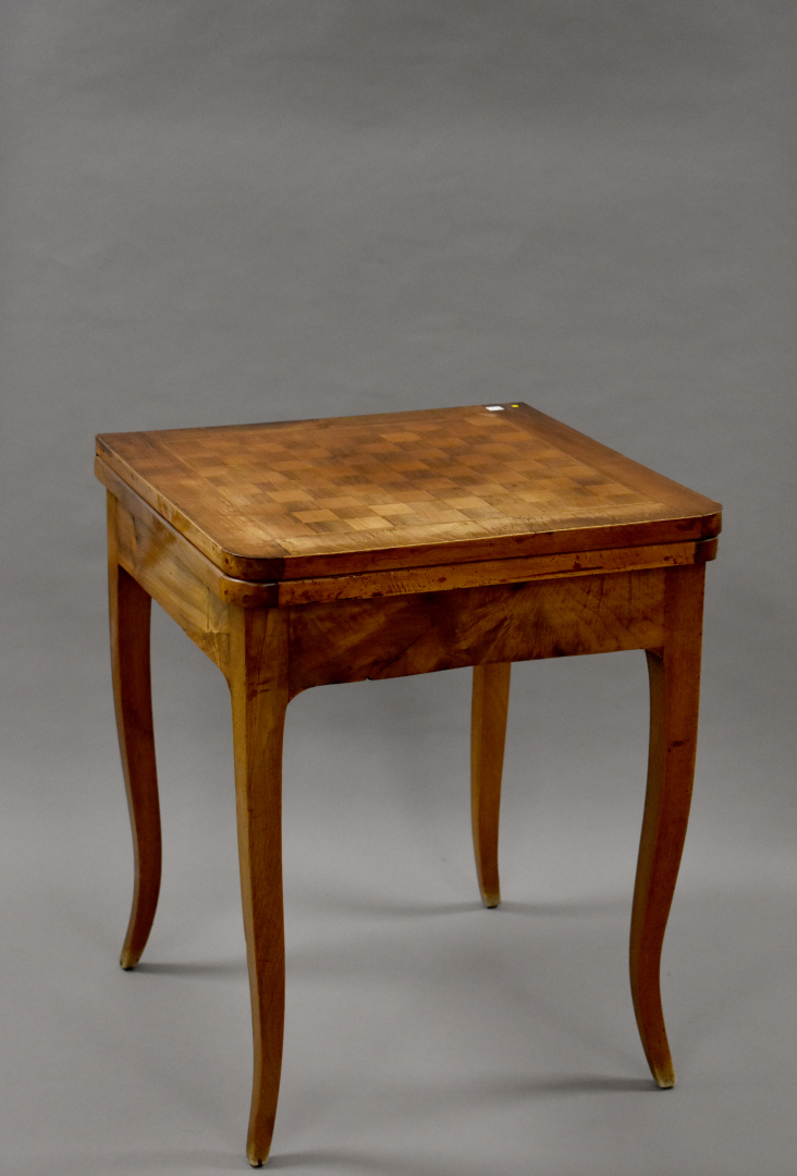 Table à jeu en noyer et placage de noyer et merisier. Le plateau à dammier ouvrant sur un intérieur à feutre vert (postérieur). Elle ouvre à un tiroir en ceinture (éclats, insolée, restauration). Style Louis XV, fin du XIXe ou début du XXe siècle. Haut.: 74 cm