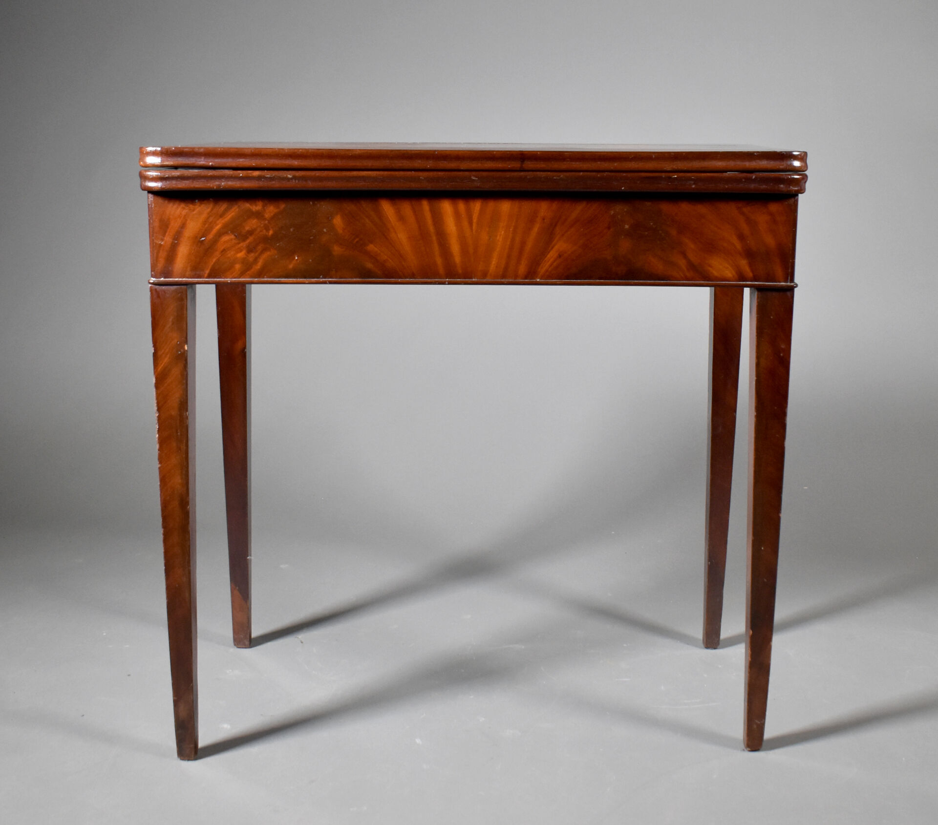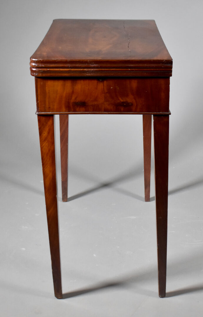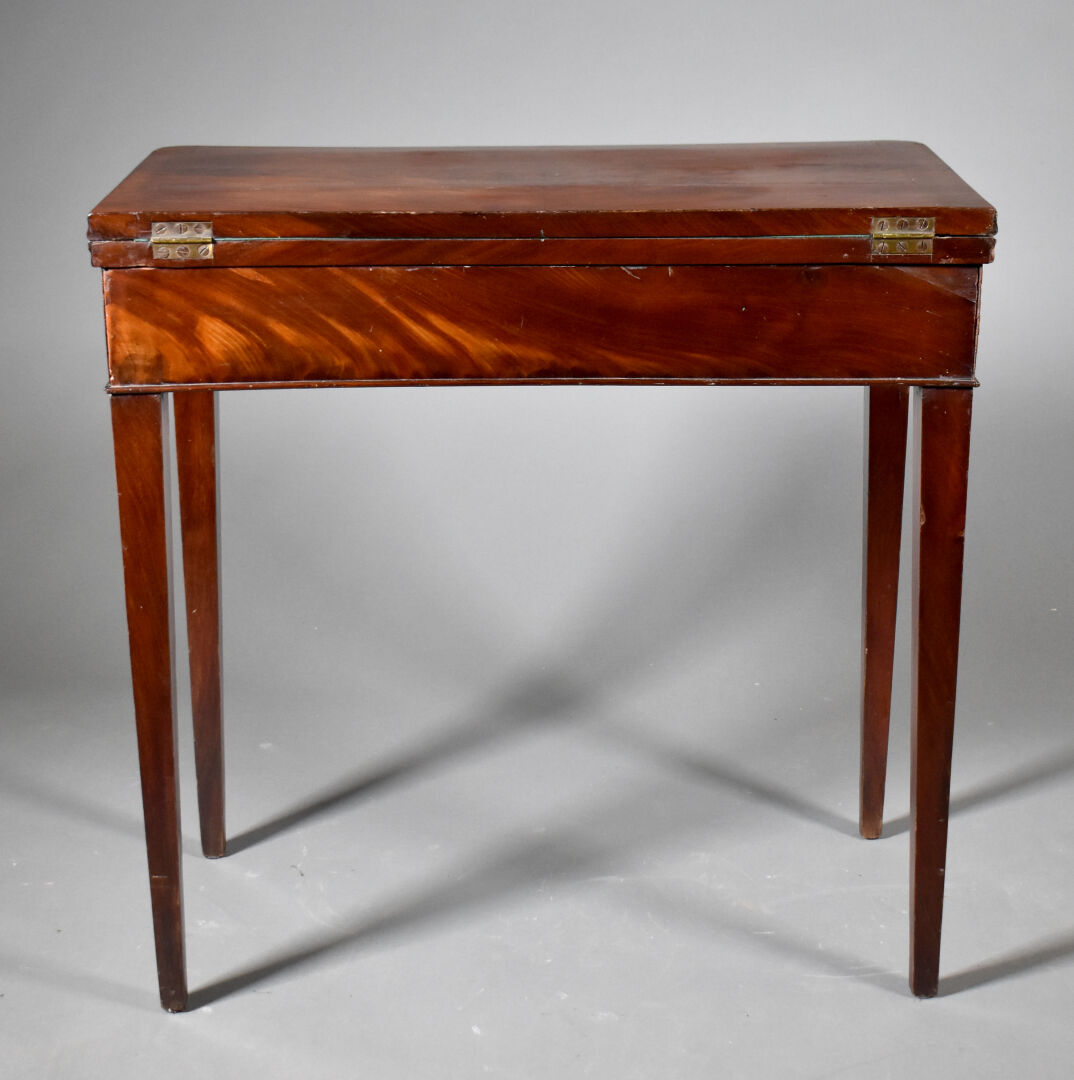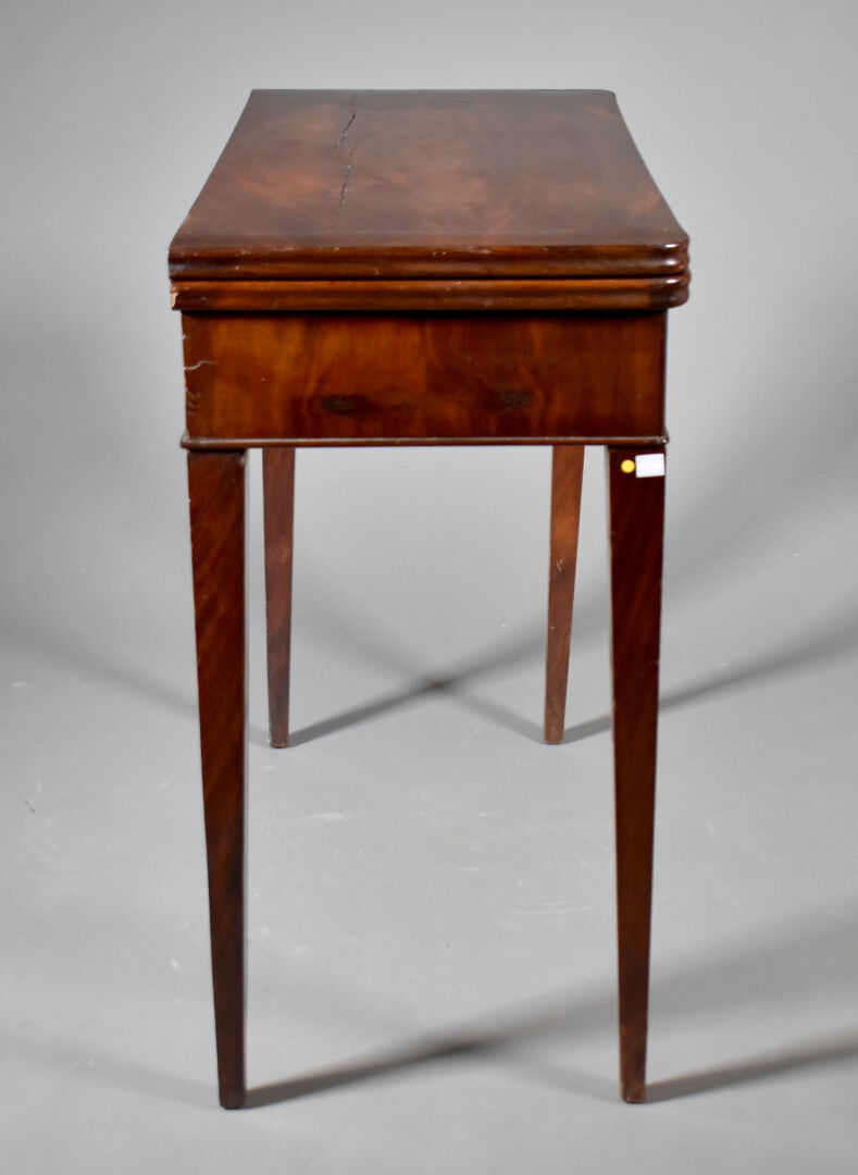 Table à jeu en placage d’acajou et acajou flammé. Intérieur du plateau garni de feutre vert (usures, petits sauts de placage et fente). Fin du XIXe siècle. Haut. : 75 cm. Larg. : 77 cm – Prof. : 77 cm.