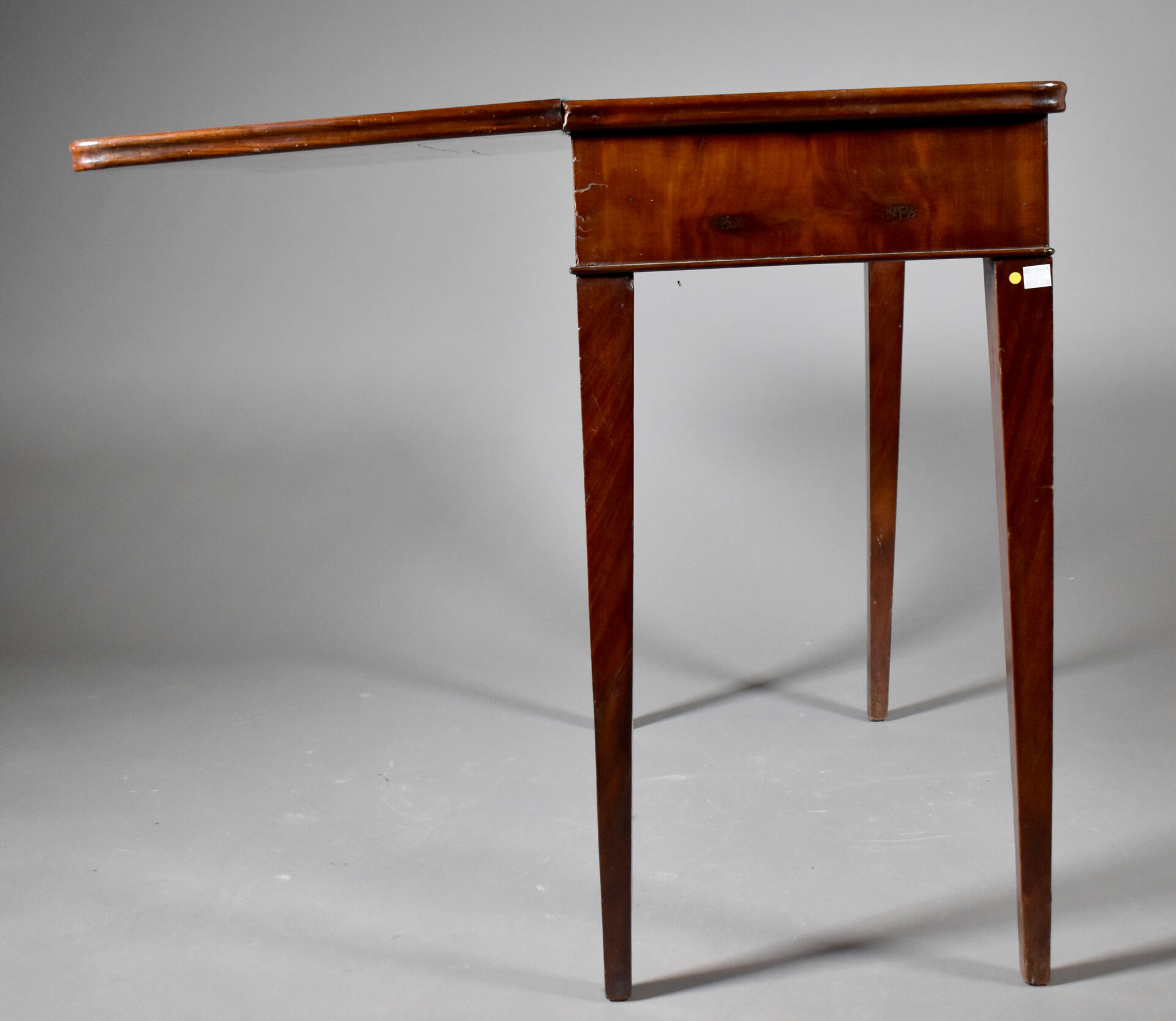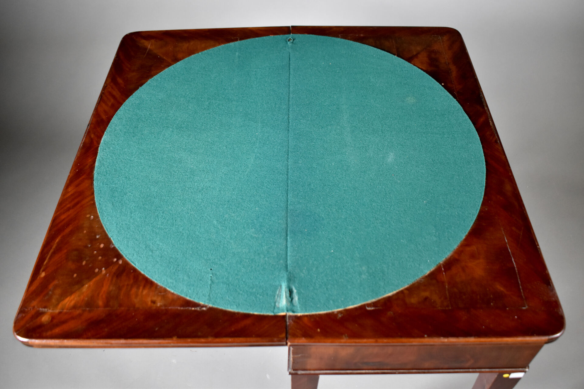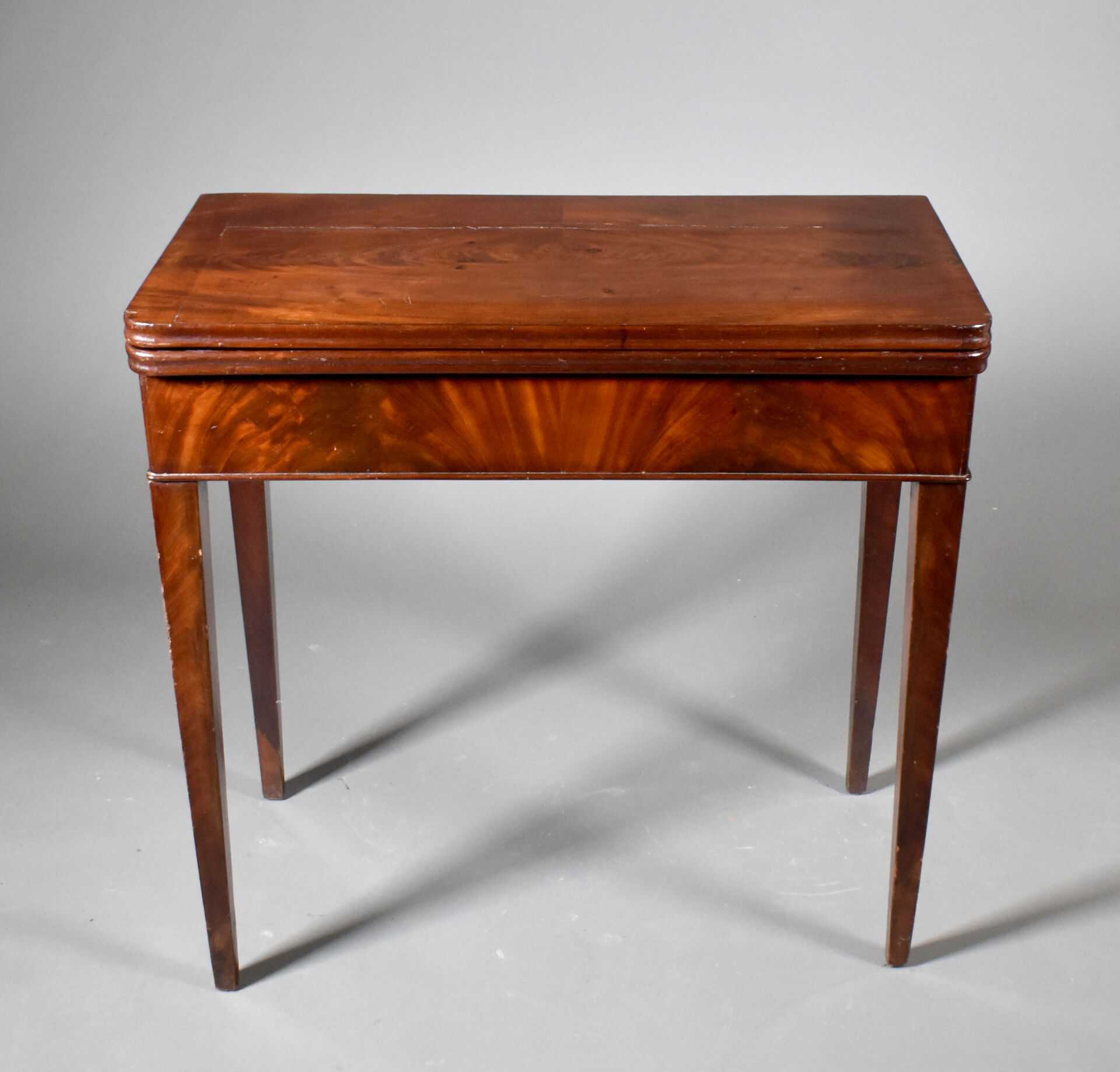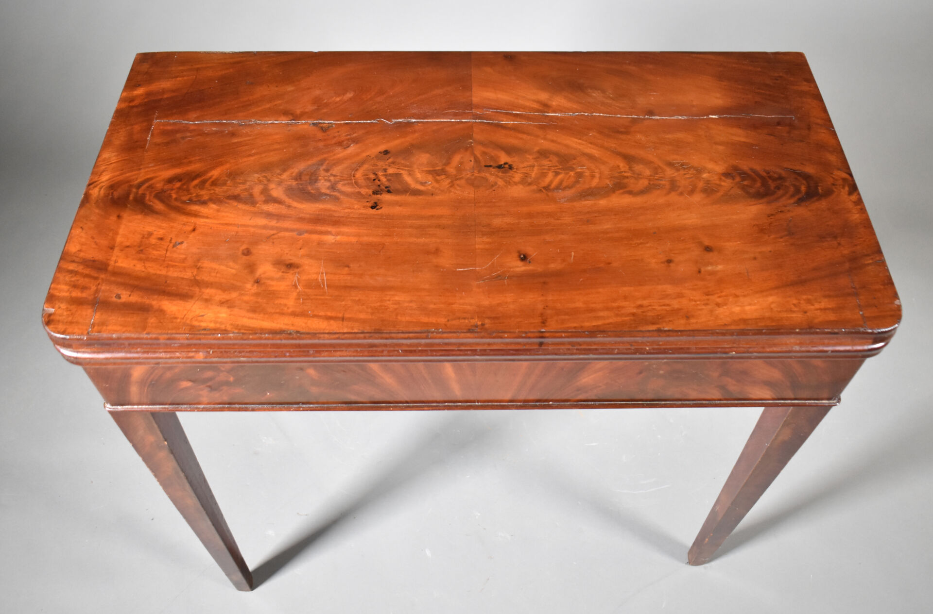 Table à jeu en placage d’acajou et acajou flammé. Intérieur du plateau garni de feutre vert (usures, petits sauts de placage et fente). Fin du XIXe siècle. Haut. : 75 cm. Larg. : 77 cm – Prof. : 77 cm.