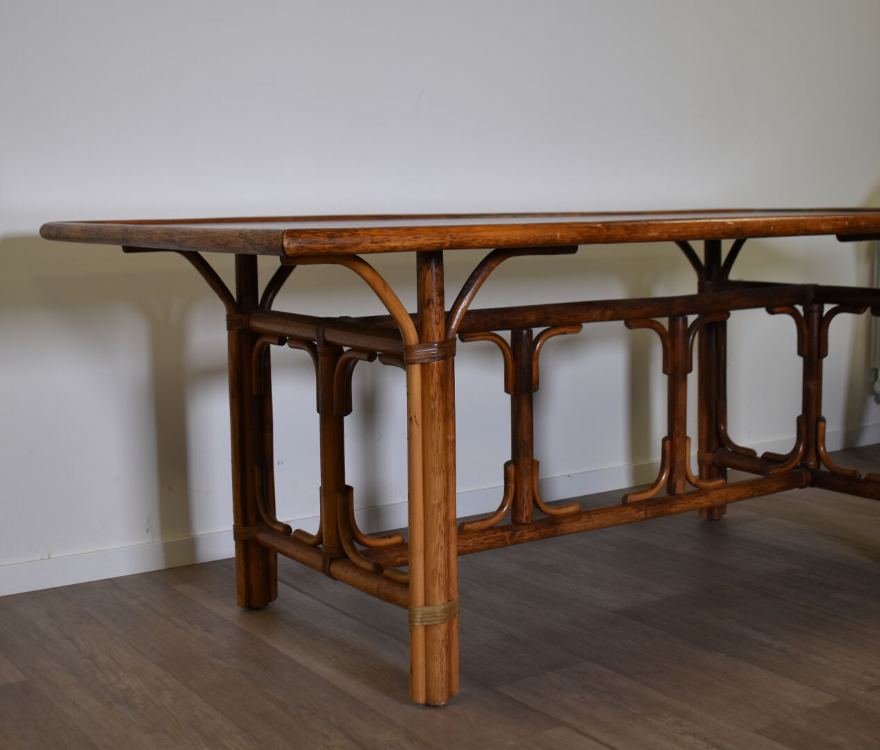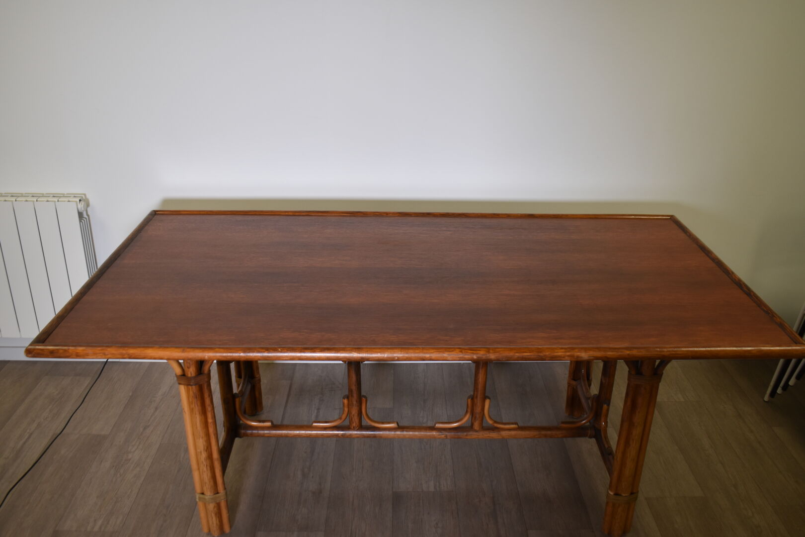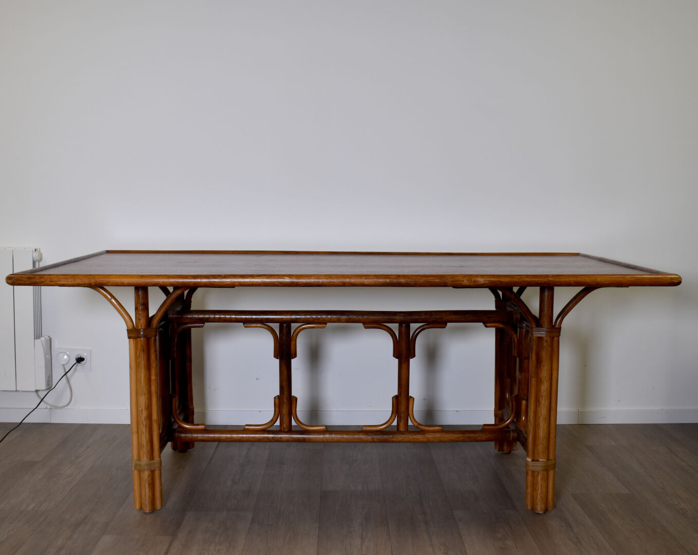 Table à manger en rotin, les pieds noués par des liens de cuir fauve réunis par une entretoise. Vers 1950. Haut. : 74 cm – Larg. : 148,5 cm – Prof. : 95 cm.