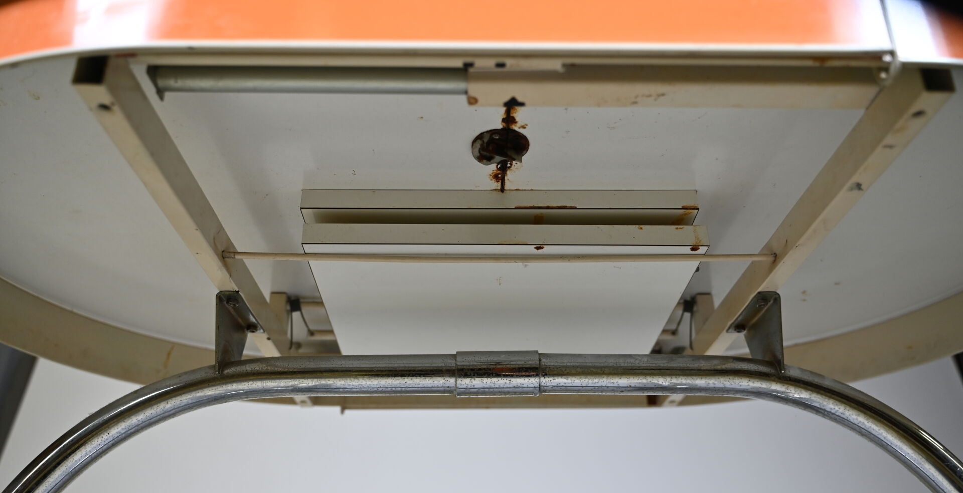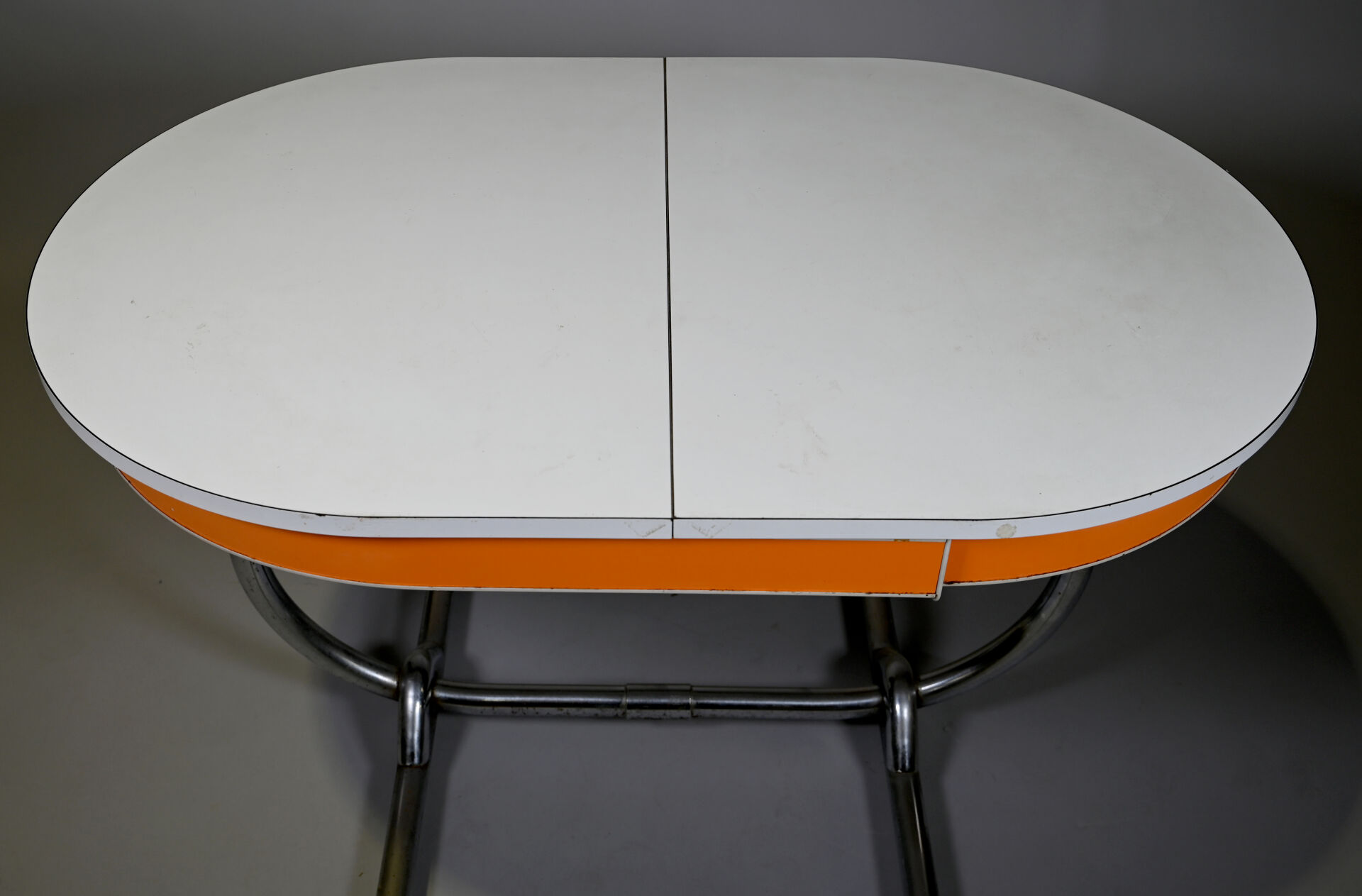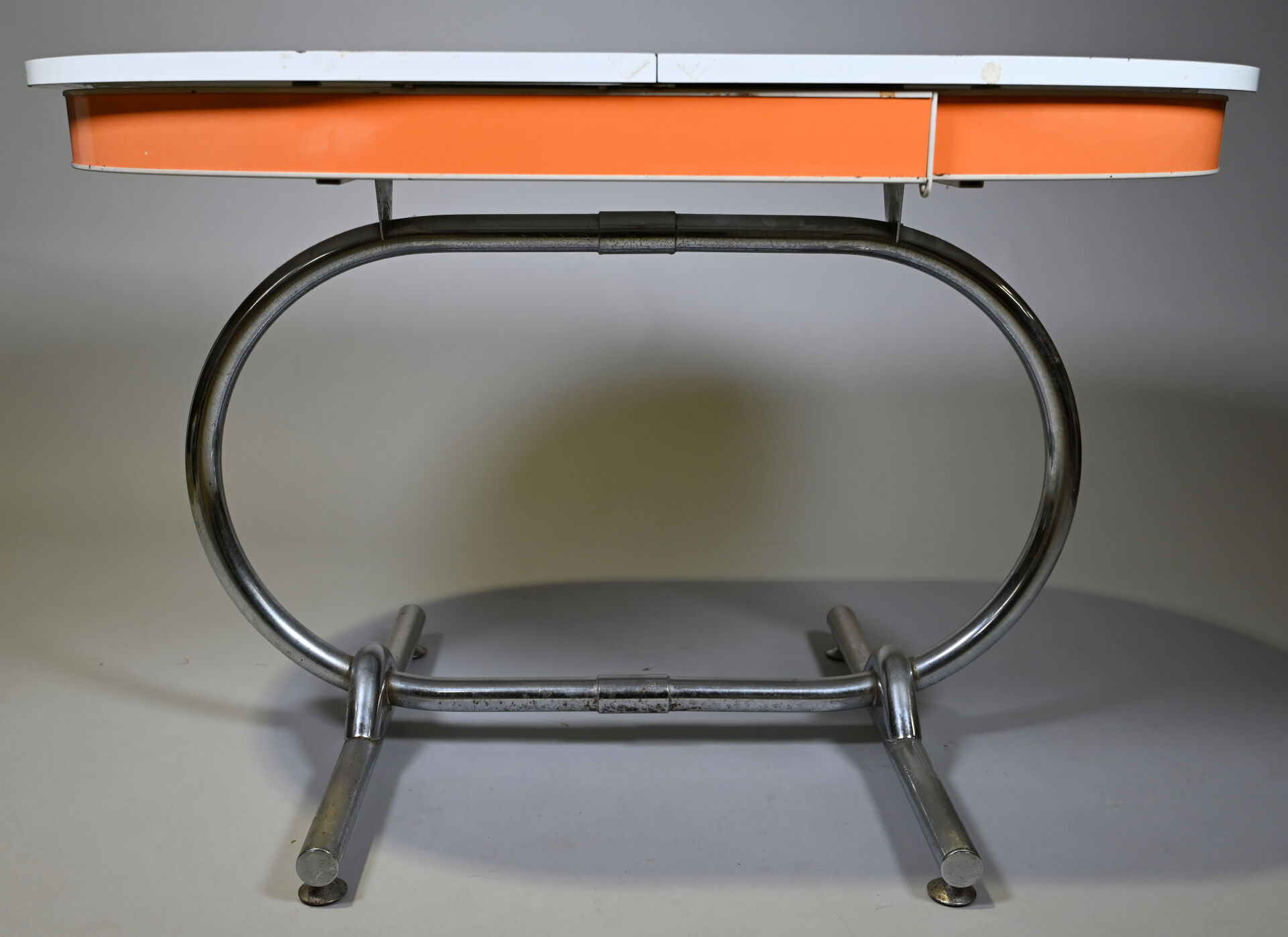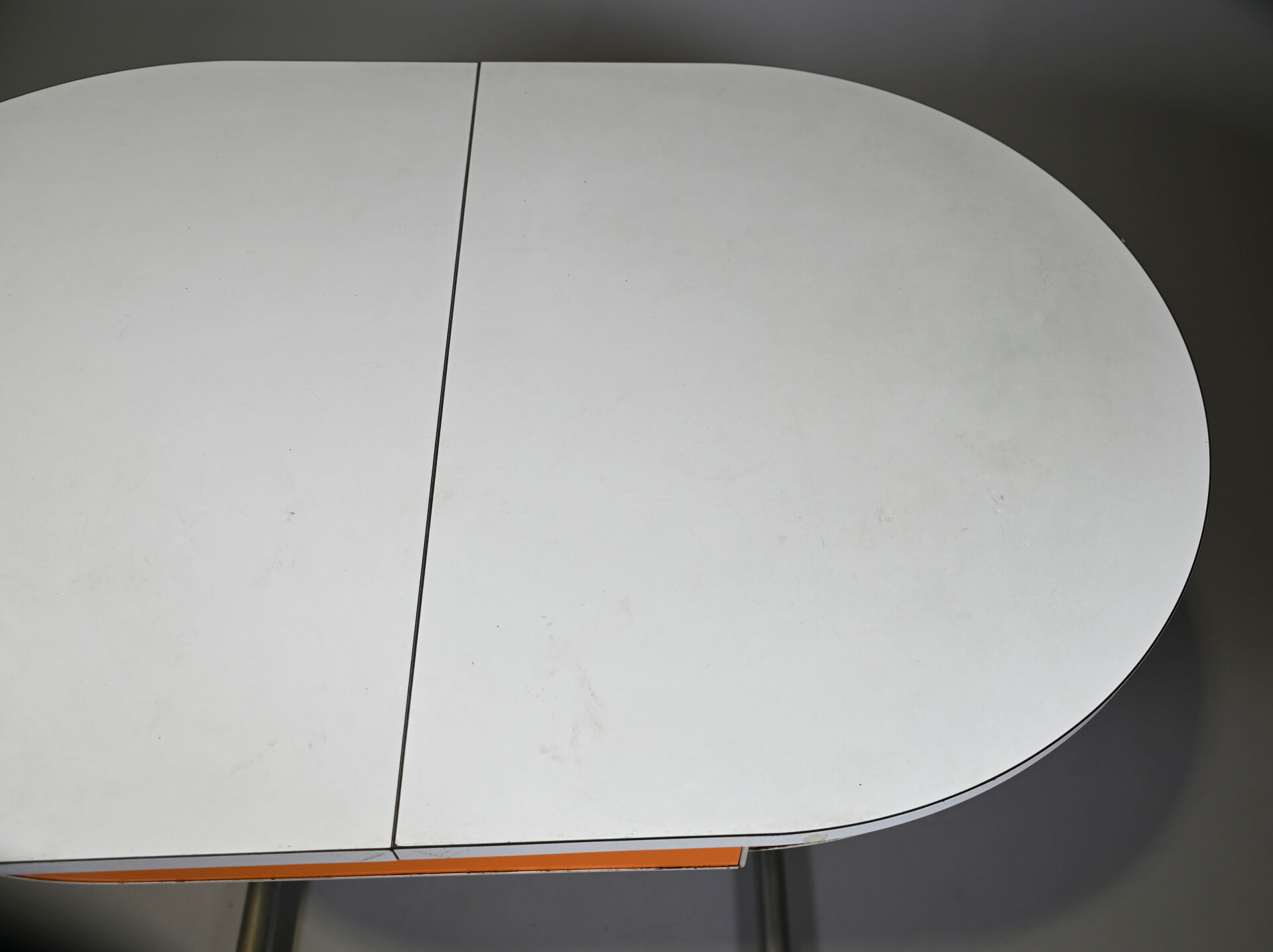 Table à plateau oblong en formica blanc et orange, le piètement à arcs de cercle en métal tubulaire chromé (usures d’usage, un pied à refixer). Vers 1970. Haut. : 77,5 cm – Larg. : 121,5 cm – Larg. : 77 cm.