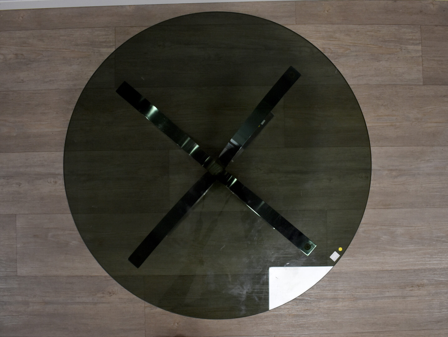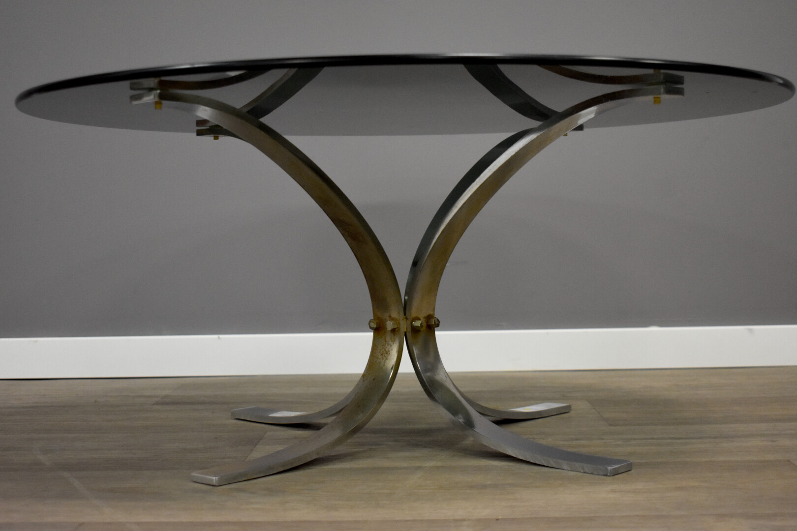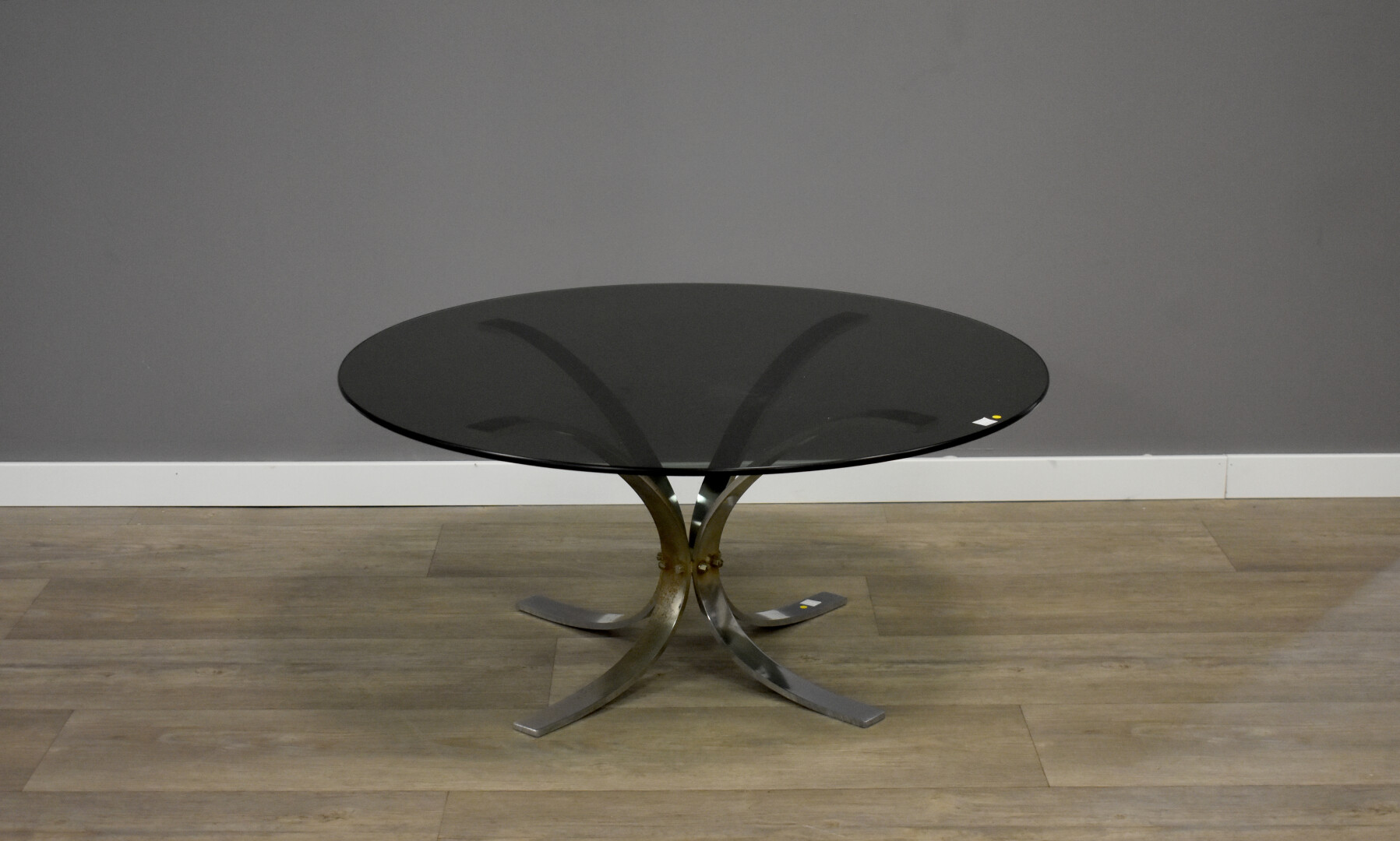 Table basse à plateau circulaire en verre fumé, le pietement formé de quatre tiges coubes en métal chromé. Vers 1970. Haut. : 34 cm – Diam. : 75 cm.