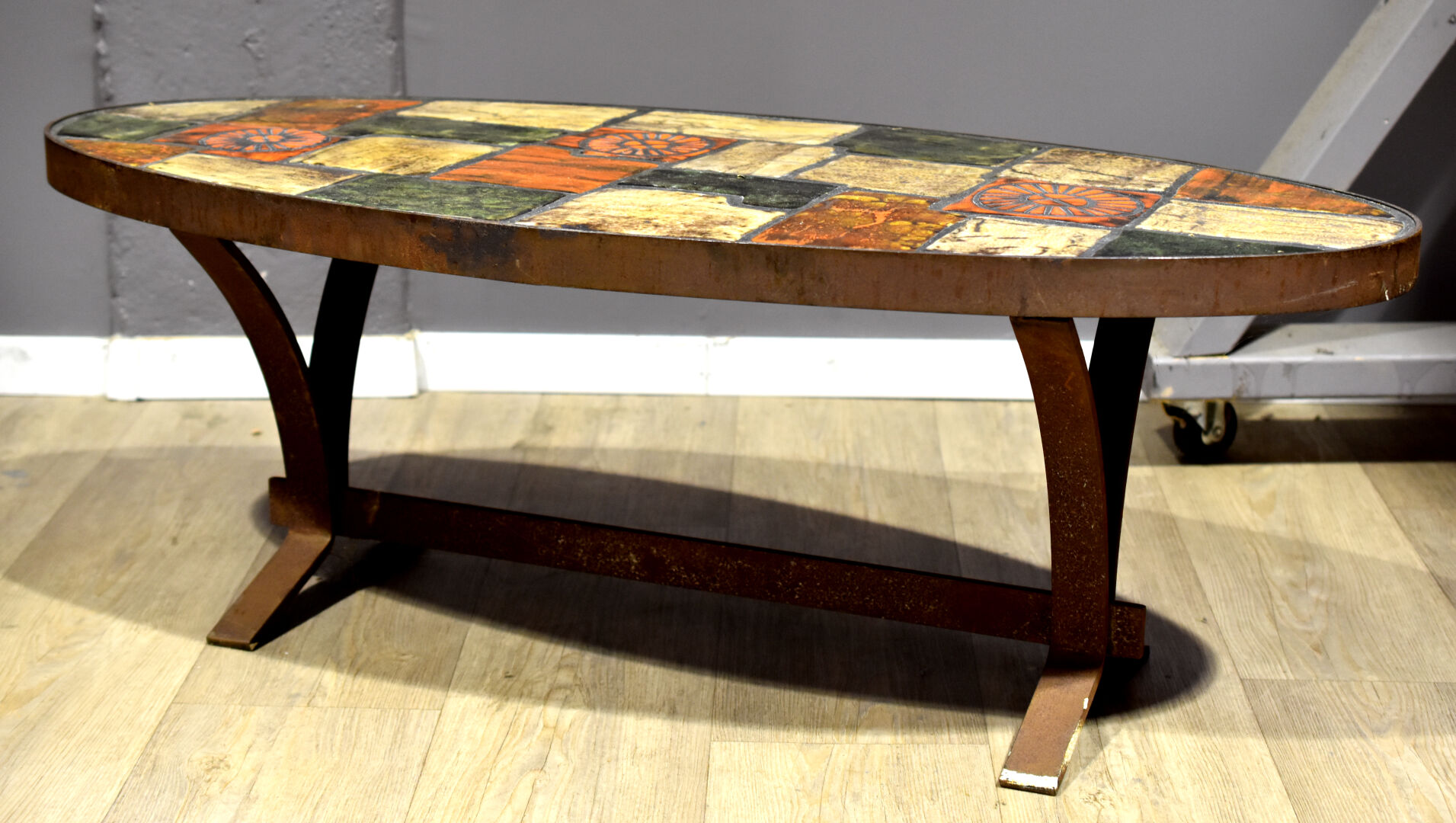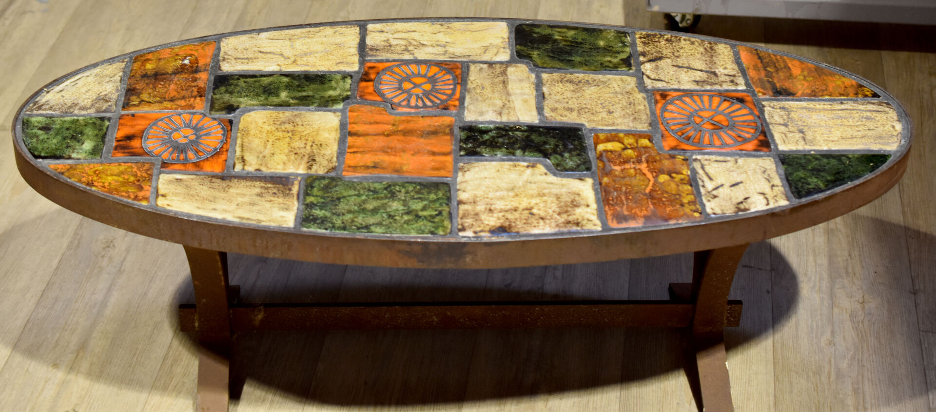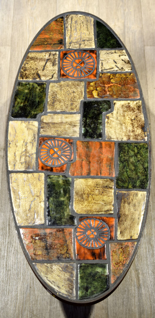 Table basse à plateau ovale, la structure en métal, le plateau garni de carreaux de céramique émaillés orange, vert et crème. Vers 1970/1980. Haut. : 38 cm – Larg. : 109 cm – Prof. : 48 cm.