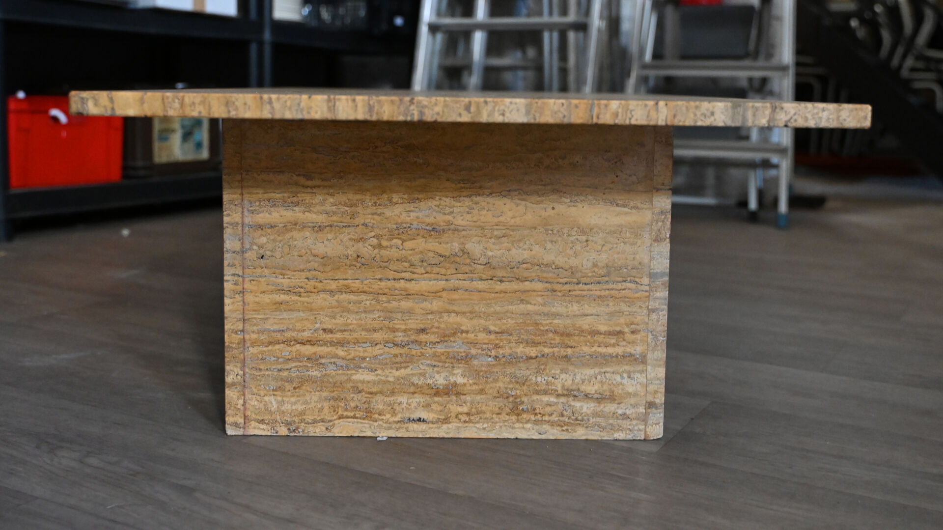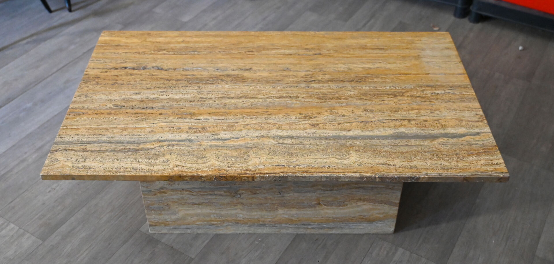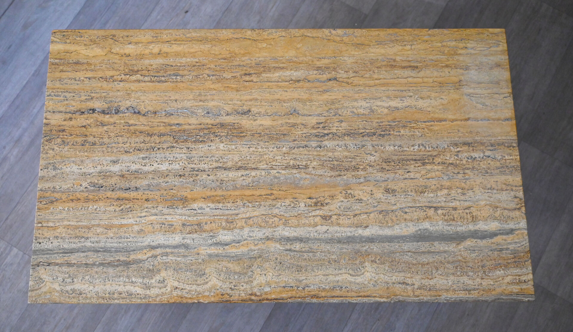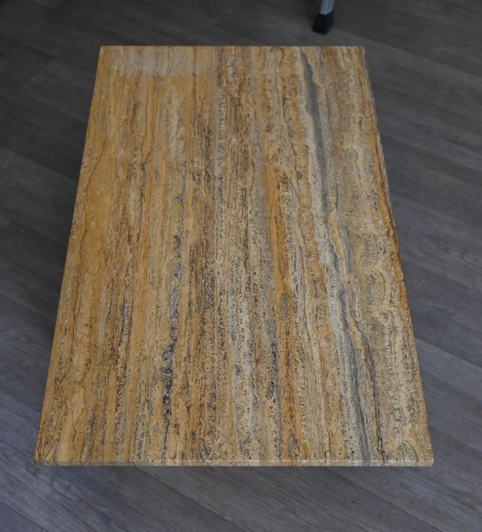 Table basse à plateau rectangulaire en travertin. Démontable. Vers 1970. Haut. : 35 cm – Larg. : 110 cm – Prof. : 65 cm.