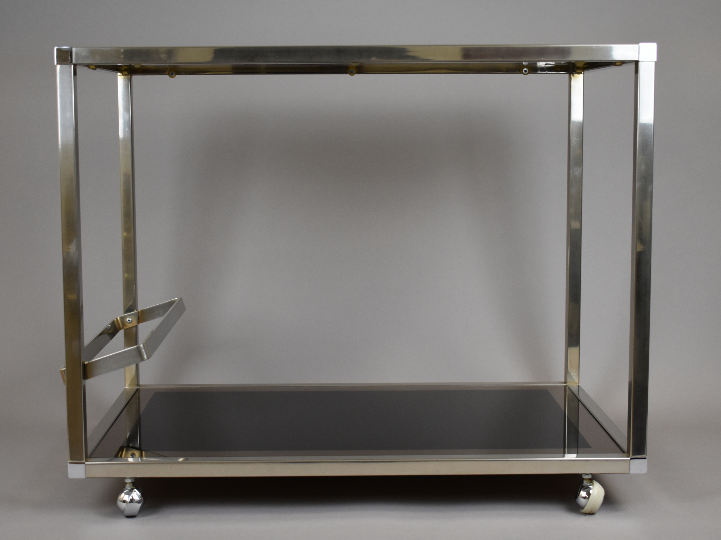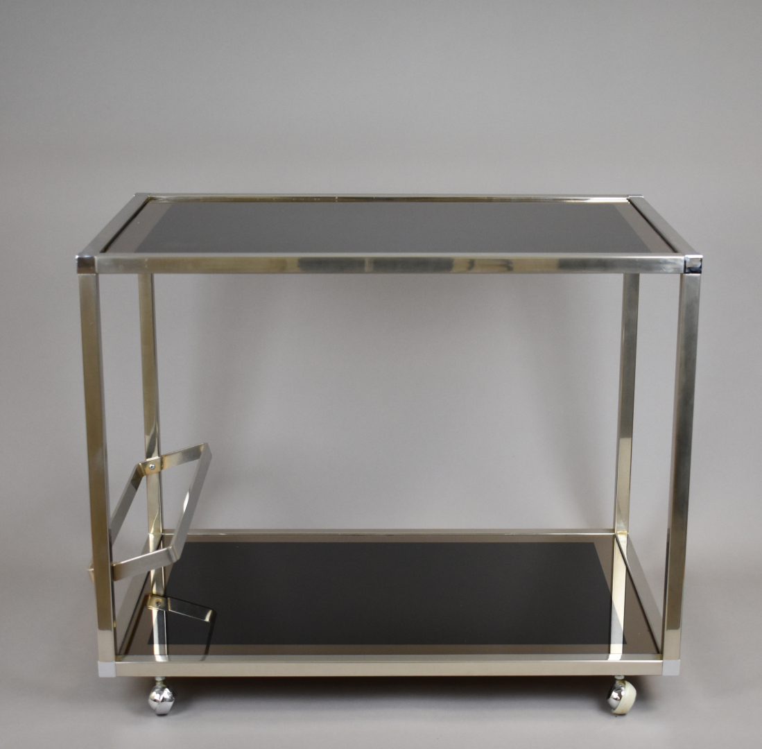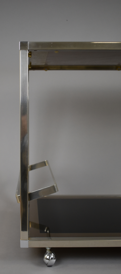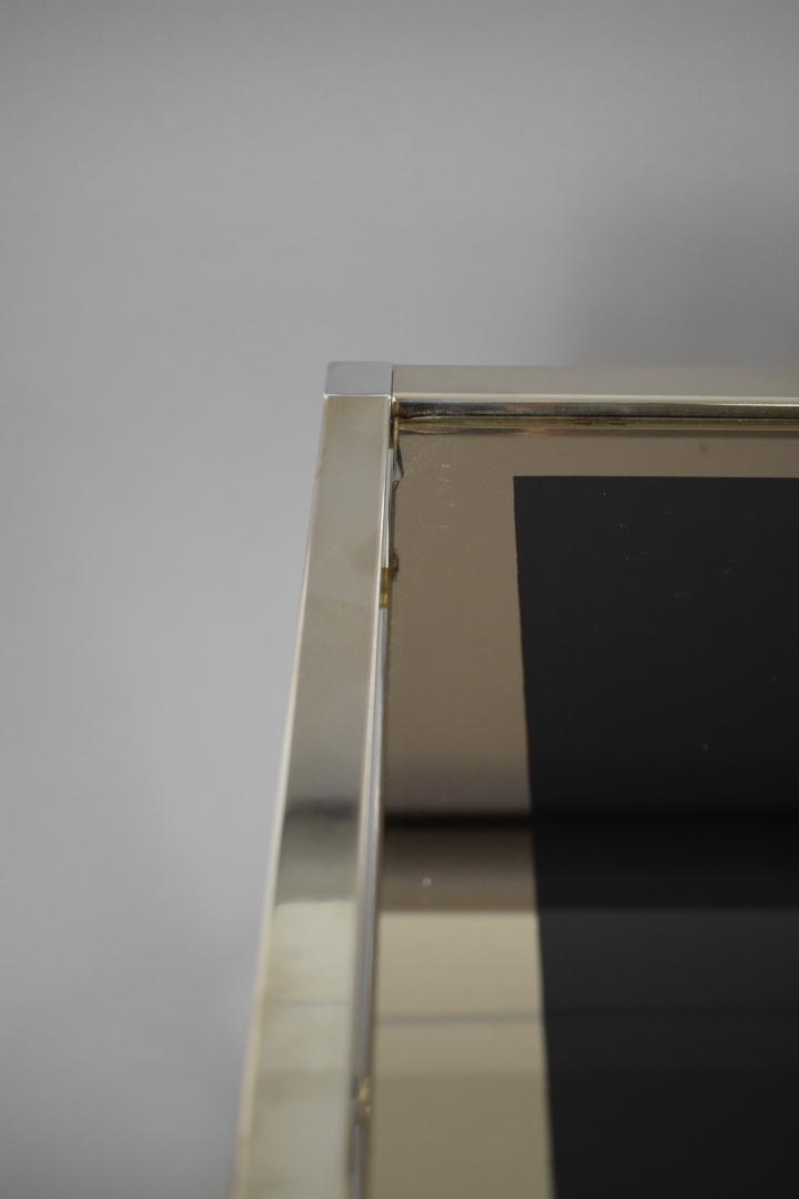 Table basse à structure carrée en métal chromé, plateaux de verre fumé eglomisé argenté (petits éclats au verre). Elle repose sur des petites roulettes. Vers 1970. Haut. : 55 cm – Larg. : 68 cm – Prof. : 44 cm.
