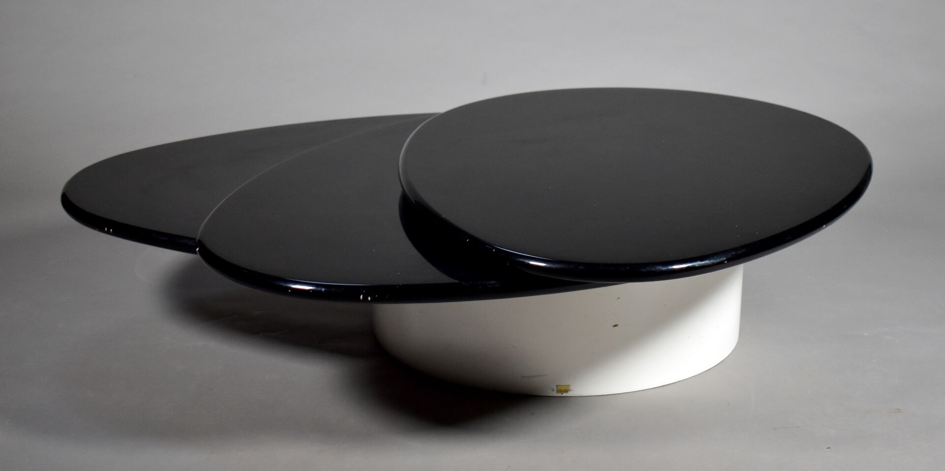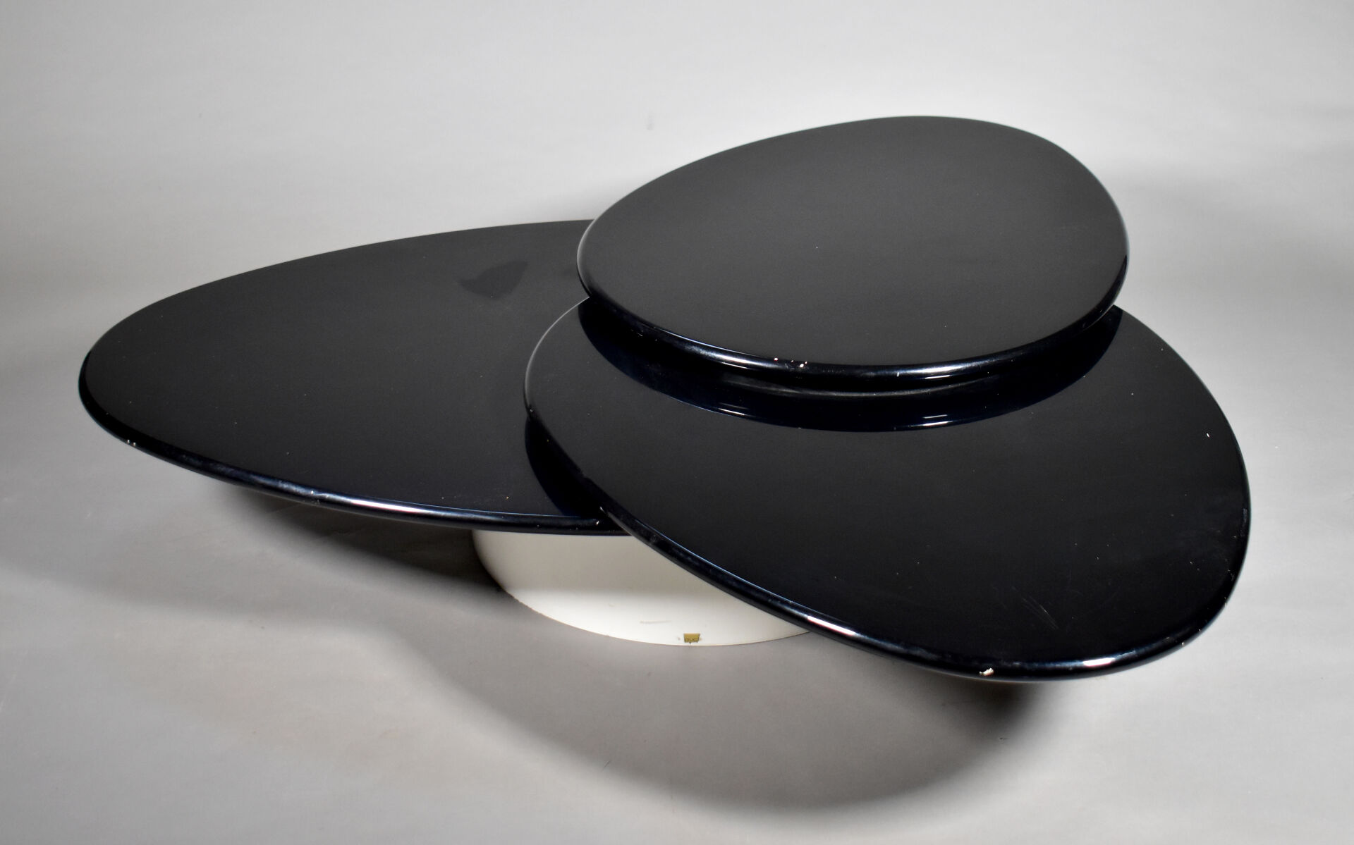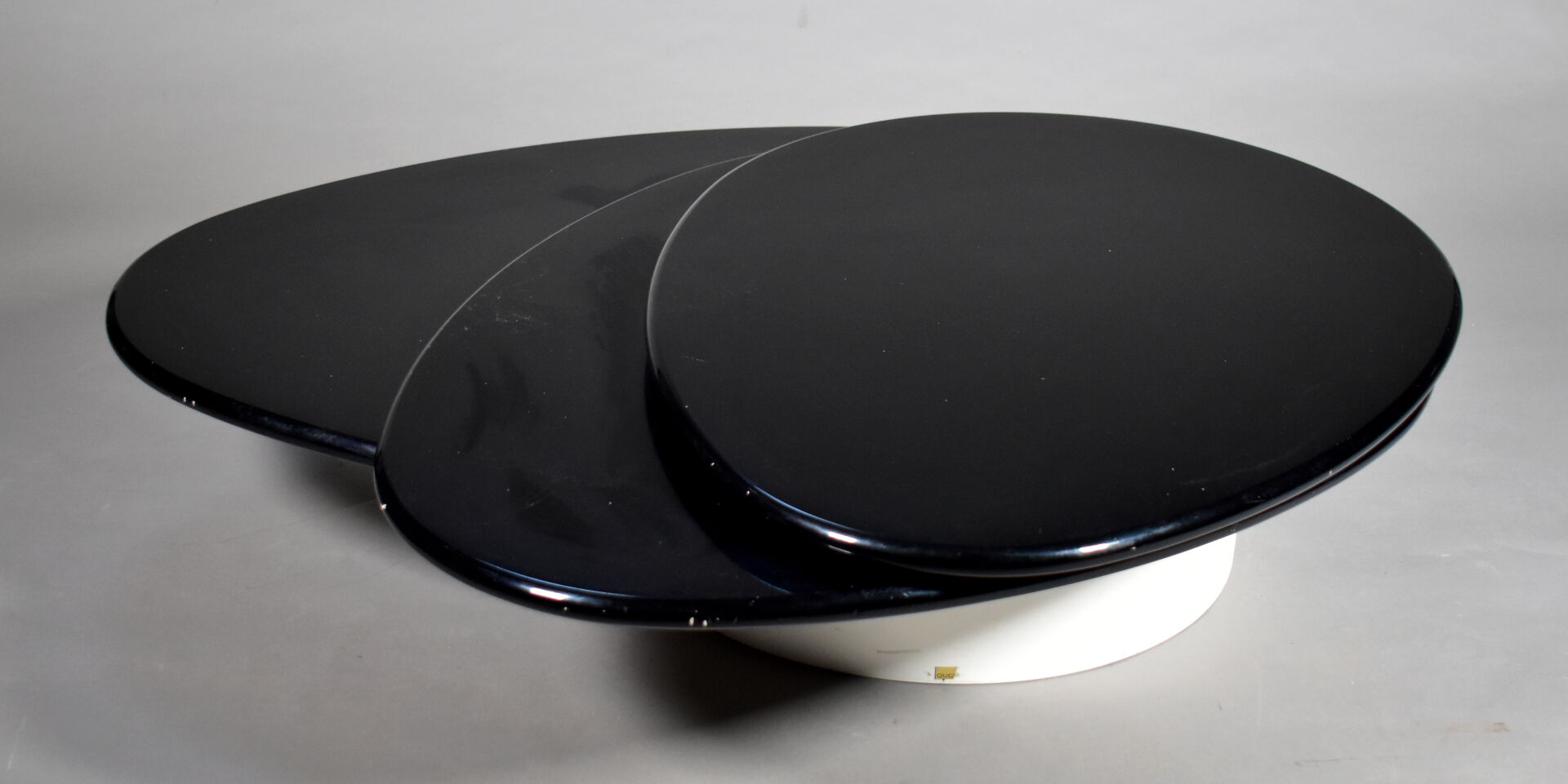 Table basse à triple plateau de forme goute en aggloméré, résine et bois laqué noir et blanc (rayures, petits enfoncements, sauts de laque). Travail des années 1990. Dim. fermées : Haut. : 35 cm – Larg. : 130 cm – Prof. : 88 cm.