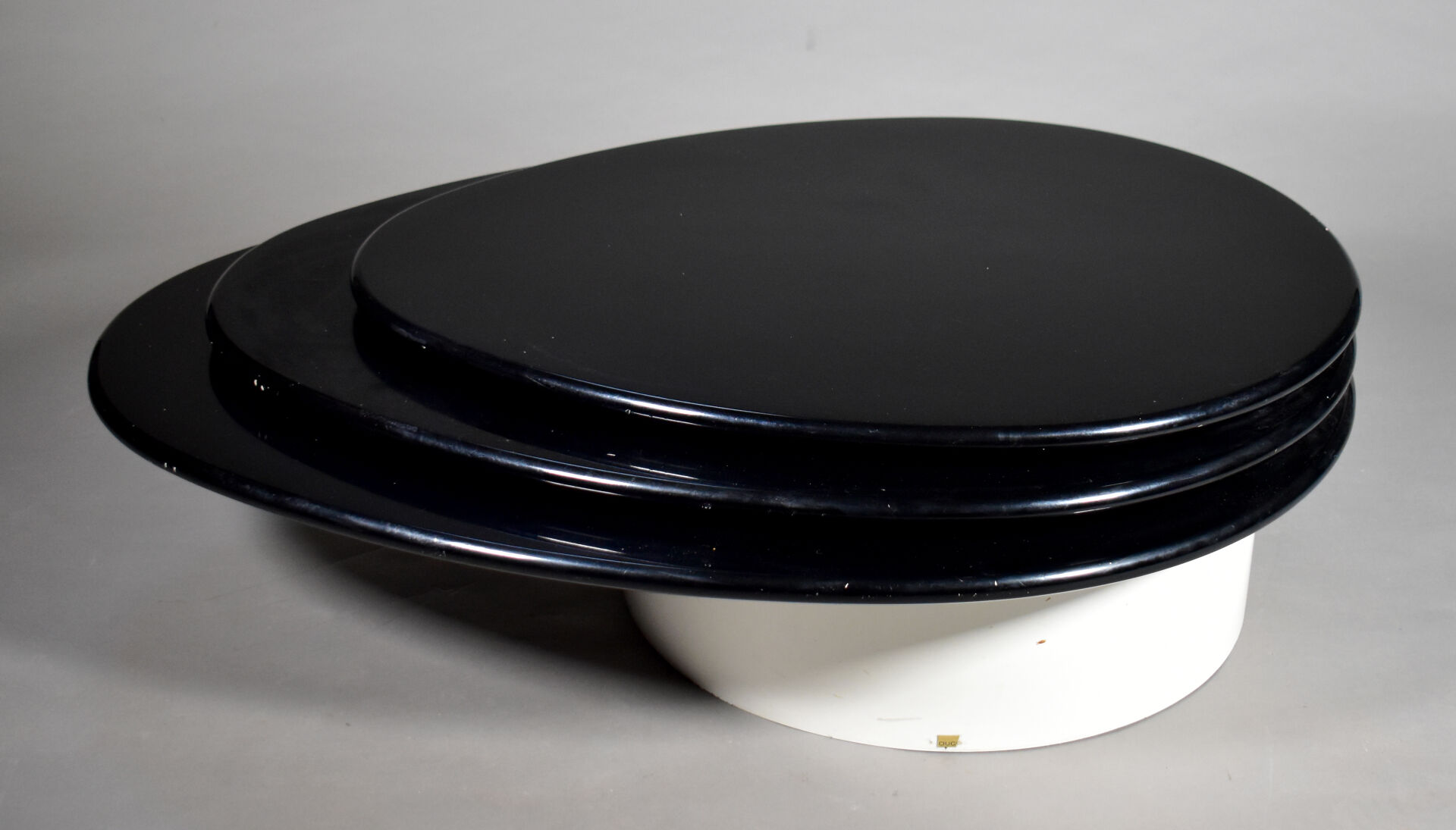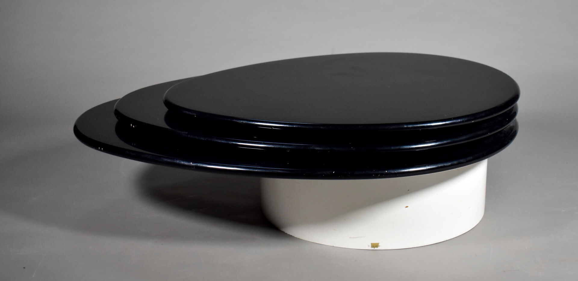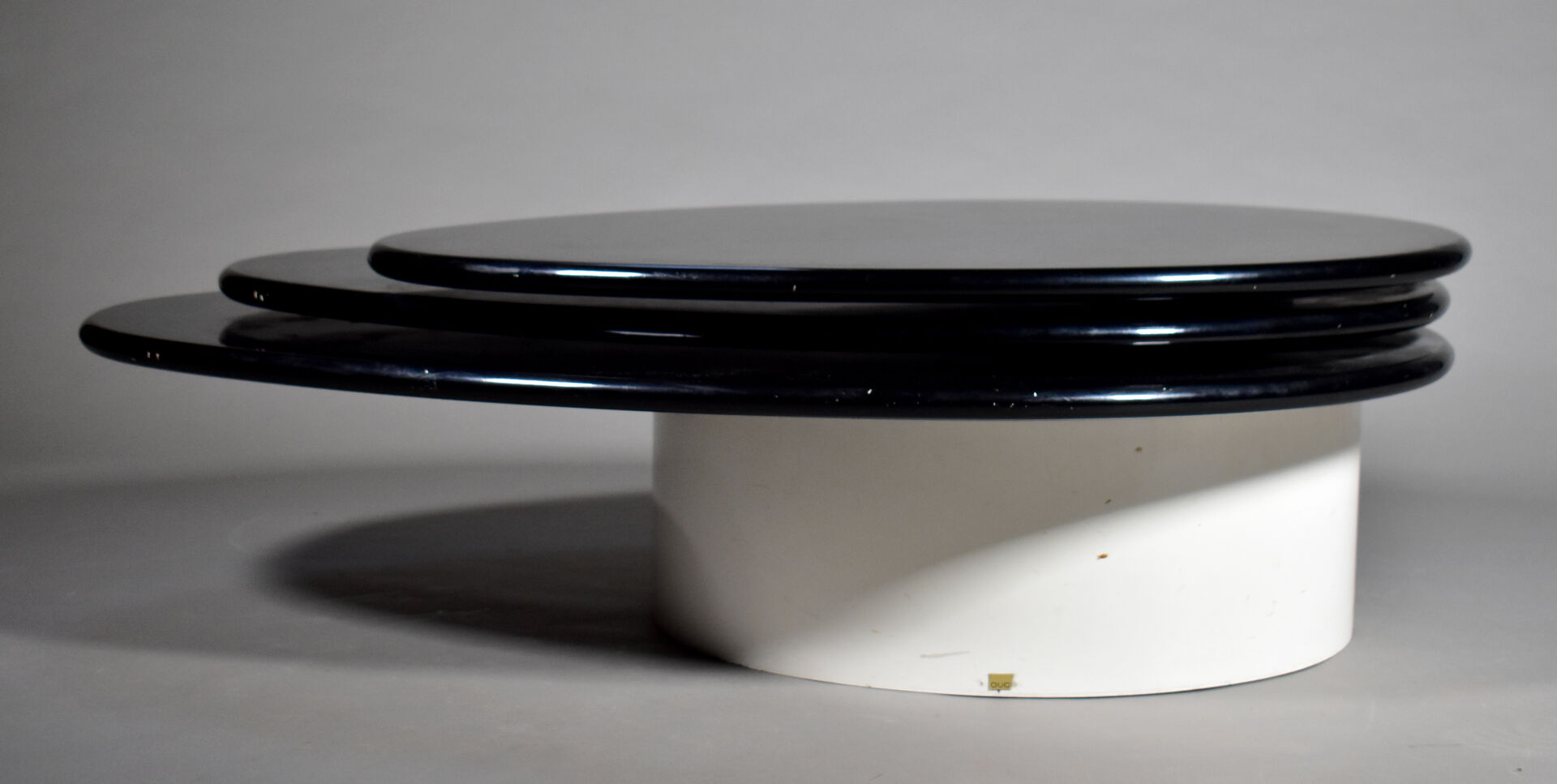 Table basse à triple plateau de forme goute en aggloméré, résine et bois laqué noir et blanc (rayures, petits enfoncements, sauts de laque). Travail des années 1990. Dim. fermées : Haut. : 35 cm – Larg. : 130 cm – Prof. : 88 cm.
