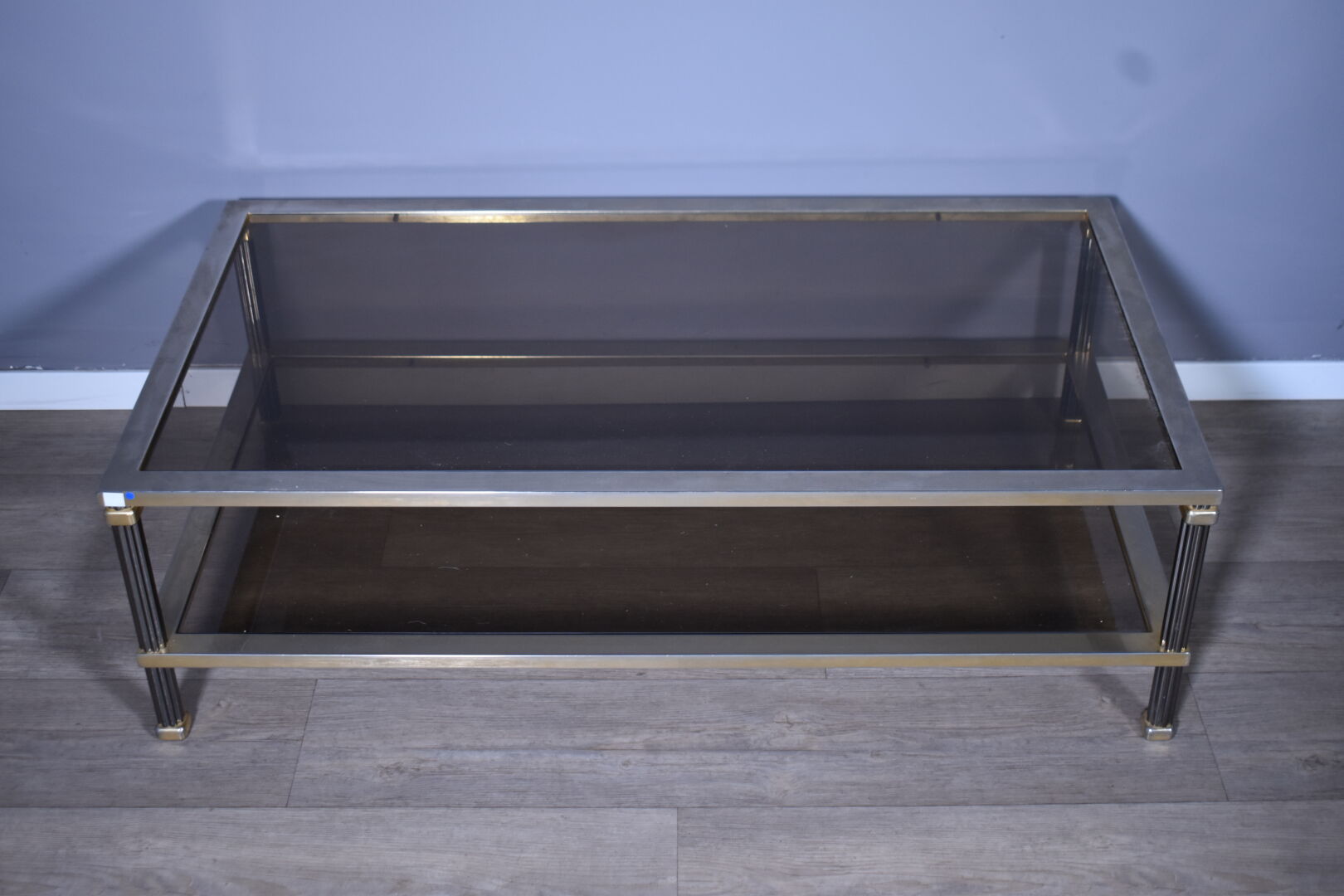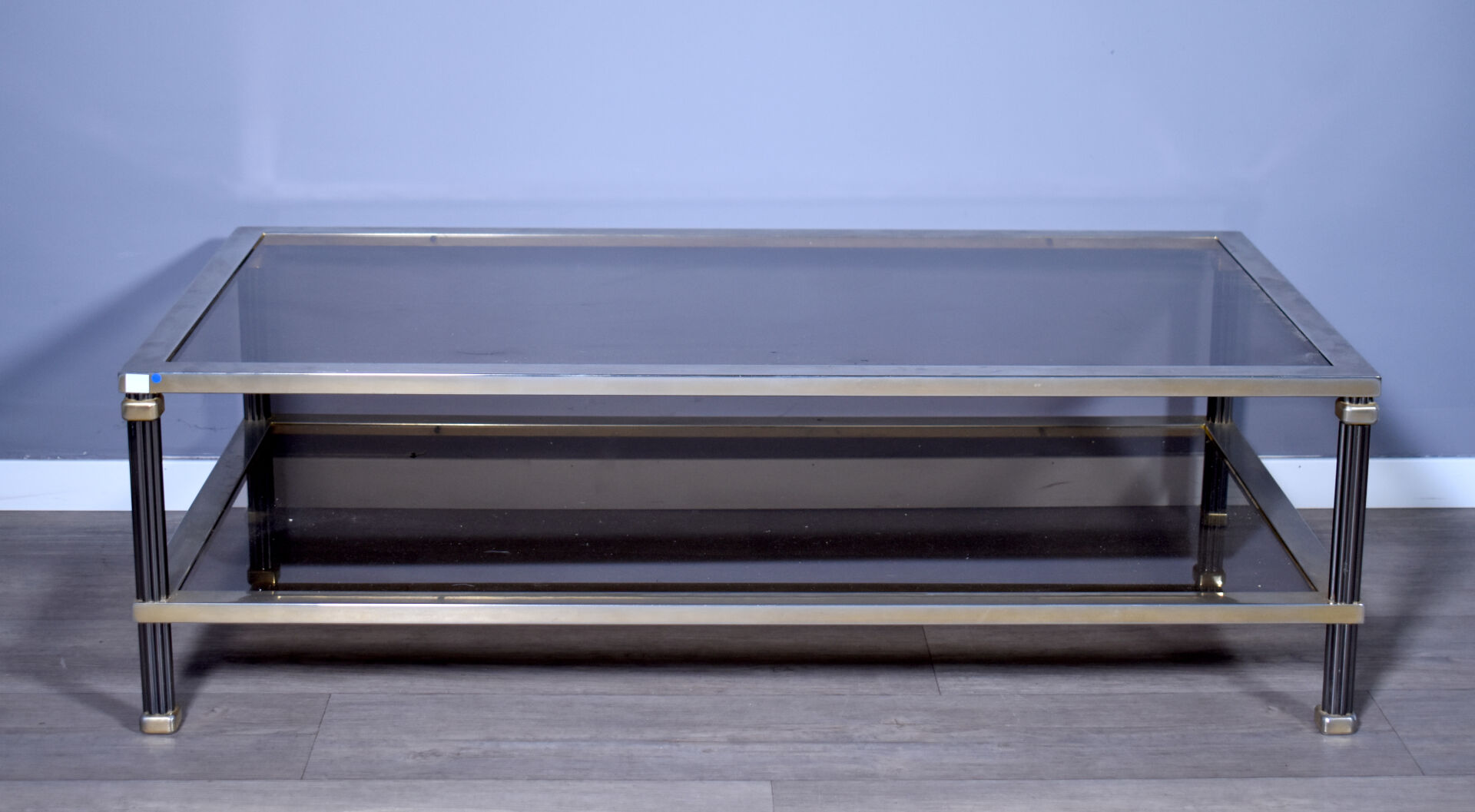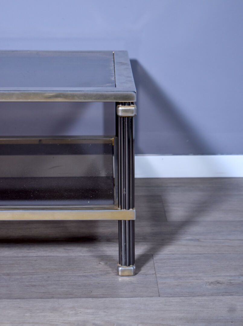Table basse en métal anciennement doré, les montant à colonnes godronnées, double plateau de verre fumé (un petit éclat dans un angle). Travail des années 1970/1980. Haut. : 34,5 cm – Larg. : 112 cm – Prof. : 62 cm.