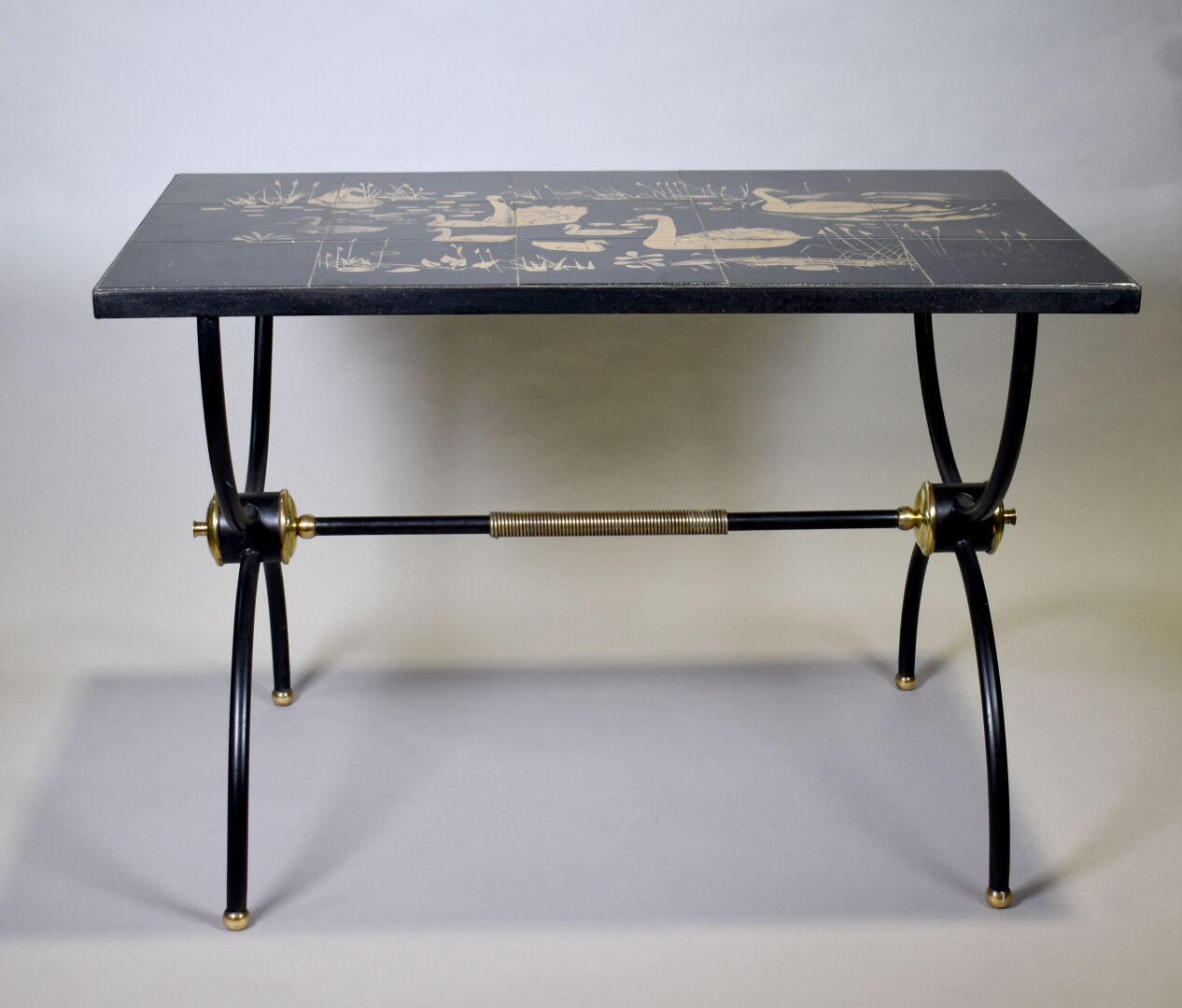 Table basse en métal laqué noir. Plateau à carreaux de céramique émaillée noir à décor en dorure de cygnes et des cygneaux (usures d’usage, un accidenté, rayures d’usage). Haut. : 52 cm – Larg. : 76 cm – Prof. : 46 cm.