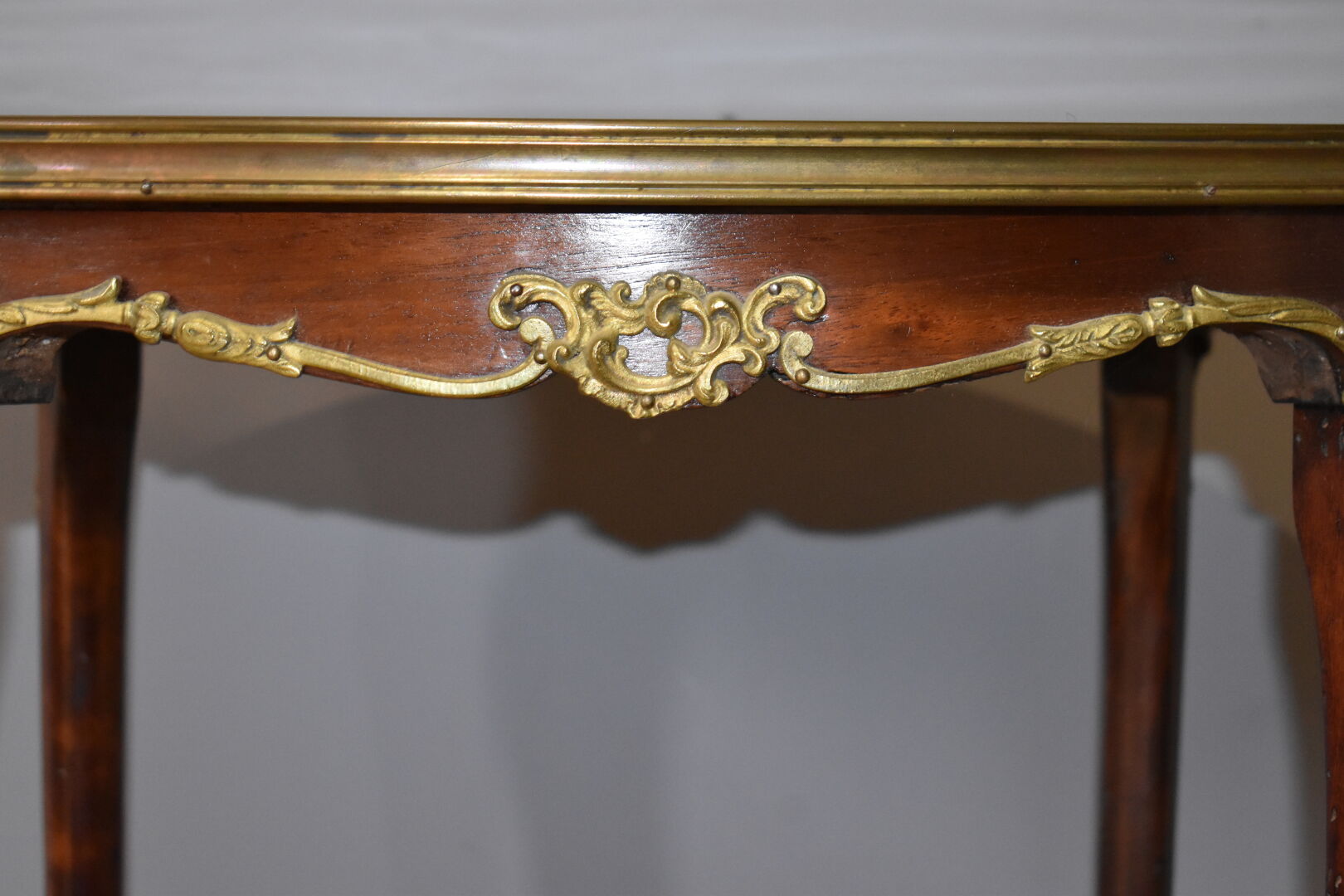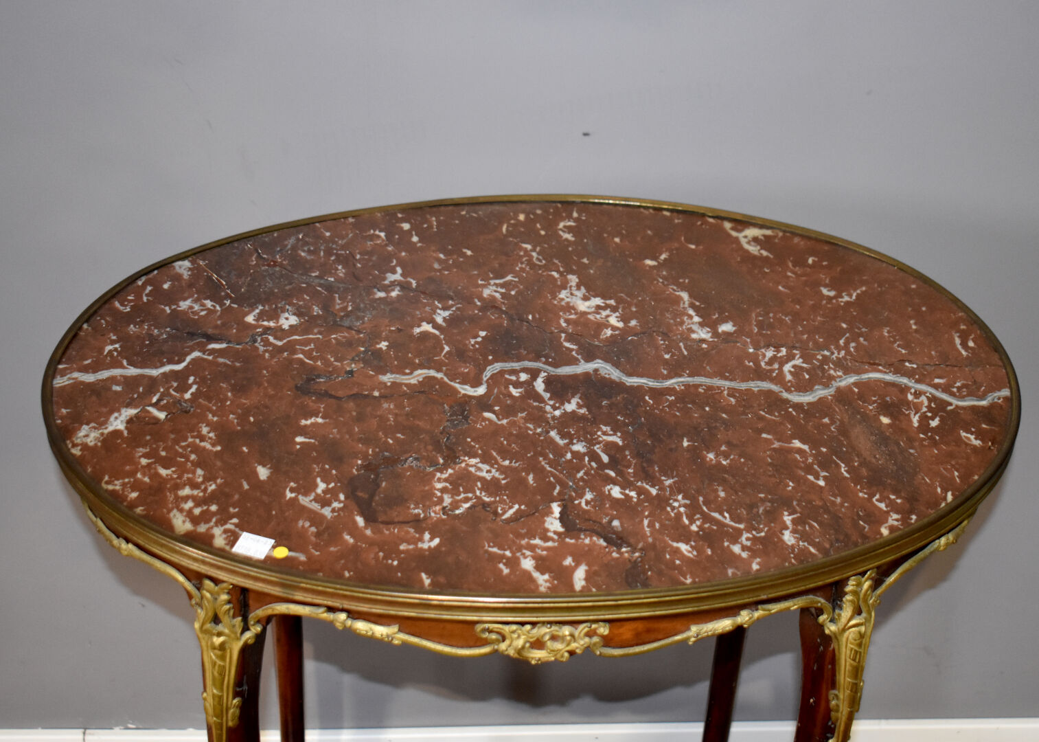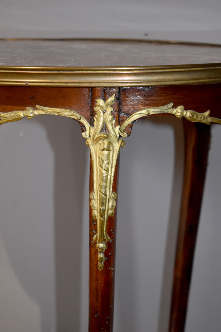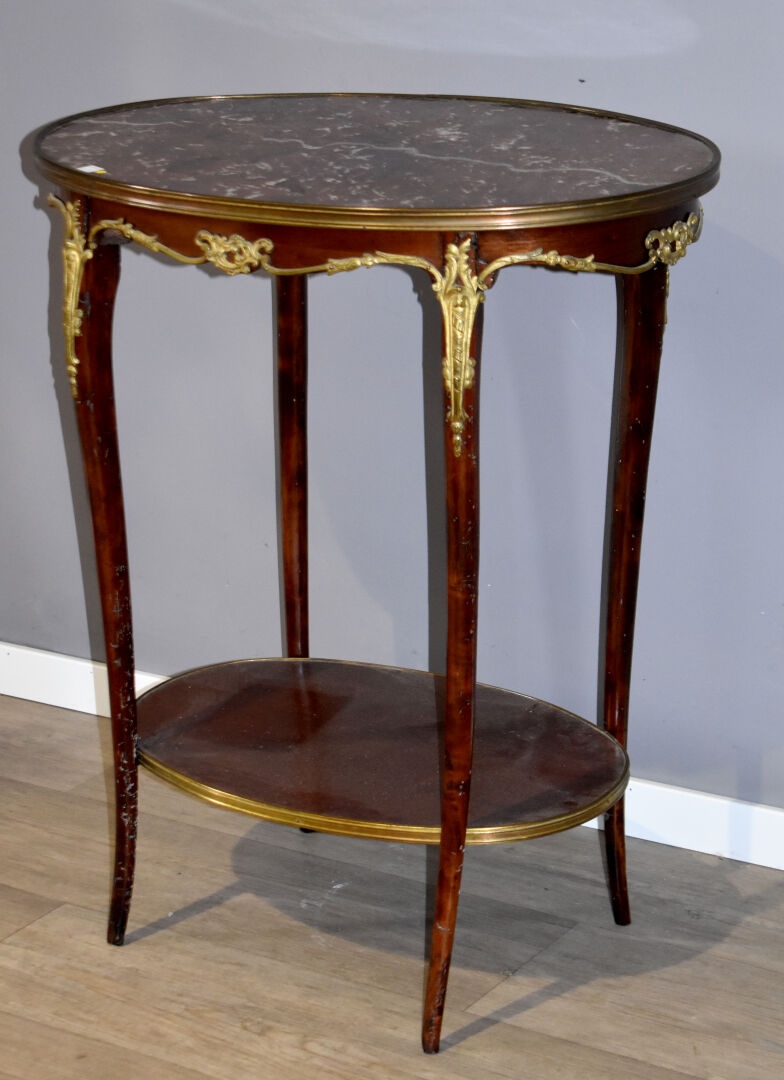 Table d’appoint en acajou et hêtre à double plateau ovale, le supérieur gainé de marbre rouge (traces d’insectes xylophages). Epoque Napoléon III. Haut. : 74,5 cm – Larg. : 64 cm – Prof. : 42 cm.