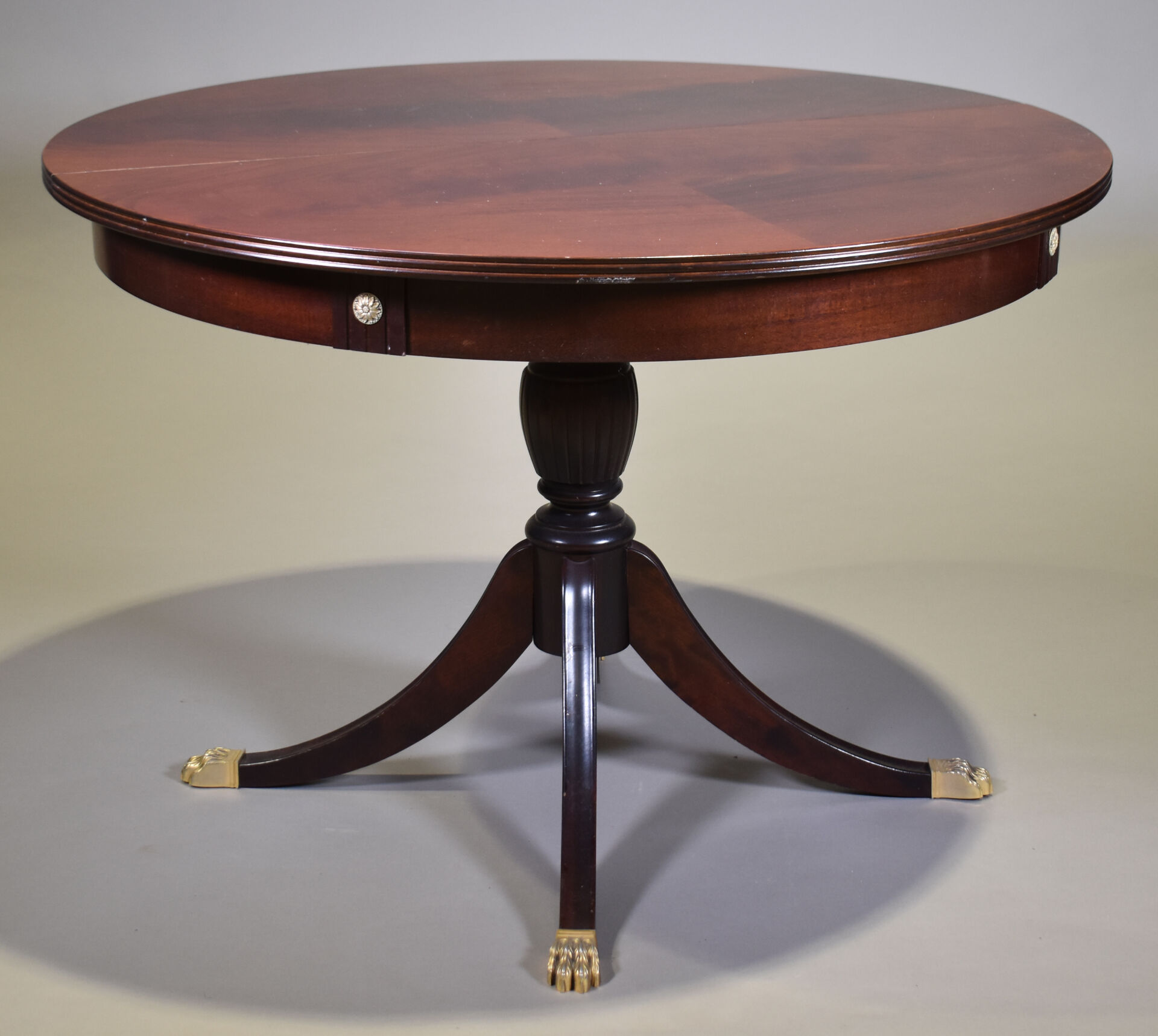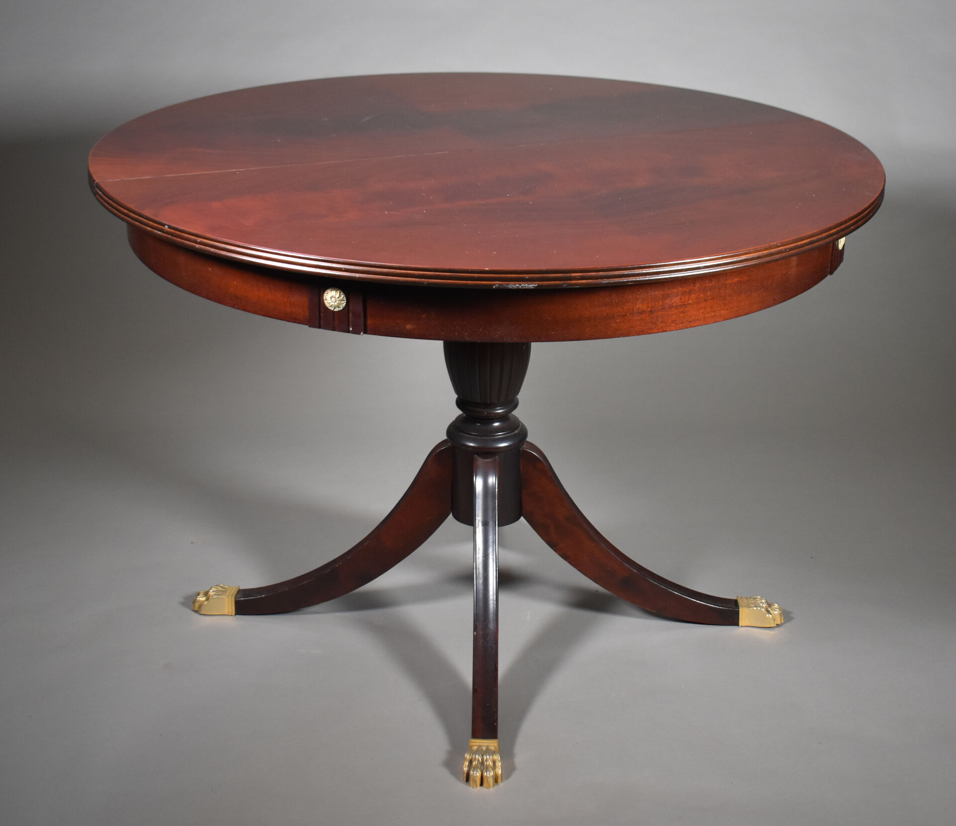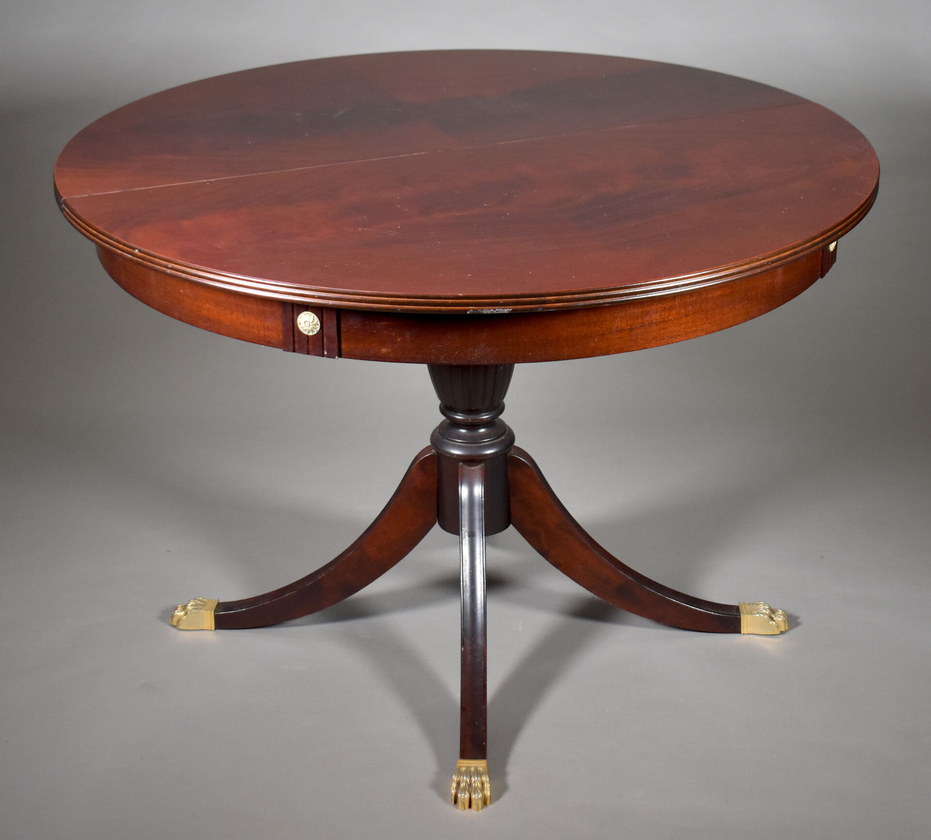 Table en acajou et placage d’acajou à plateau circulaire. Le fût central reposant sur quatre pieds terminés par des griffes en laiton (un saut de placage). Style Empire, XXe siècle. Haut. : 74,5 cm – Diam. : 109 cm.