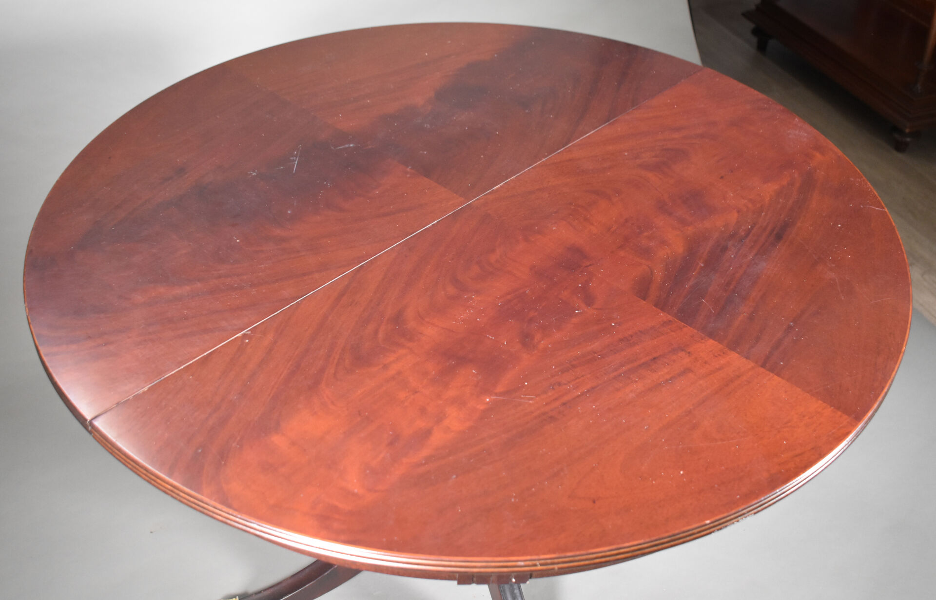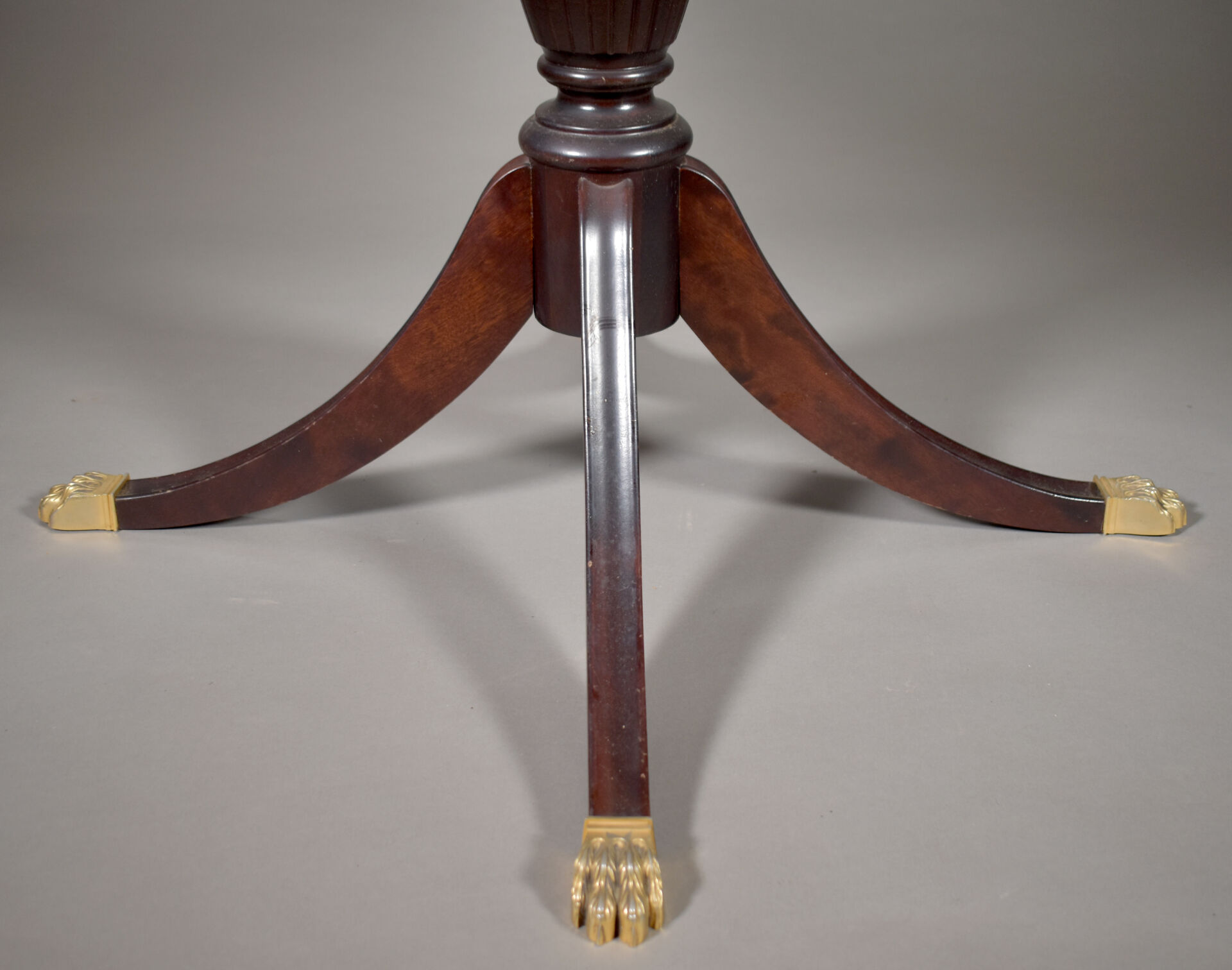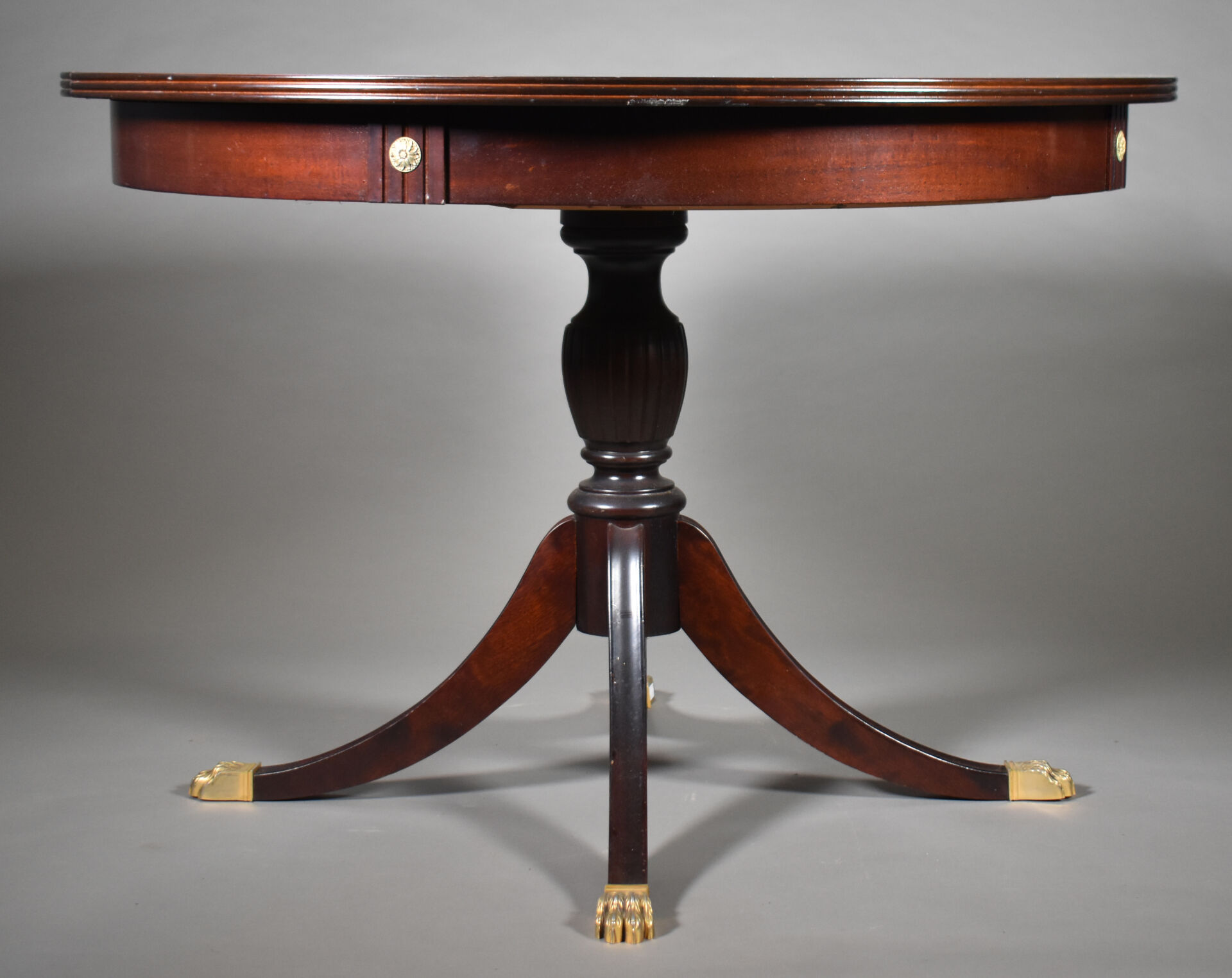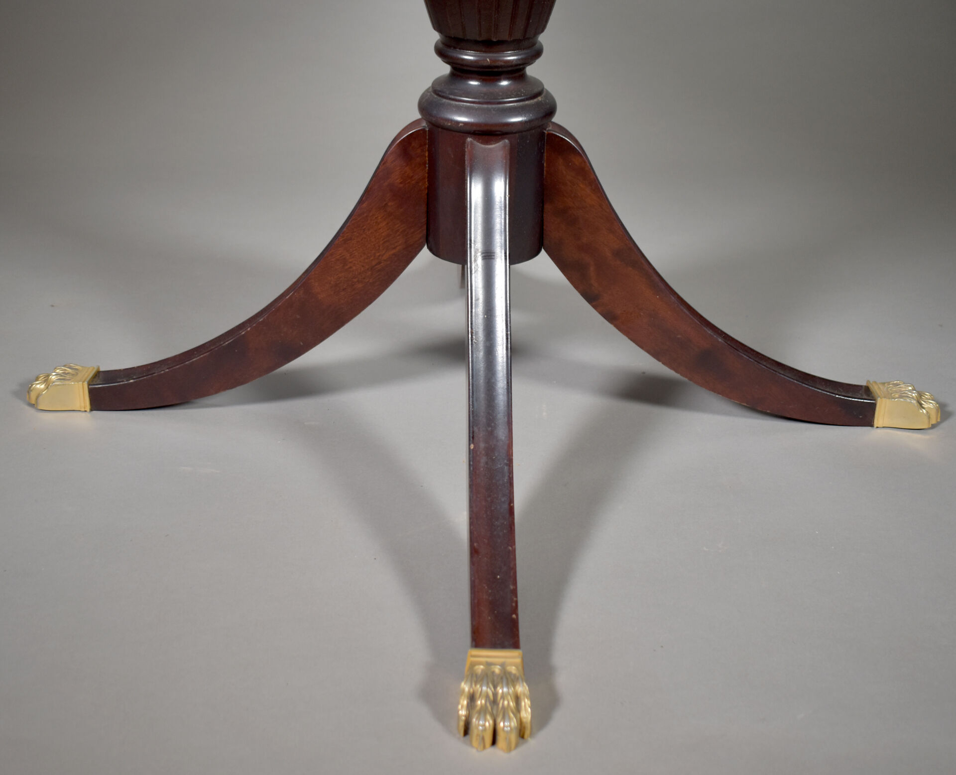 Table en acajou et placage d’acajou à plateau circulaire. Le fût central reposant sur quatre pieds terminés par des griffes en laiton (un saut de placage). Style Empire, XXe siècle. Haut. : 74,5 cm – Diam. : 109 cm.