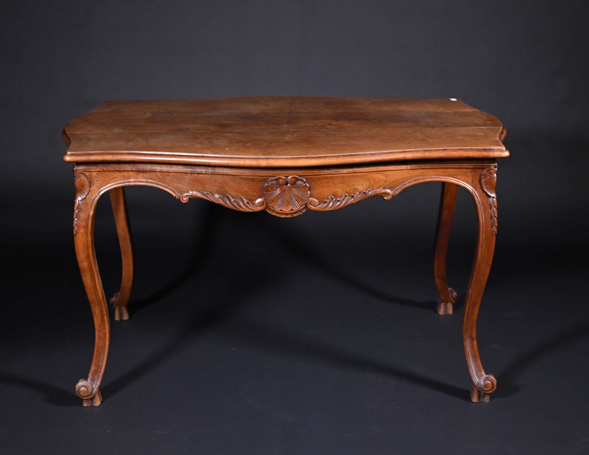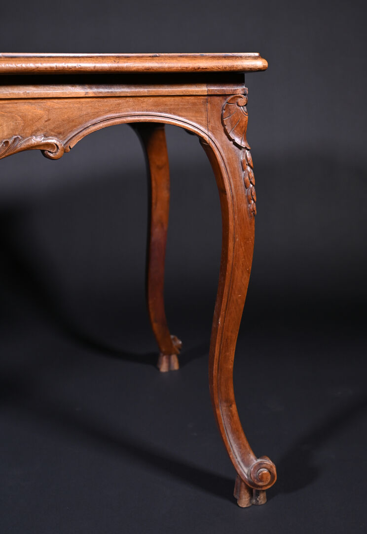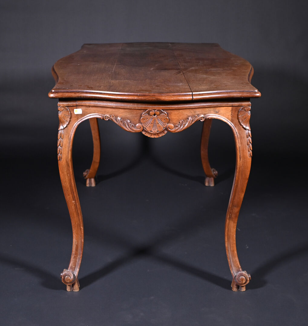 Table en chêne et hêtre mouluré sculpté de coquilles à pieds galbés (usures d’usage, mouillures). Haut. : 73 cm – Larg. : 126 cm – Prof. : 81 cm.