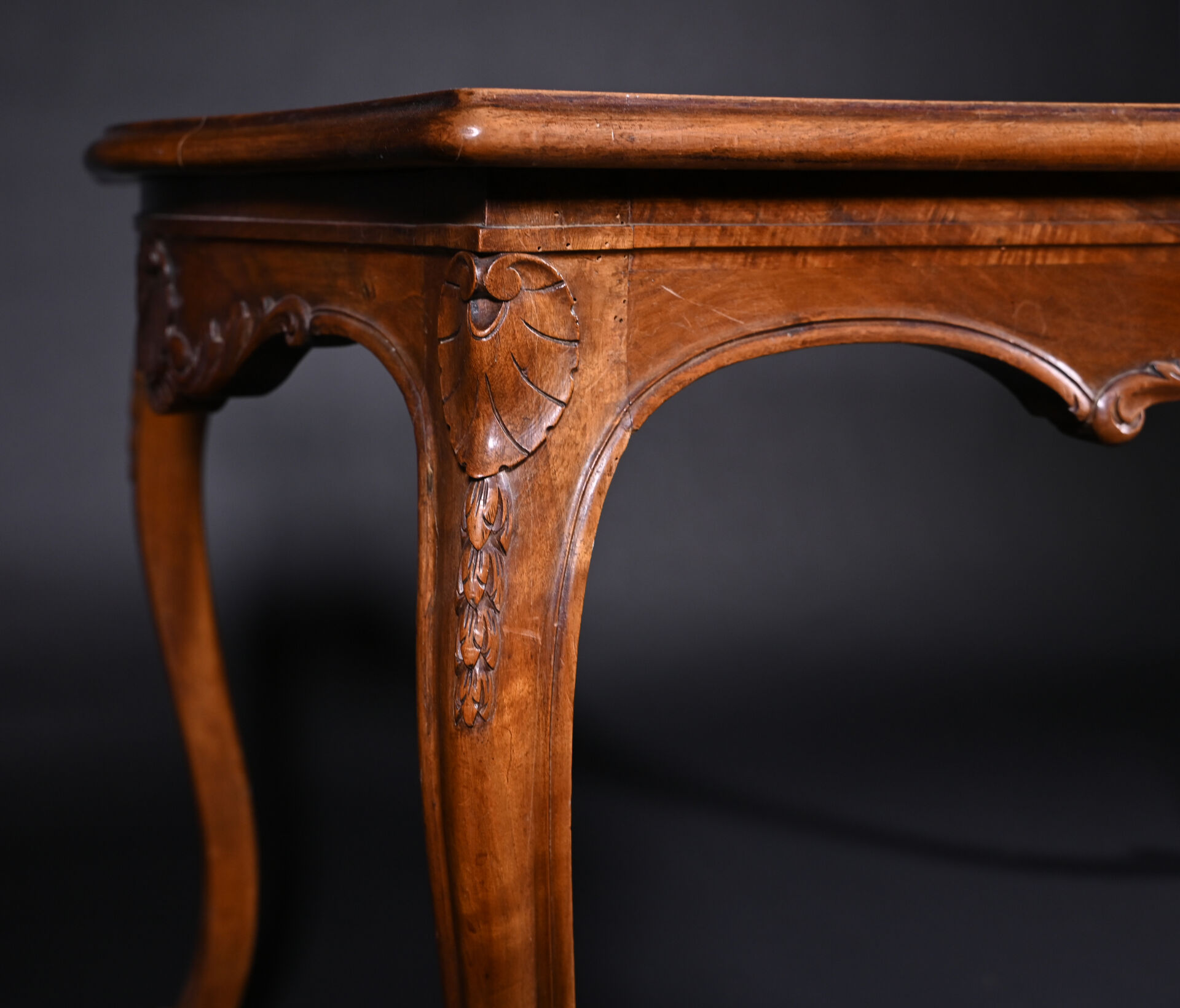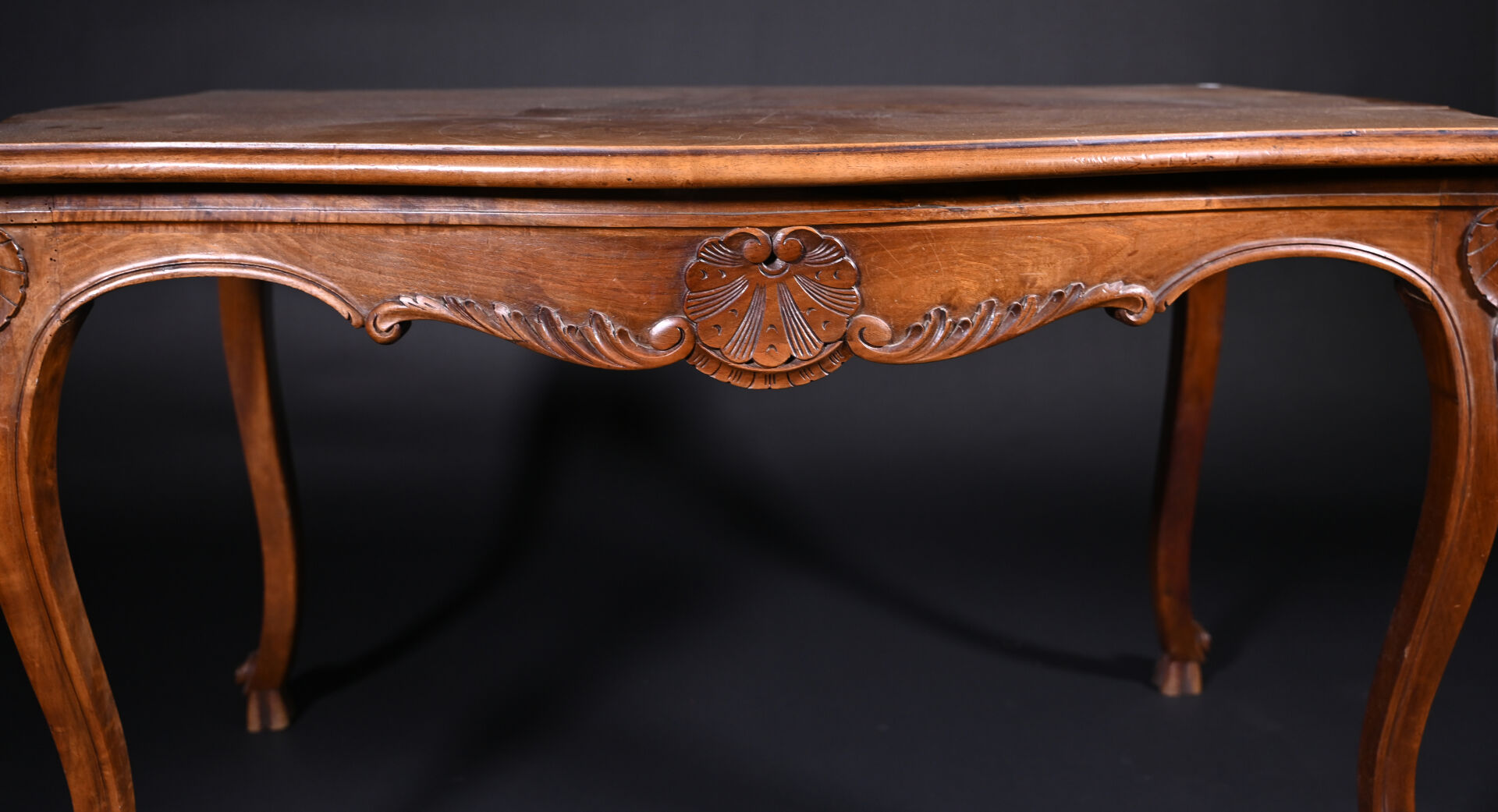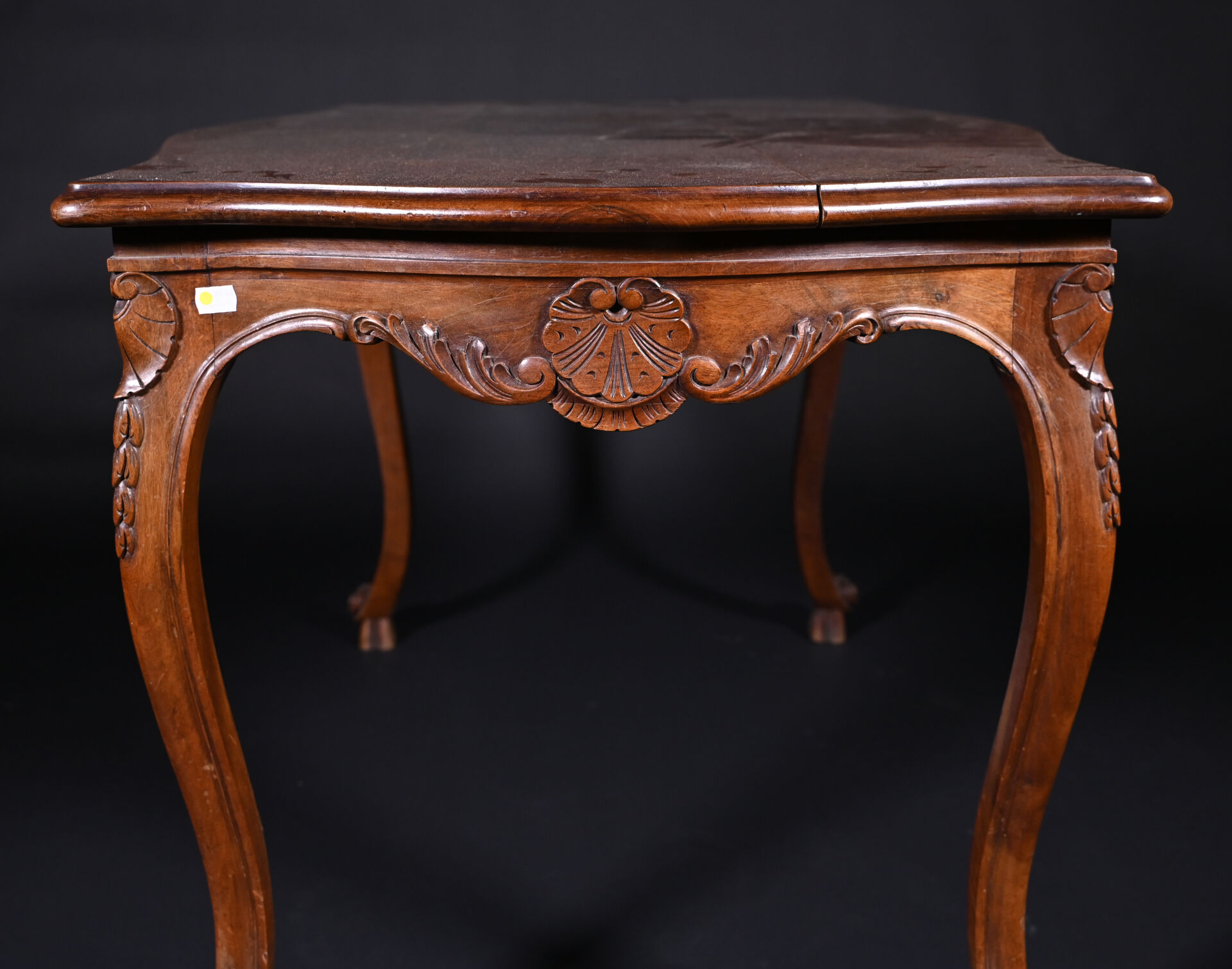 Table en chêne et hêtre mouluré sculpté de coquilles à pieds galbés (usures d’usage, mouillures). Haut. : 73 cm – Larg. : 126 cm – Prof. : 81 cm.