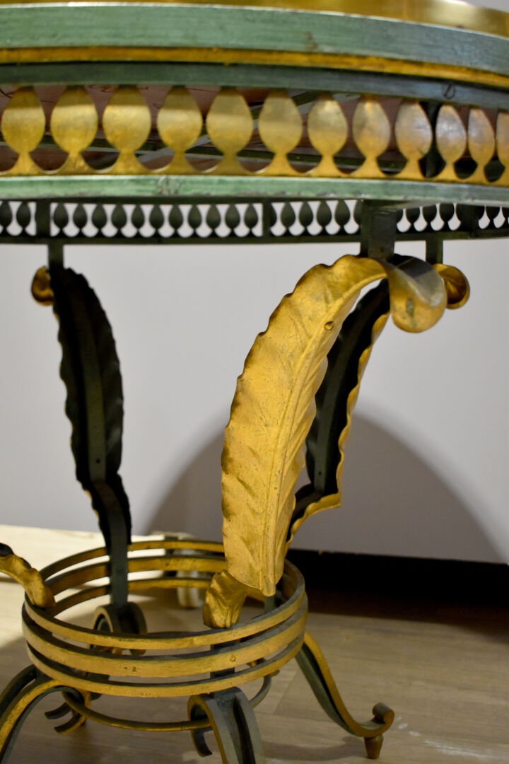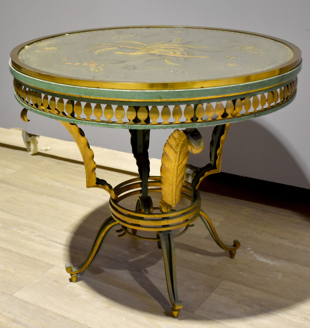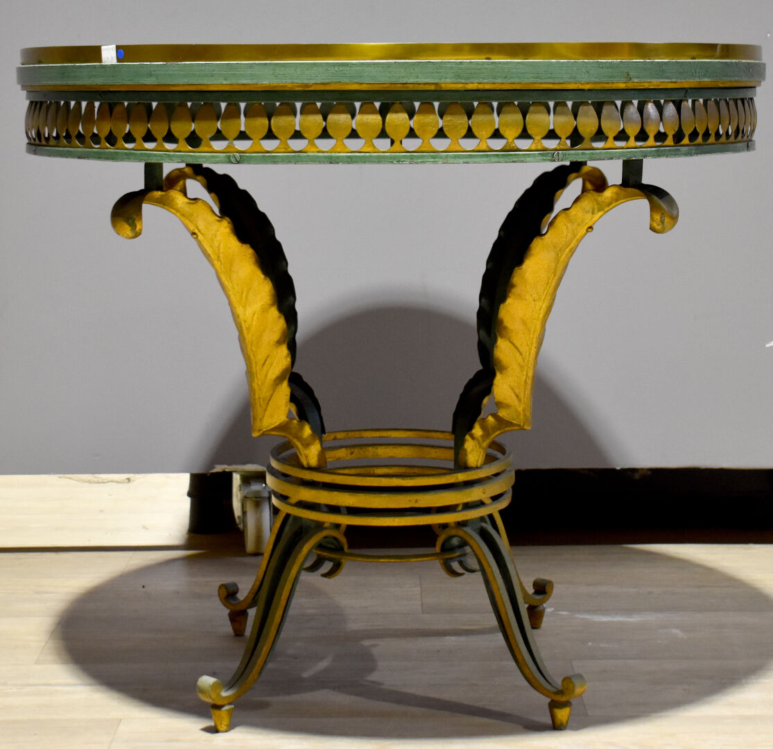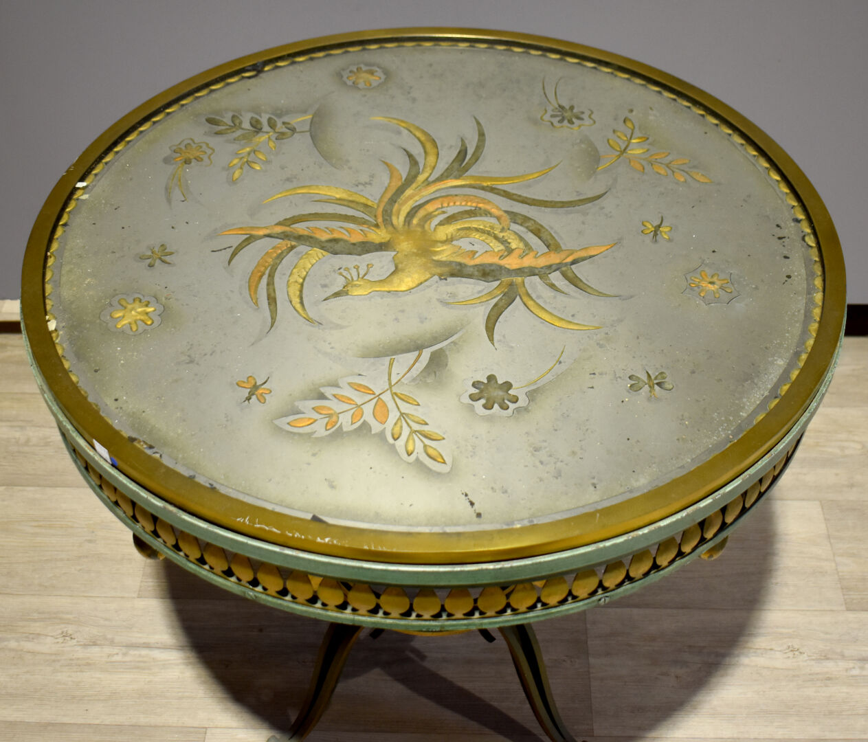 Table en fer et bronze laqués vert et or. La ceinture ajourée d’un motif de feuilles stylisées, elle repose sur quatre pieds en console. Plateau garni d’une glace à décor églomisé d’un phoenix (un éclat d’origine? . Vers 1940. Haut. : 71 cm – Diam. : 80 cm.