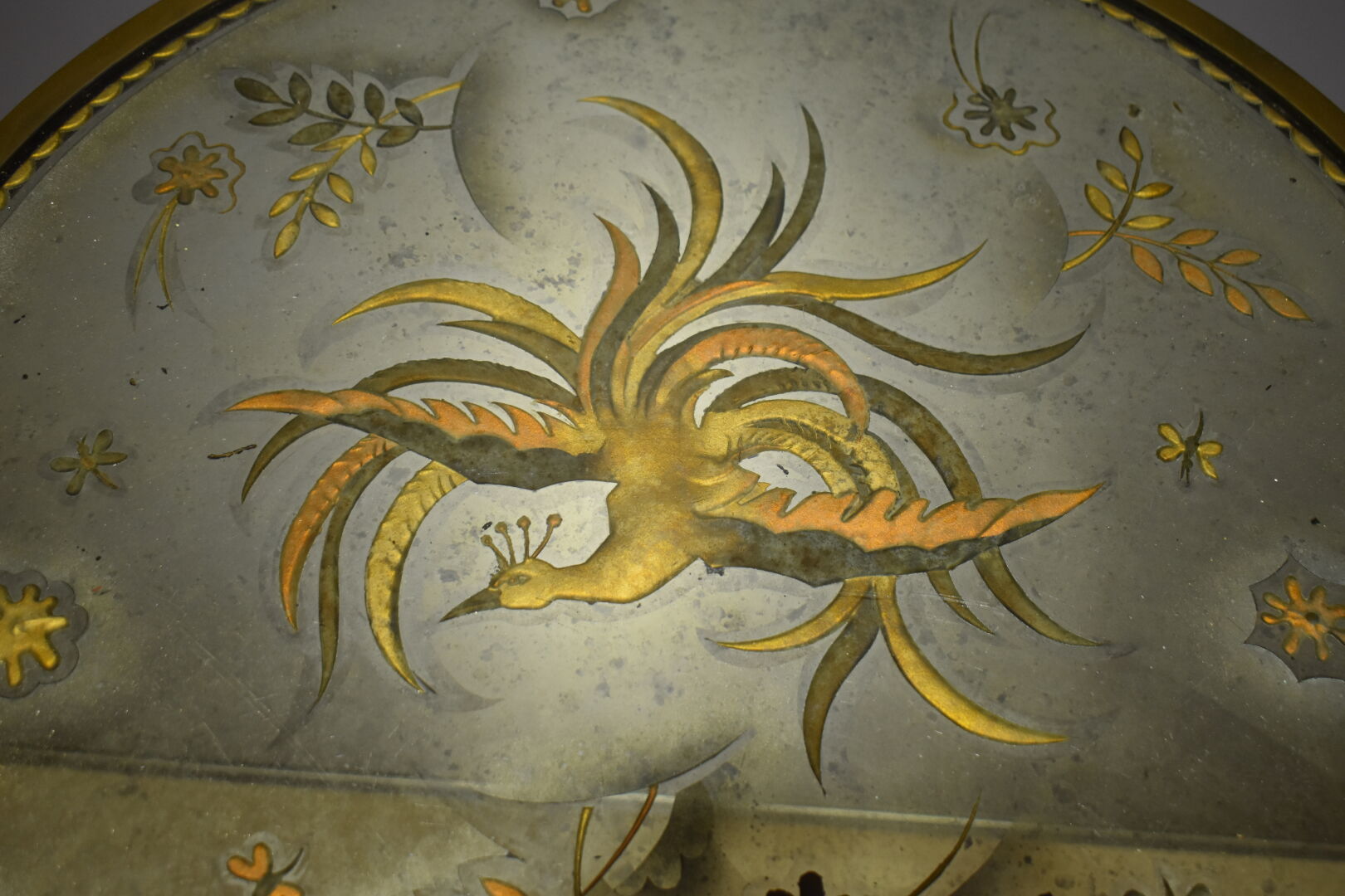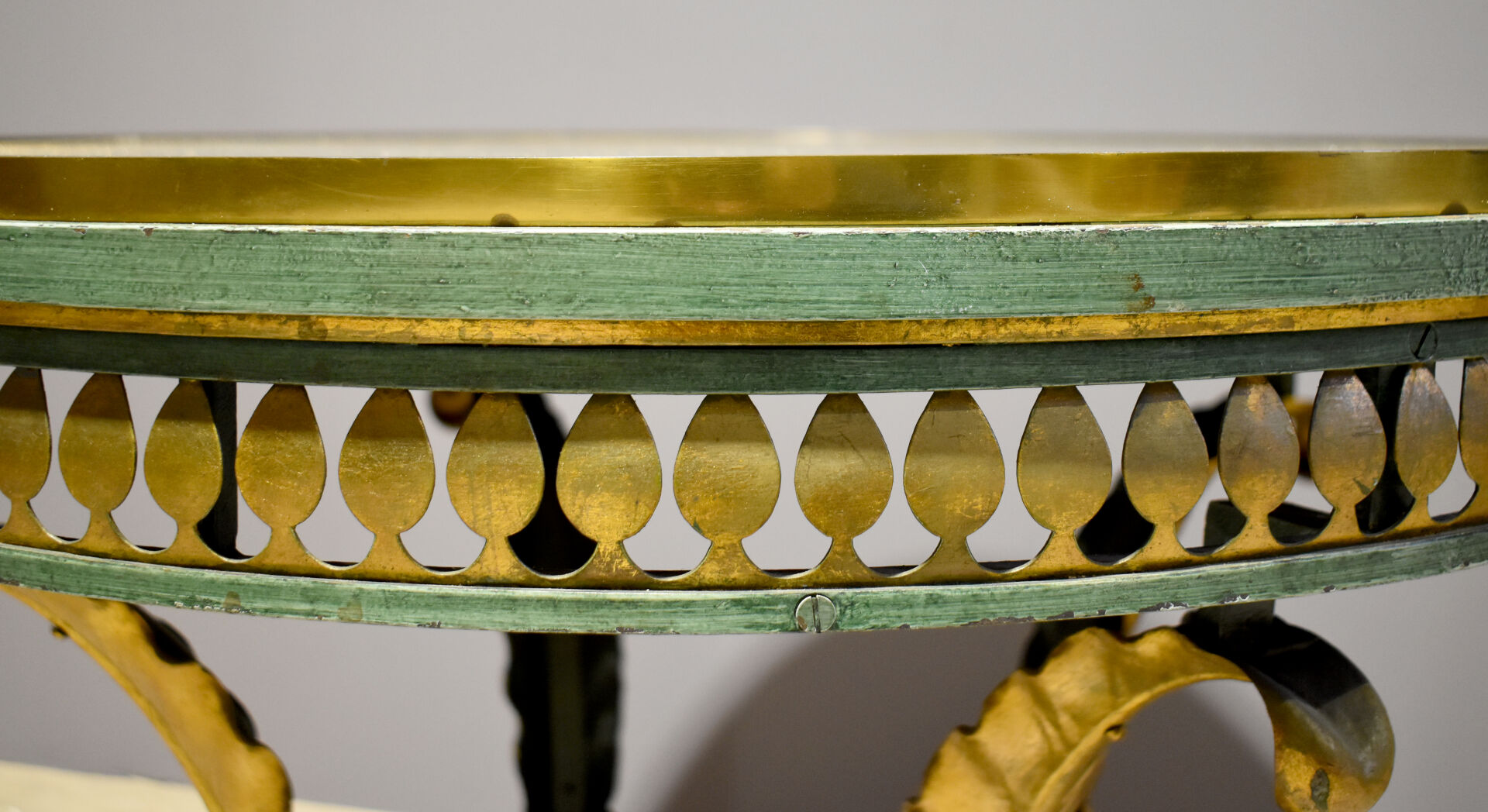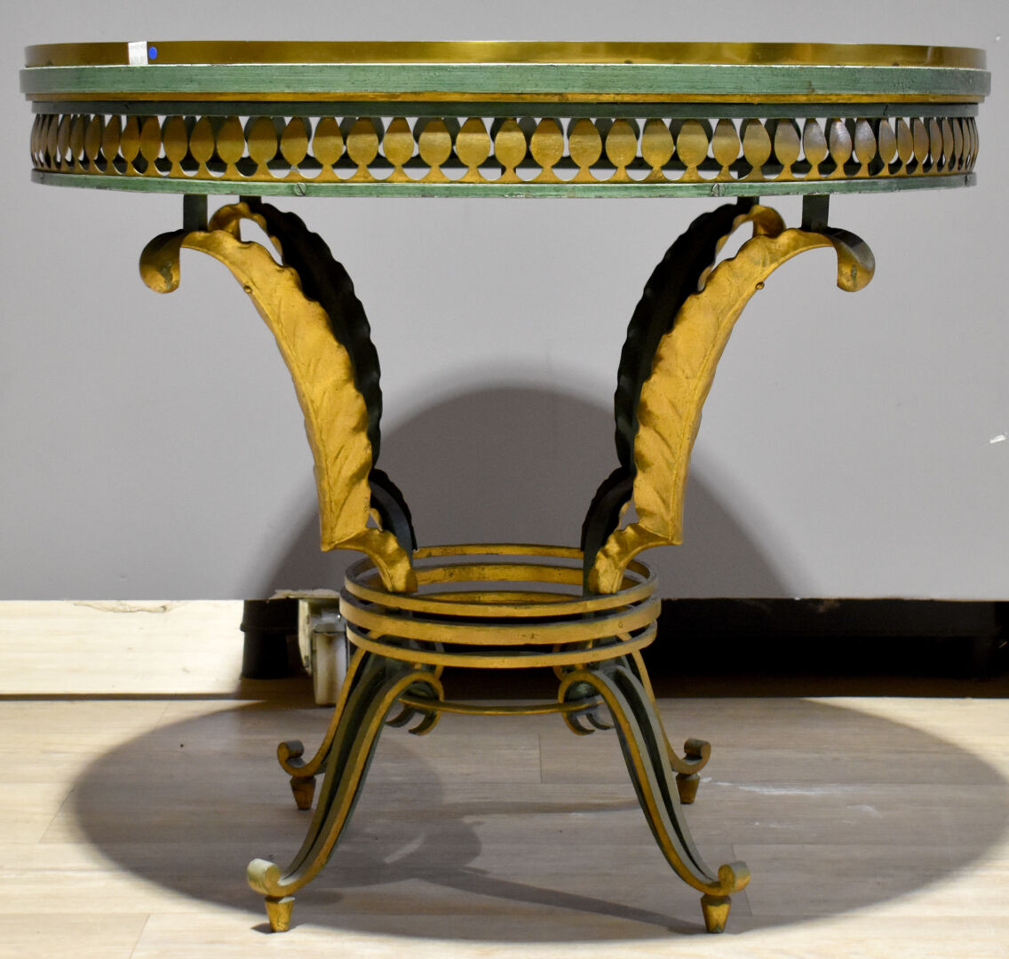 Table en fer et bronze laqués vert et or. La ceinture ajourée d’un motif de feuilles stylisées, elle repose sur quatre pieds en console. Plateau garni d’une glace à décor églomisé d’un phoenix (un éclat d’origine? . Vers 1940. Haut. : 71 cm – Diam. : 80 cm.
