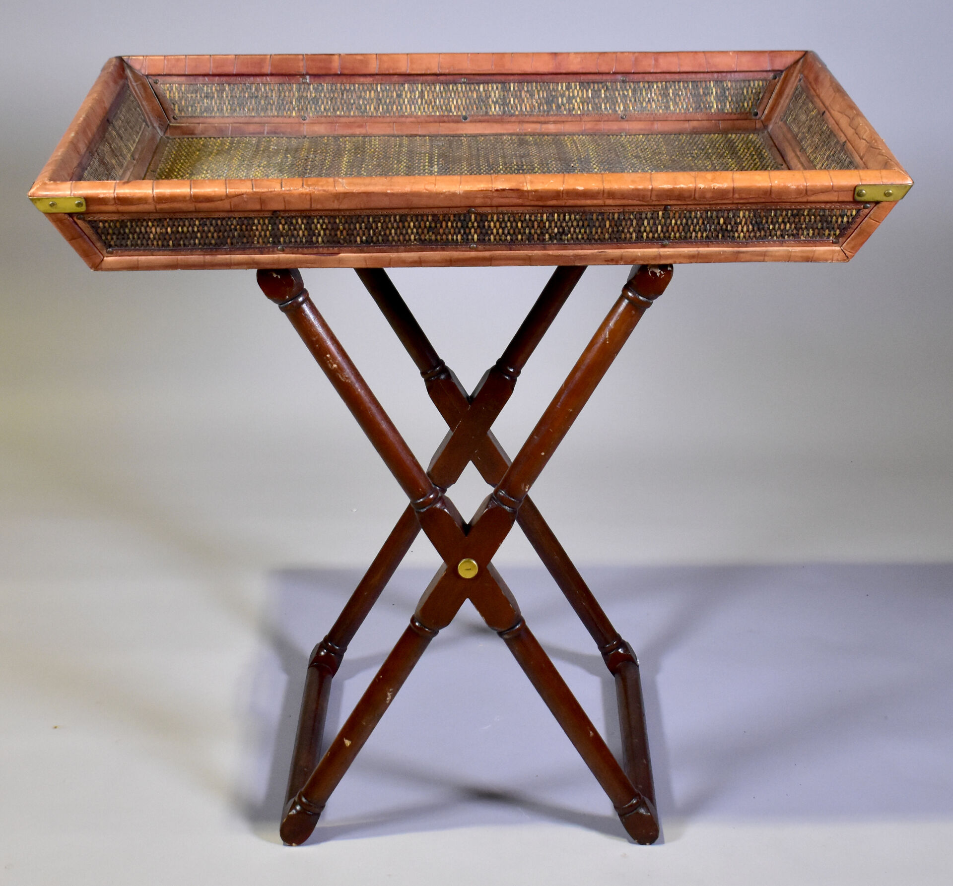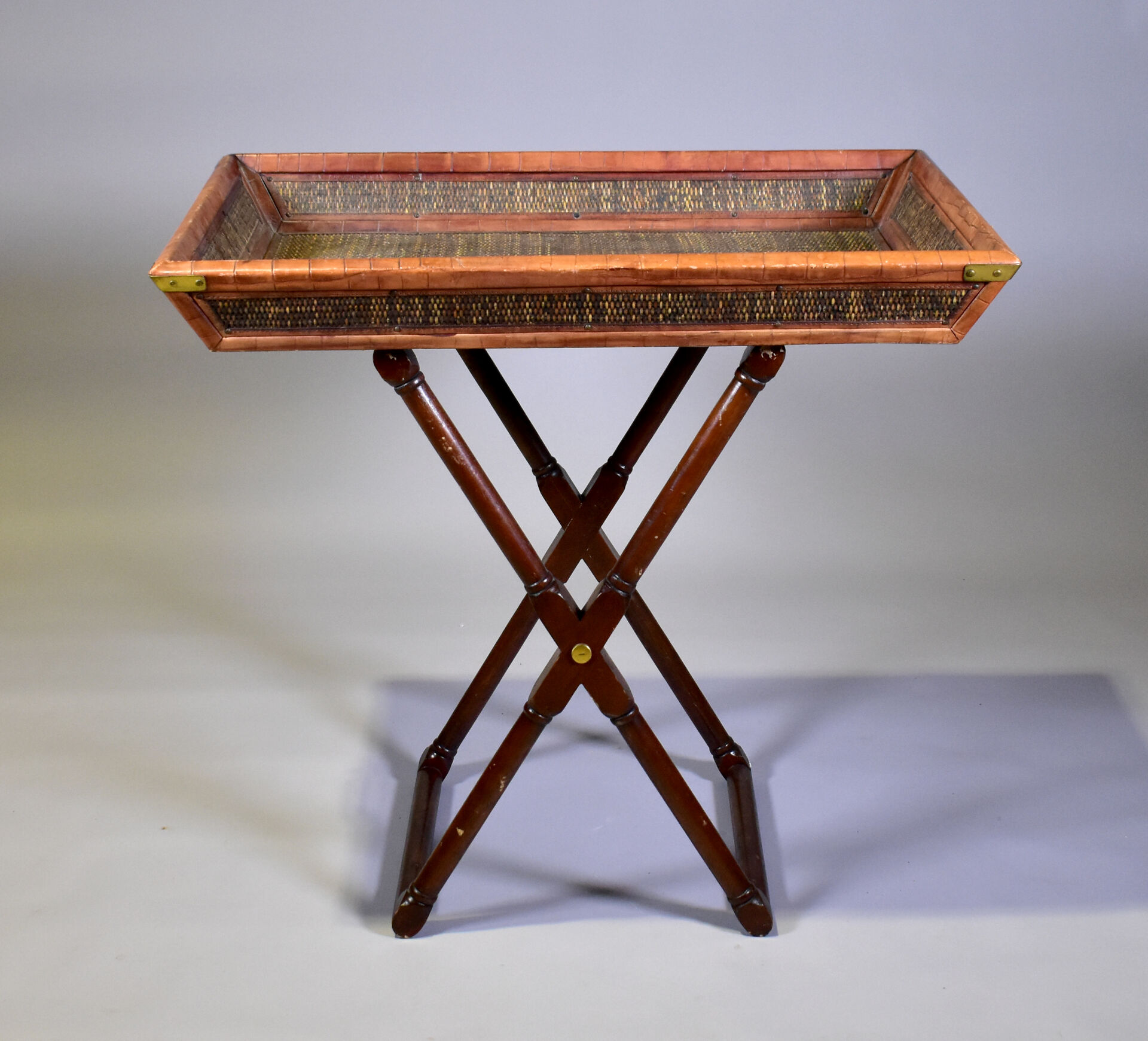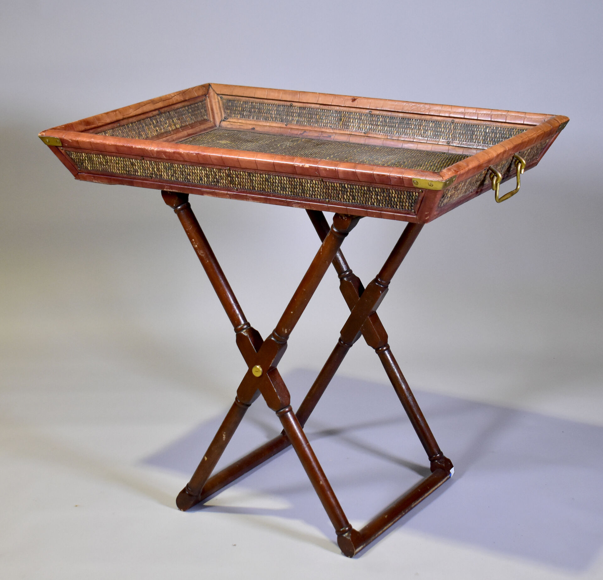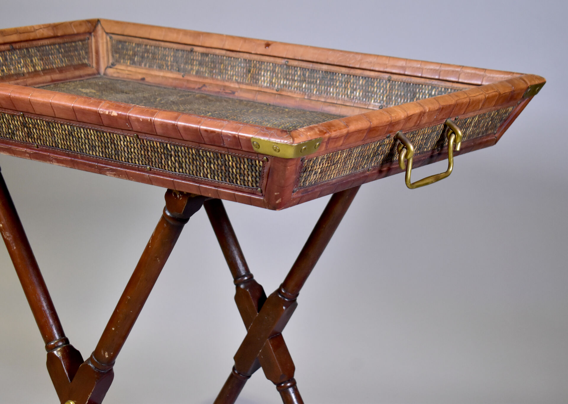 Table pliante à plateau en bois tressé gainé de cuir fauve et laiton (quelques usures). Piètement fixe. Travail probablement d’Asie du Sud-Est, milieu du XXe siècle. Dim. du plateau. : 94 x 64 cm. Haut. : 87 cm ou Haut. : 57 cm (avec piétement).