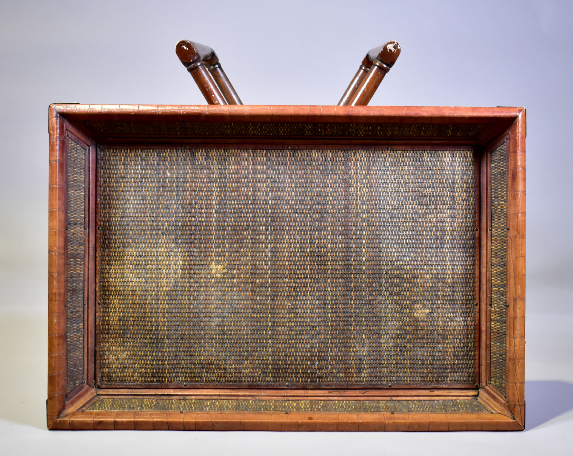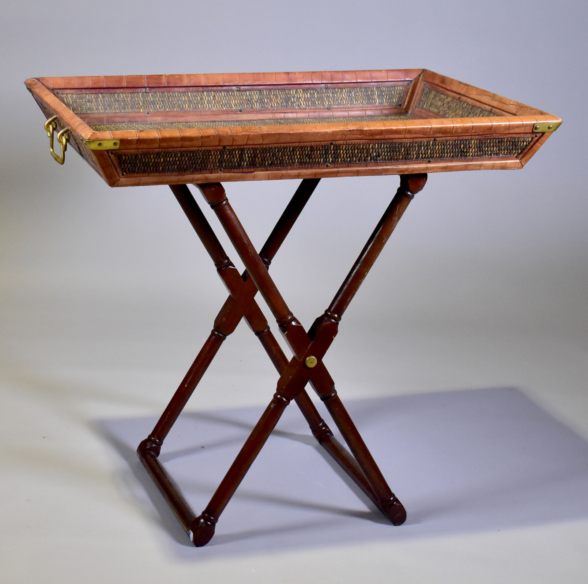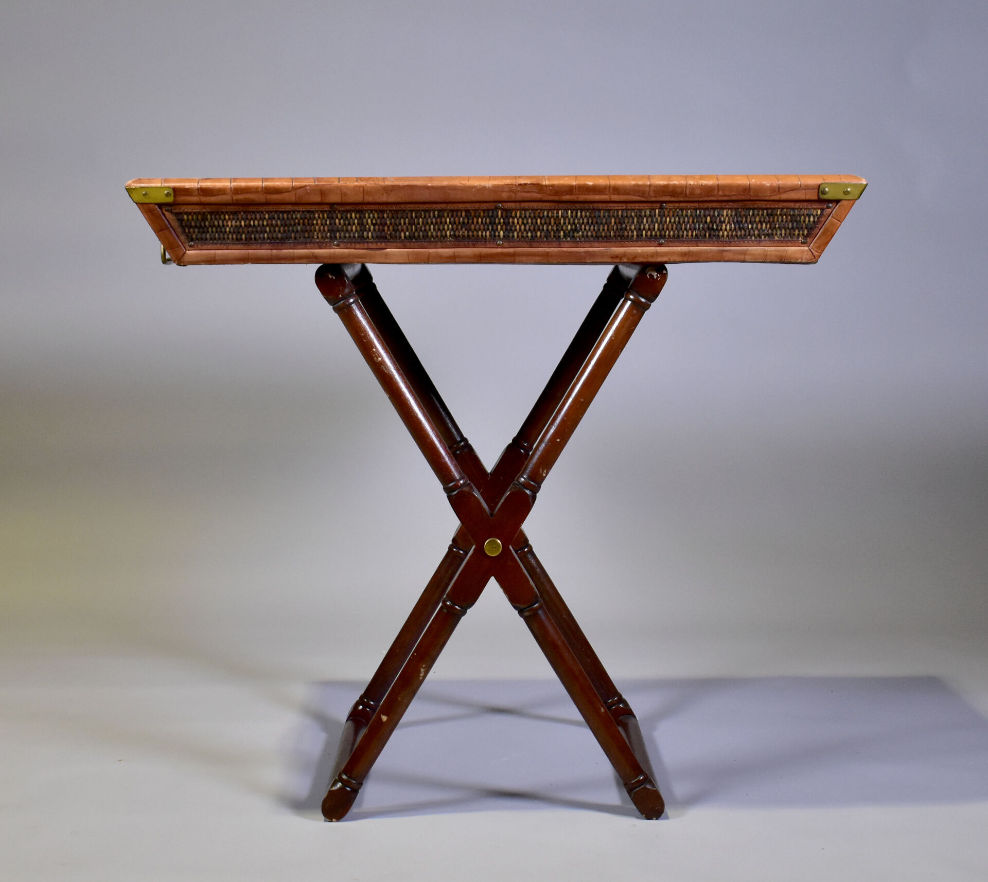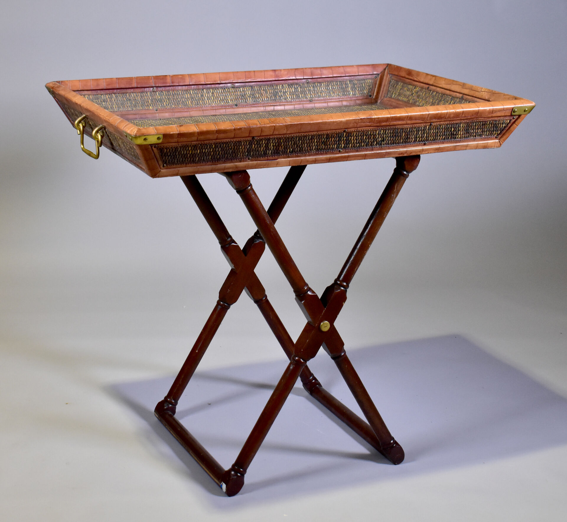 Table pliante à plateau en bois tressé gainé de cuir fauve et laiton (quelques usures). Piètement fixe. Travail probablement d’Asie du Sud-Est, milieu du XXe siècle. Dim. du plateau. : 94 x 64 cm. Haut. : 87 cm ou Haut. : 57 cm (avec piétement).