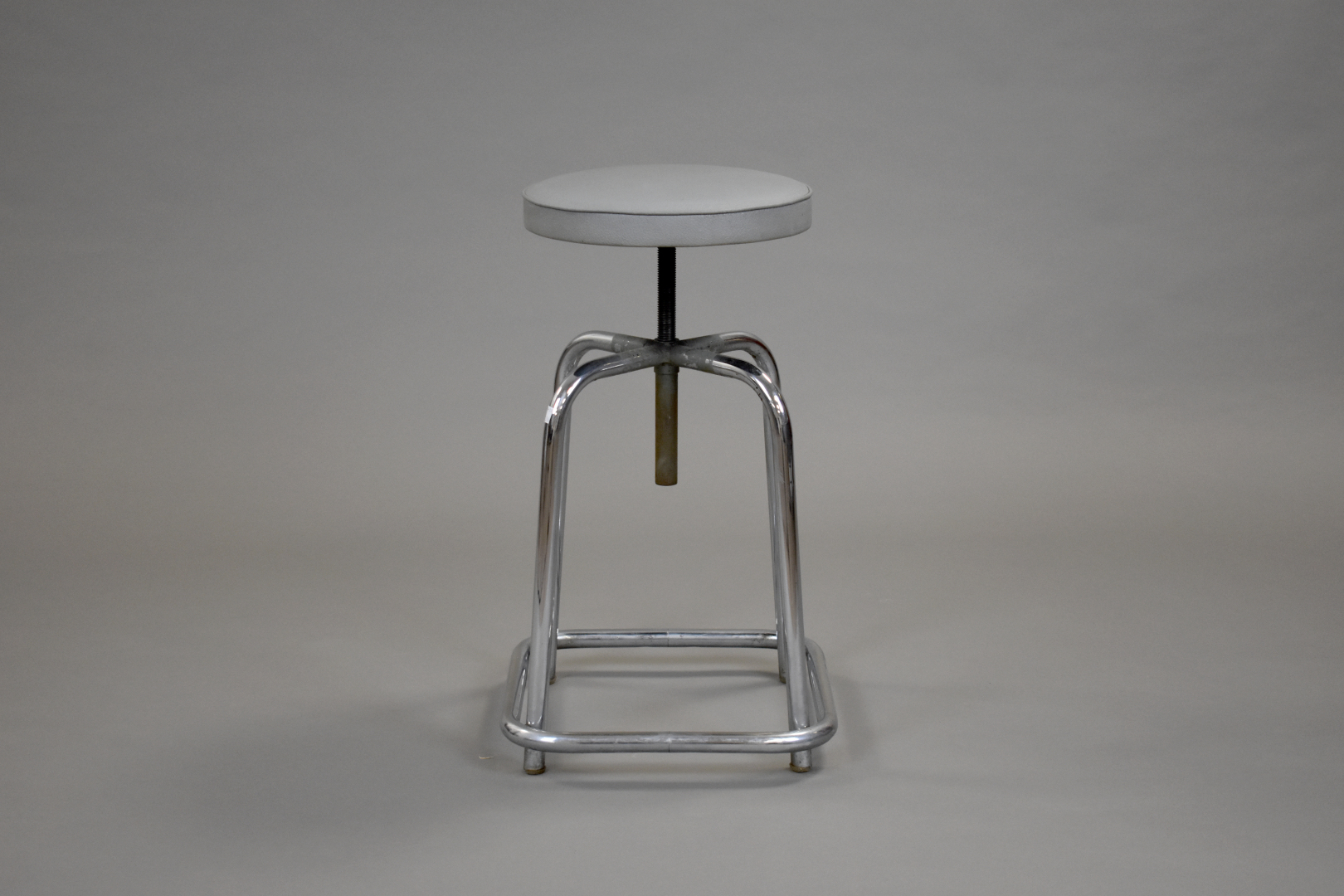 Tabouret garni de skaï gris et pietement en métal chromé. Hauteur ajustable. Seconde moitié du XXe siècle.