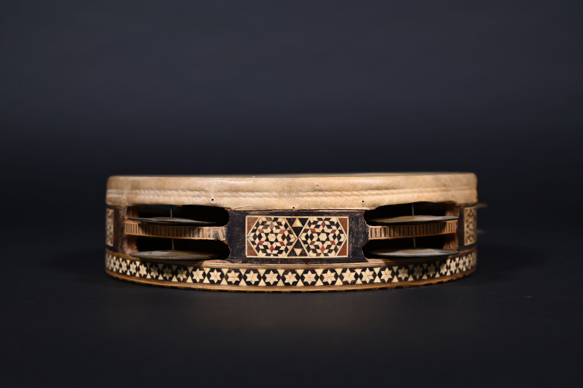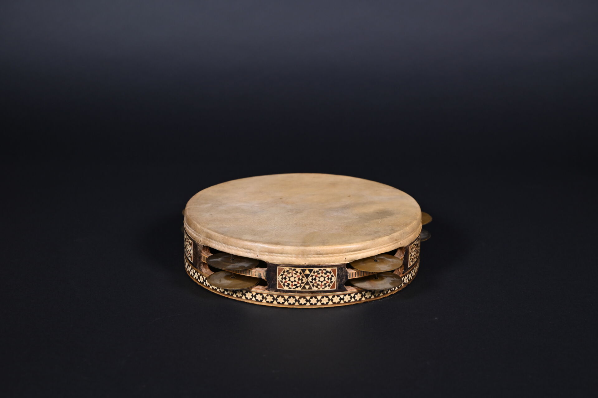 Tambourin dit « Riqq » à décor marqueté (petits manques). Syrie ou Egypte, XXe siècle. Diam. : 25,5 cm.
