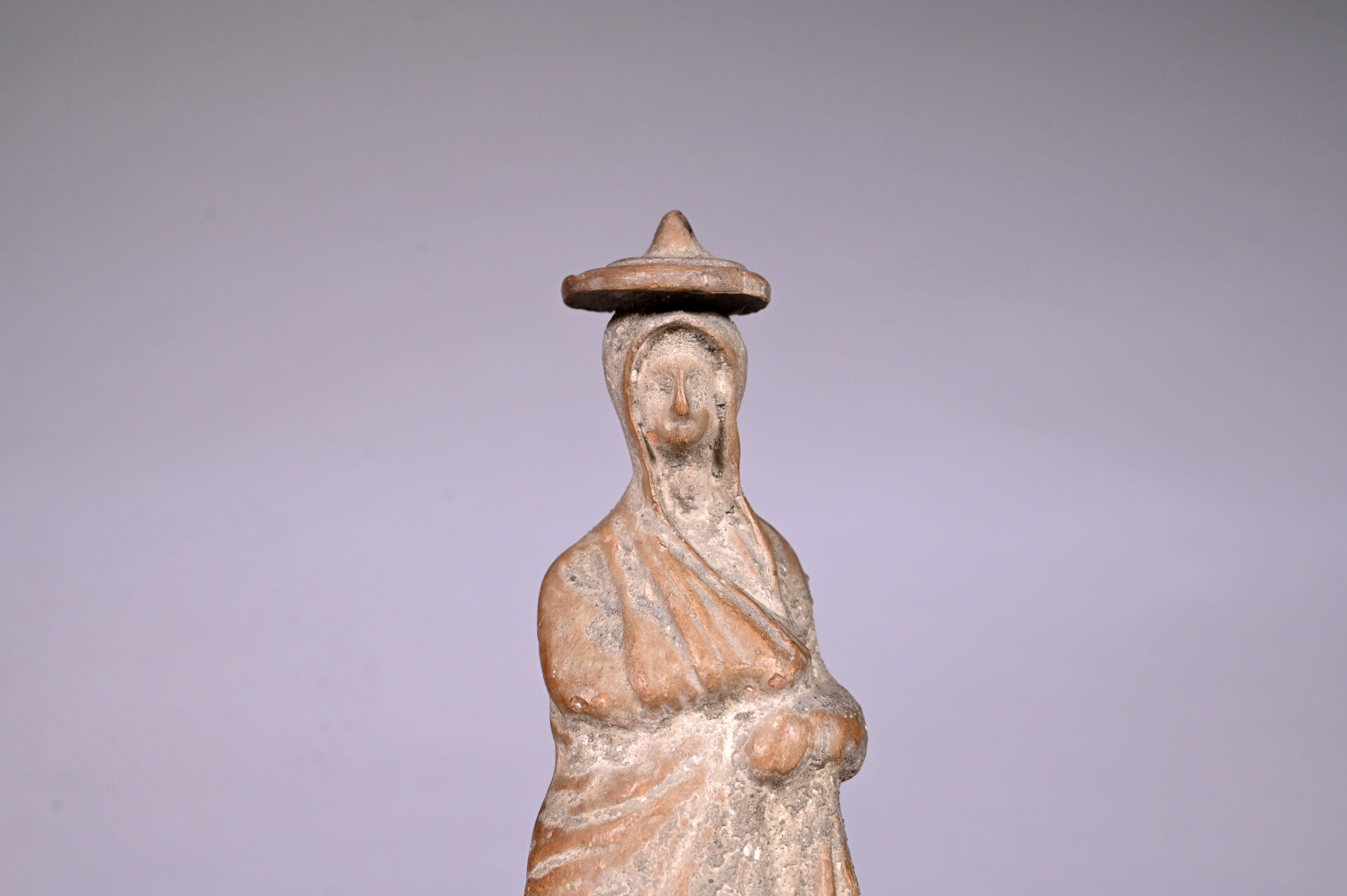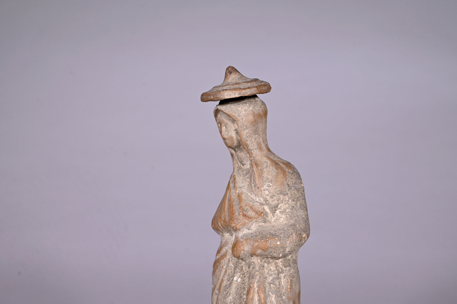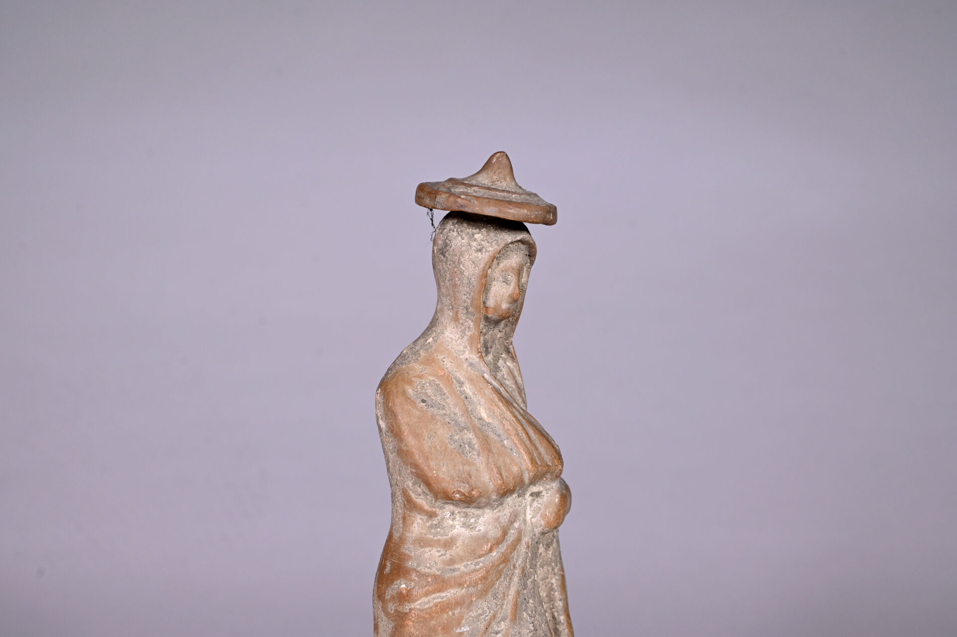 Tanagra. Statuette en terre cuite de femme drapée dans le style des figurines du début de la période hellénistique. H. 20,5 cm (concrétions).