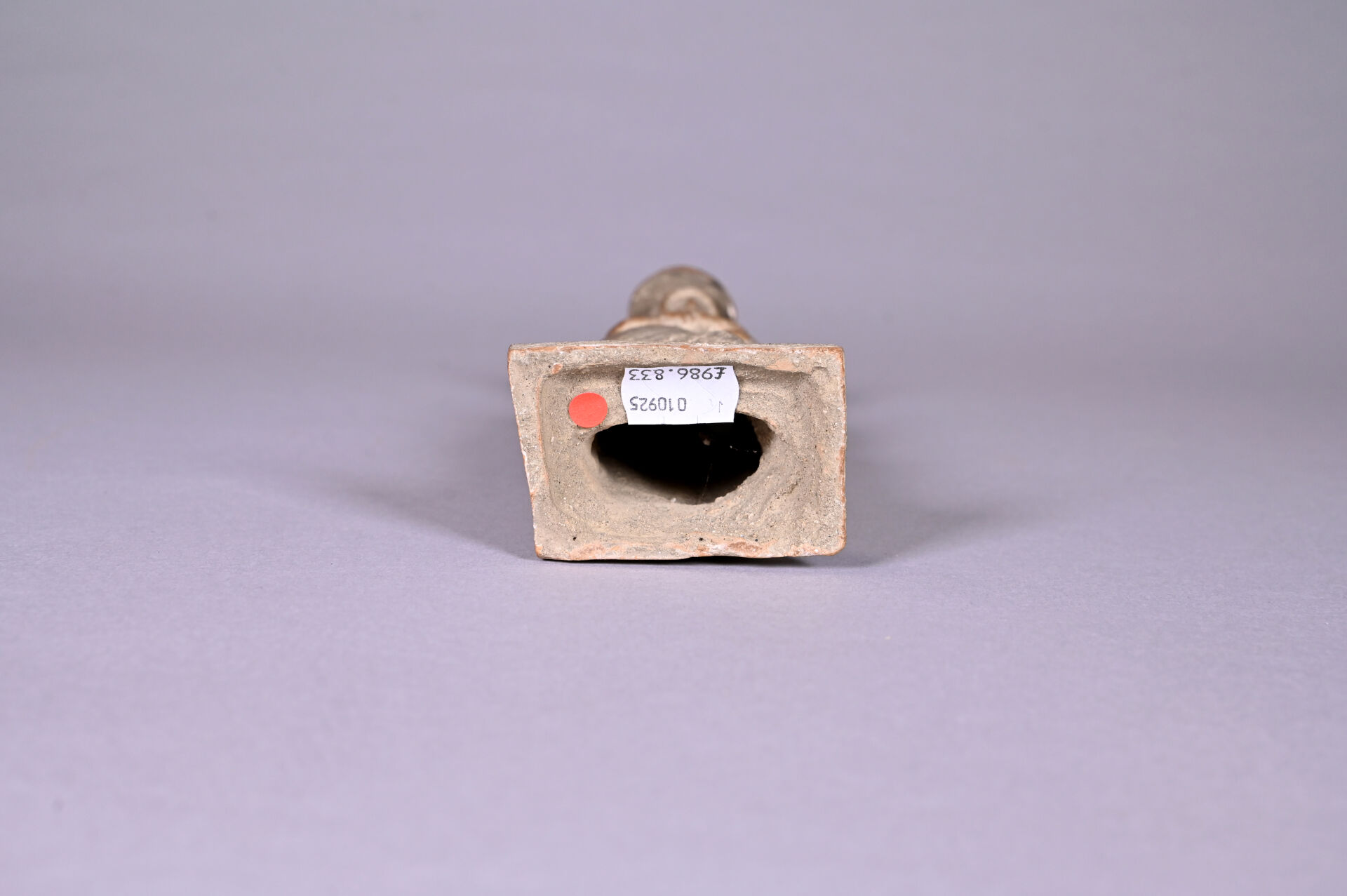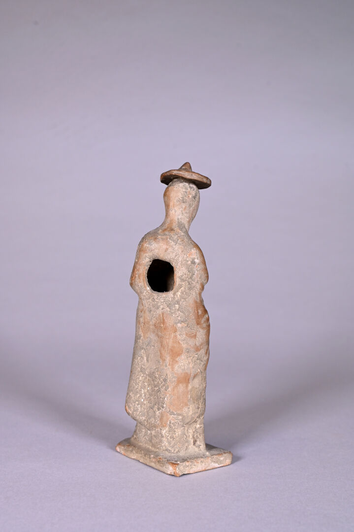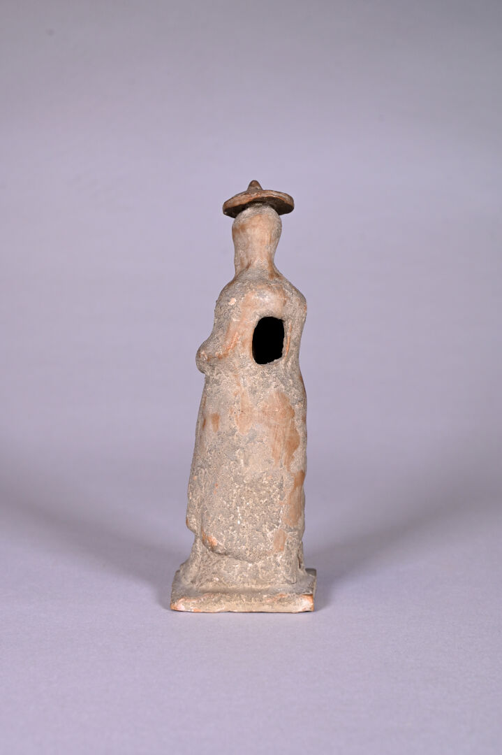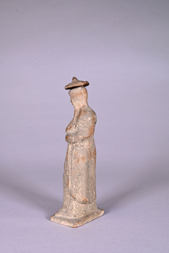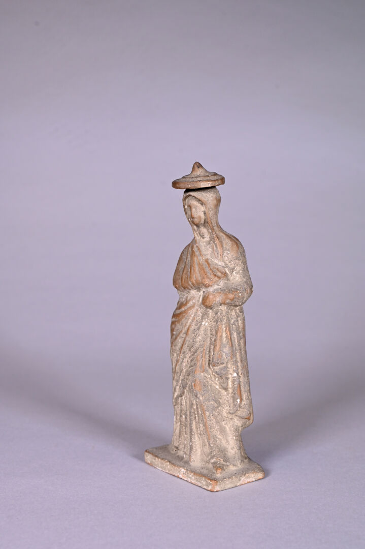 Tanagra. Statuette en terre cuite de femme drapée dans le style des figurines du début de la période hellénistique. H. 20,5 cm (concrétions).