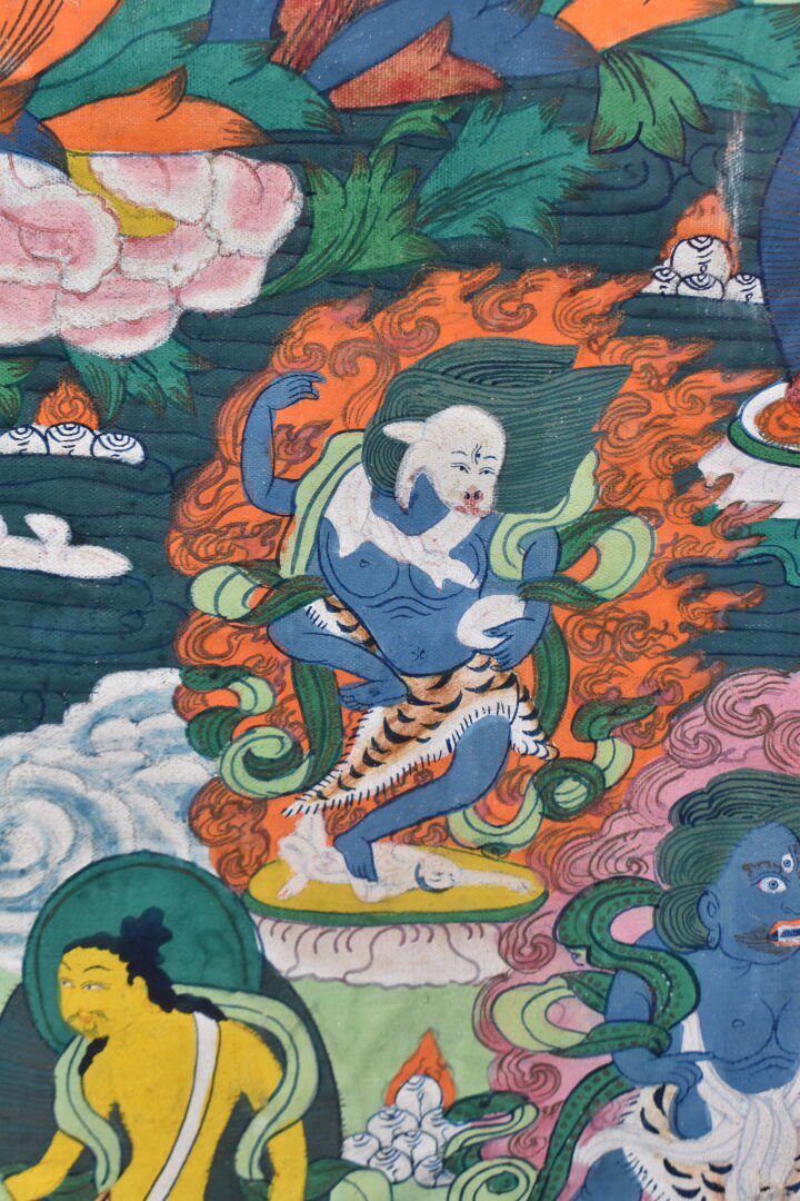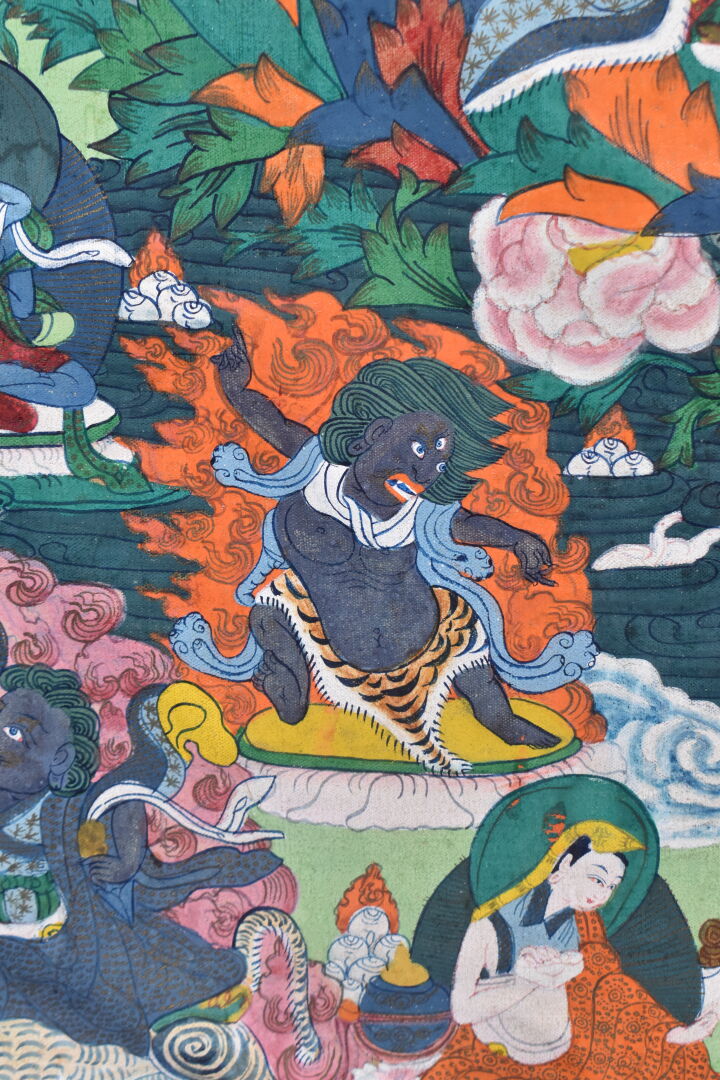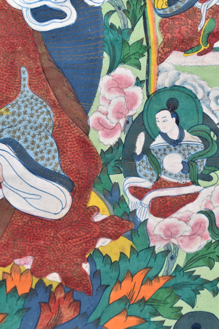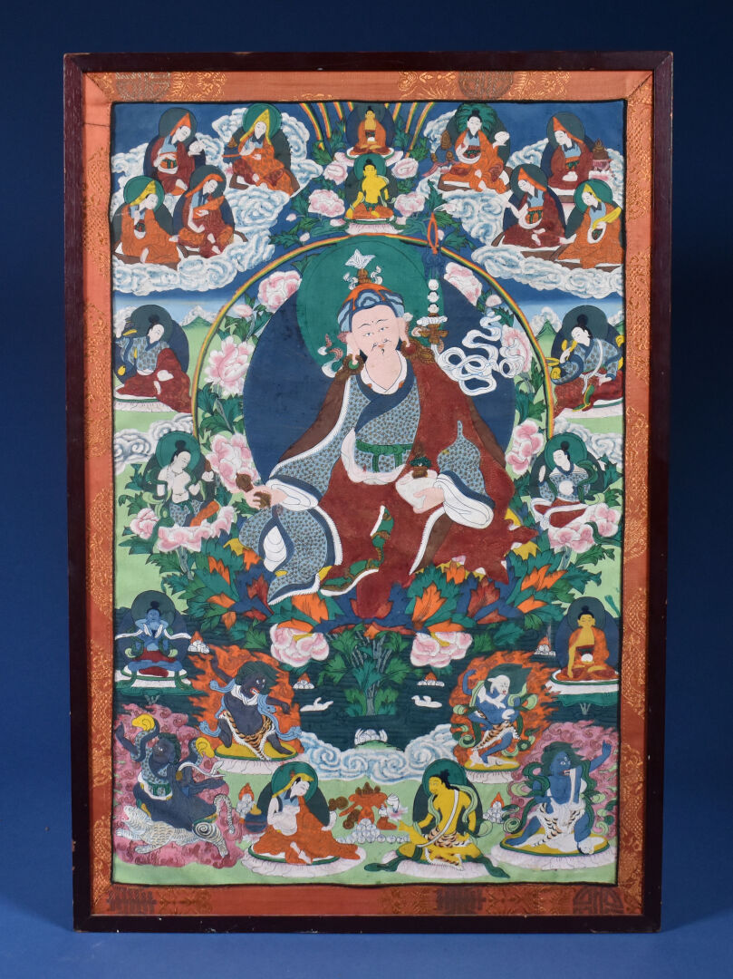 Tangka sur toile représentant Padma Sambava et Lamas. Népal XXe siècle. 58 x 37 cm.