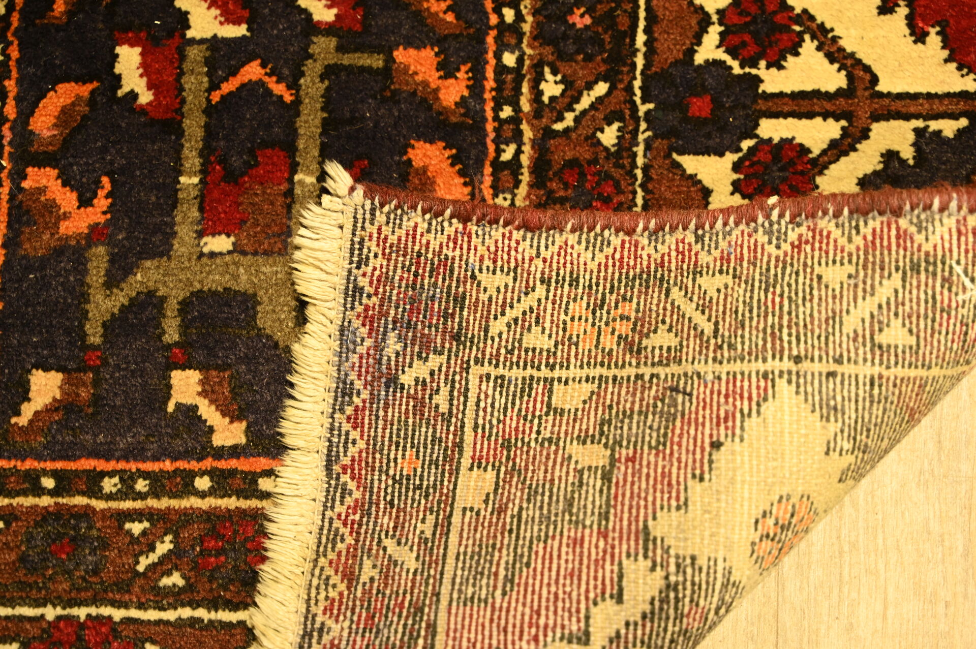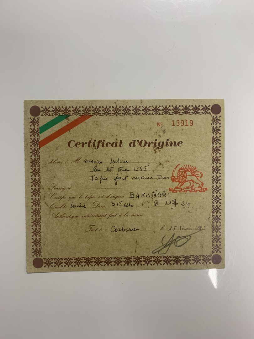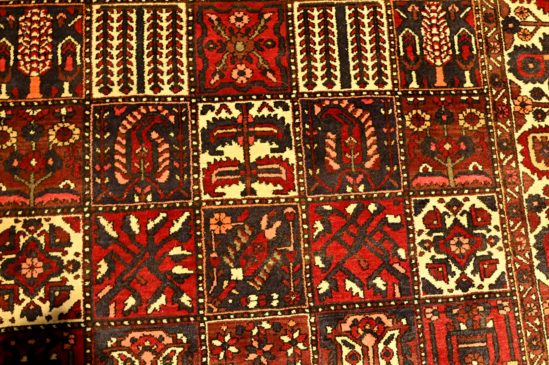 Tapis Bakthiar (chaîne et trame en coton, velours en laine),à décor dit de « jardin » à motif floral dans des caissons en rouge et marine. Sud-Ouest de la Perse, vers 1950-1980. Légère usure et effrangé. 302 x 215 cm.