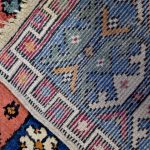 Tapis d’Afrique du Nord, probablement Rabat (chaîne, trame et velours en laine). Seconde moitié du XXème siècle. Le tapis est orné d’un losange central polychrome sur fond rose à motifs géométriques. Une bordure bleu gris à motifs géométriques polychromes cerne la composition. (Effrangé)