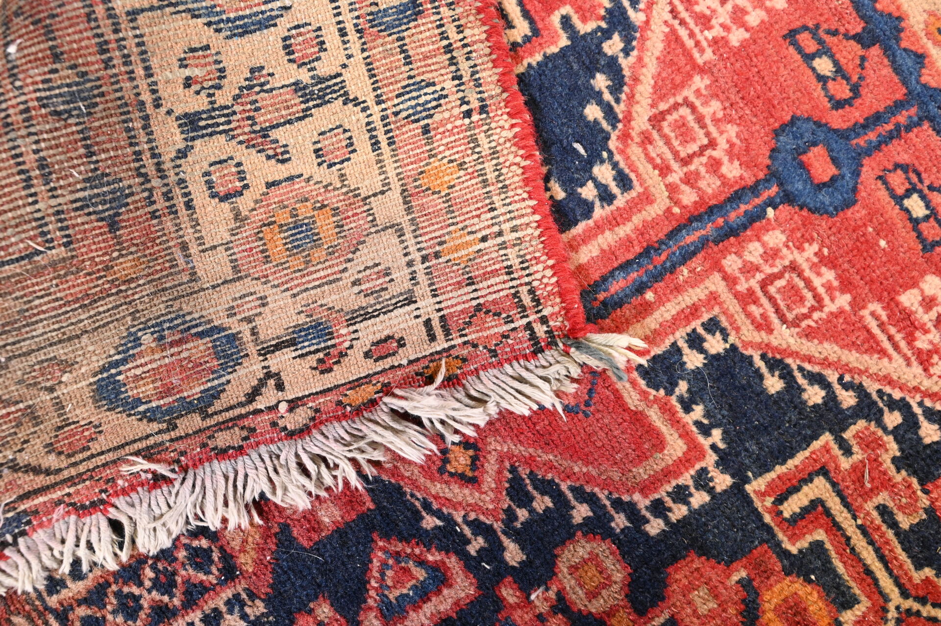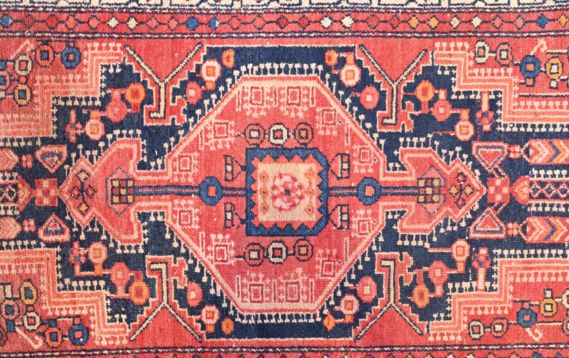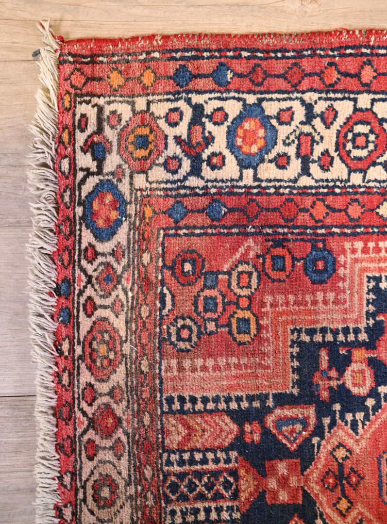 Tapis Hamadan (chaine et trame en coton, velours en laine), Nord-ouest de la Perse, vers 1940-1970. Usures, effrangé, lisières abimées et diminué. 151 x 104 cm.