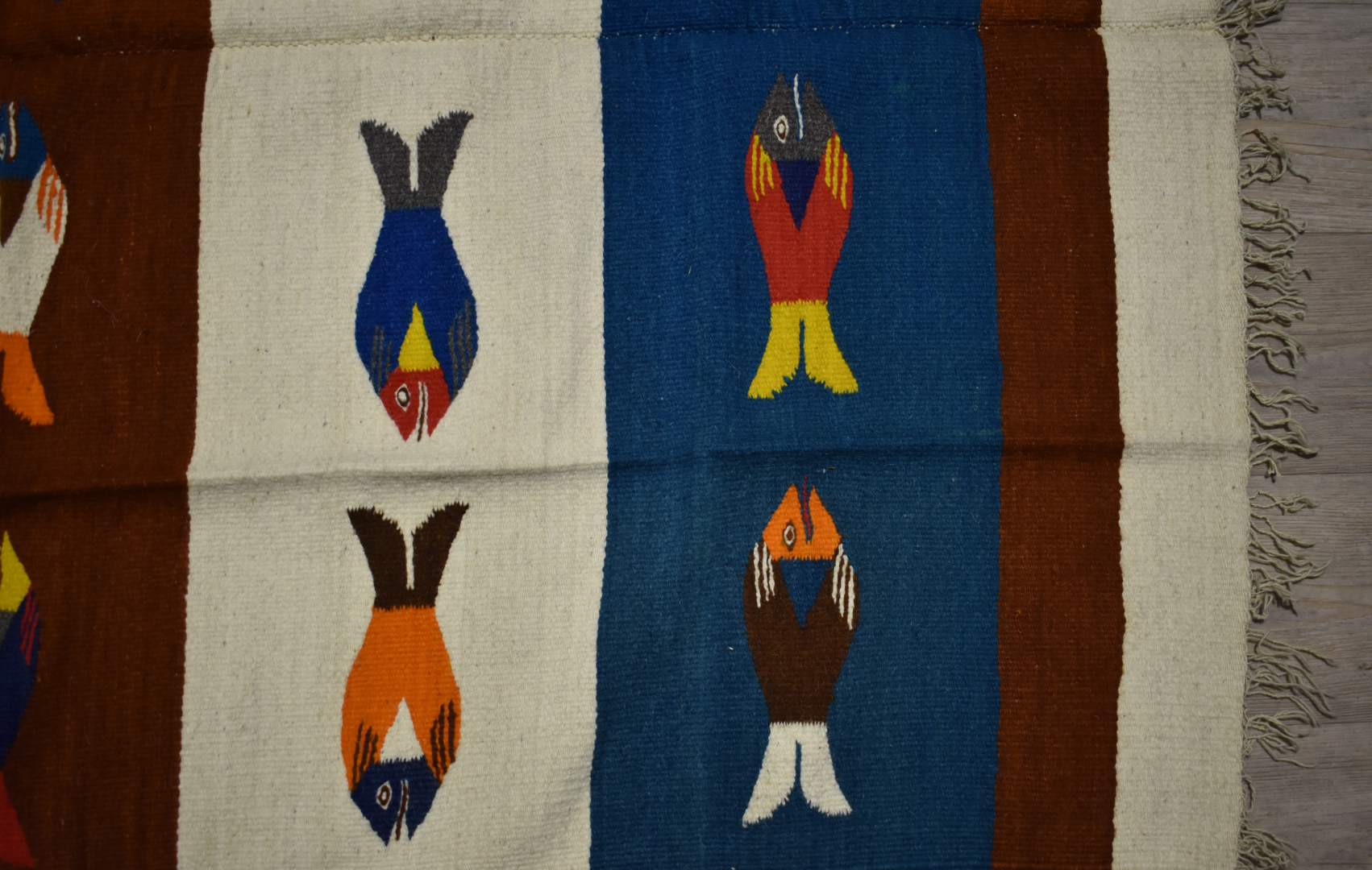 Tapis KILIM en laine à décor polychrome de poissons.