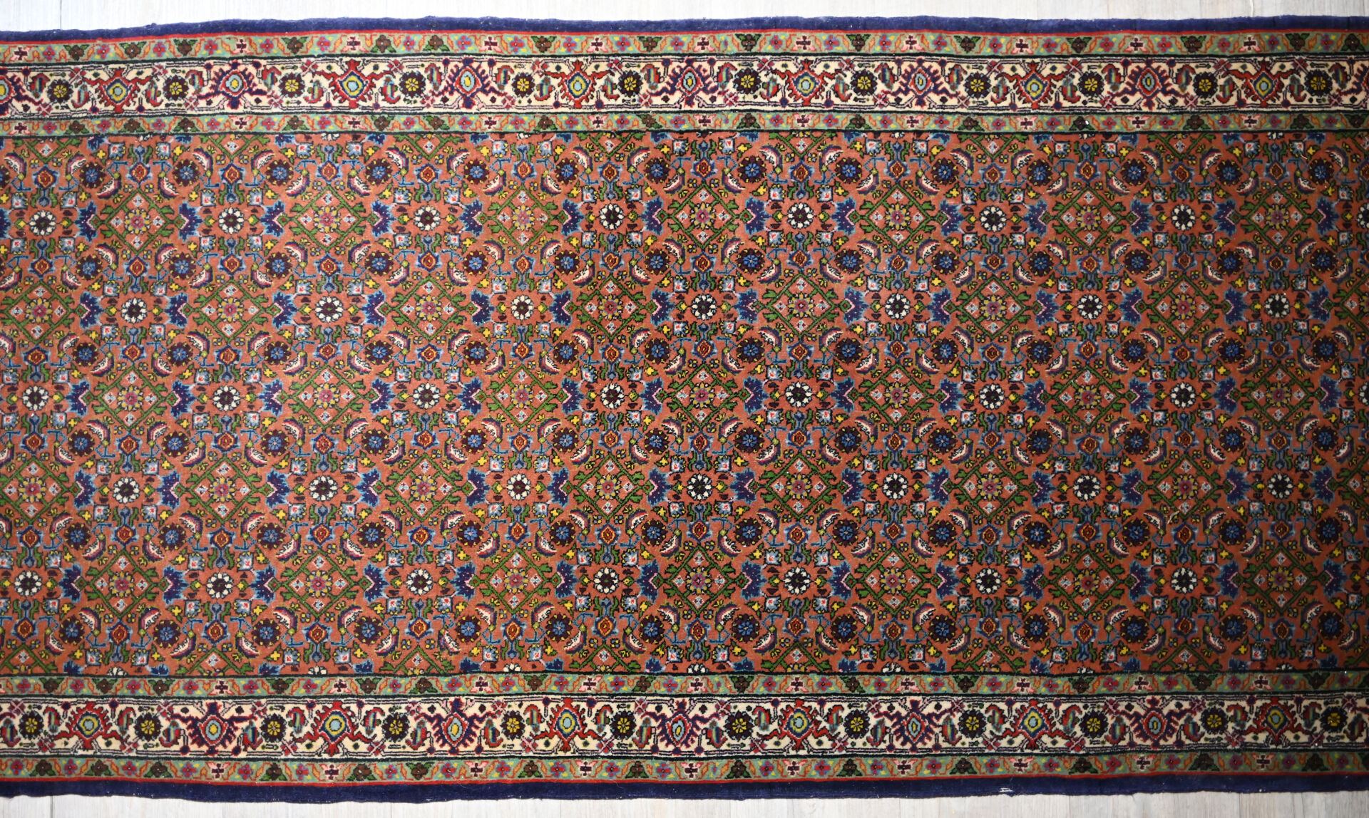 Tapis probablement Bidjar (chaîne et trame en coton, velours en laine), Nord-Ouest de la Perse, vers 1950-1980. 284 x 93 cm. Usures et effrangé.