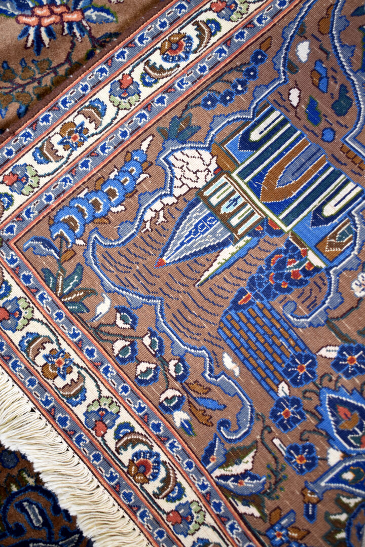 Tapis Tebriz (chaîne et trame en coton, velours en laine), Nord-ouest de la Perse, vers 1940.Le tapis est orné d’un grand médaillon central à décor d’architecture sur fond tabac à motifs d’aiguières arbres et fleurs stylisées polychromes. L’ensemble de la composition est agrémentée à chaque coin d’un motif d’architecture. Une étroite bordure ivoire à guirlande de fleurs est encadrée de deux contre-bordures.