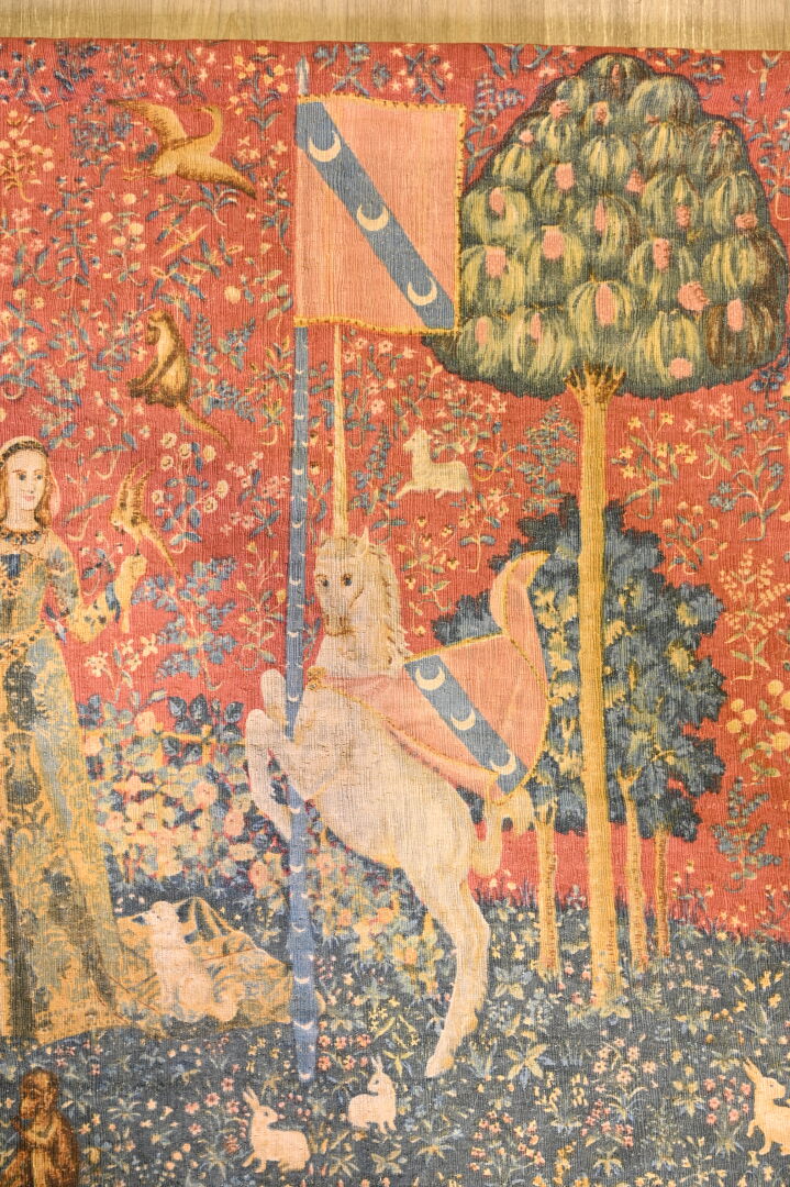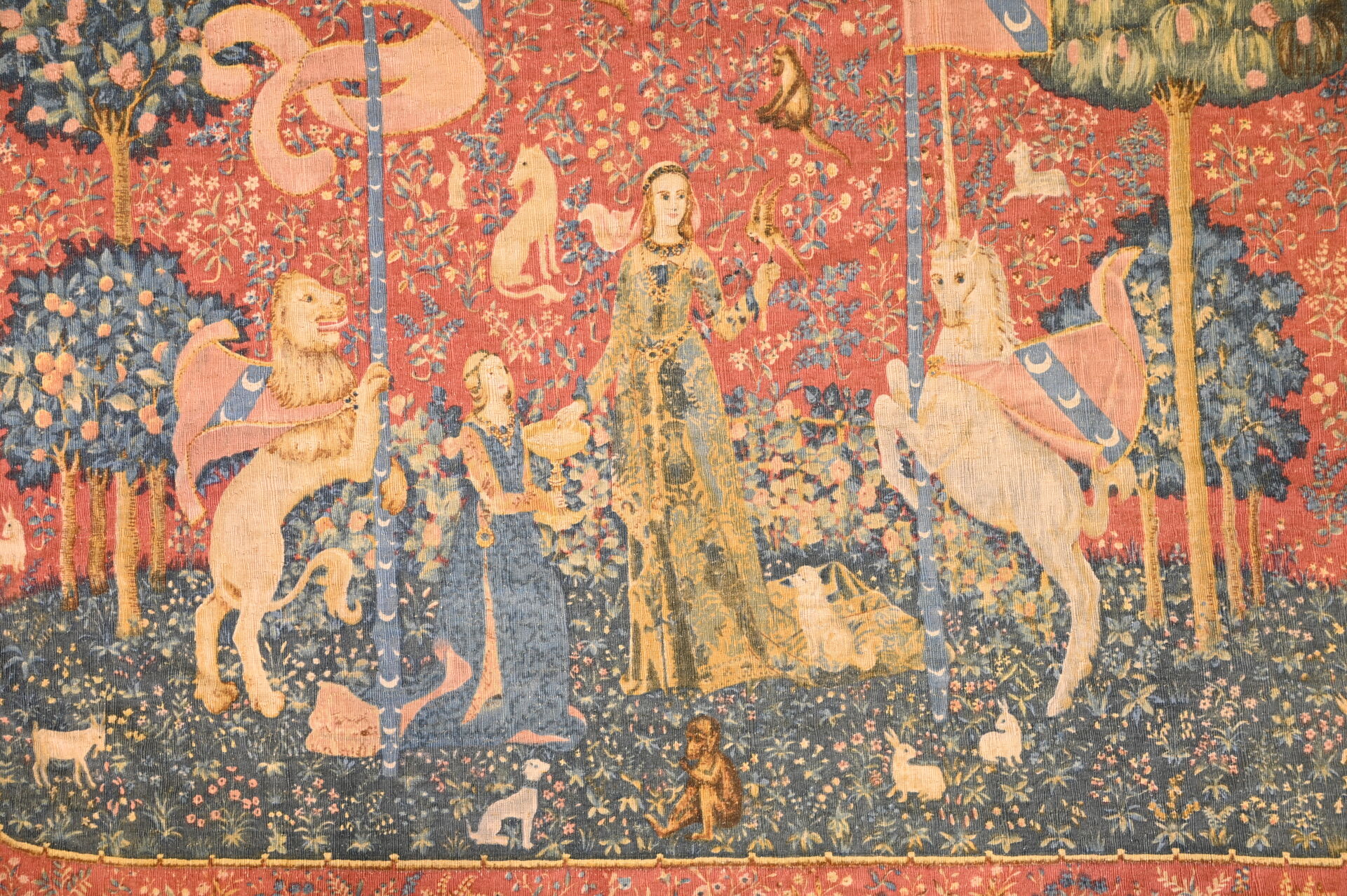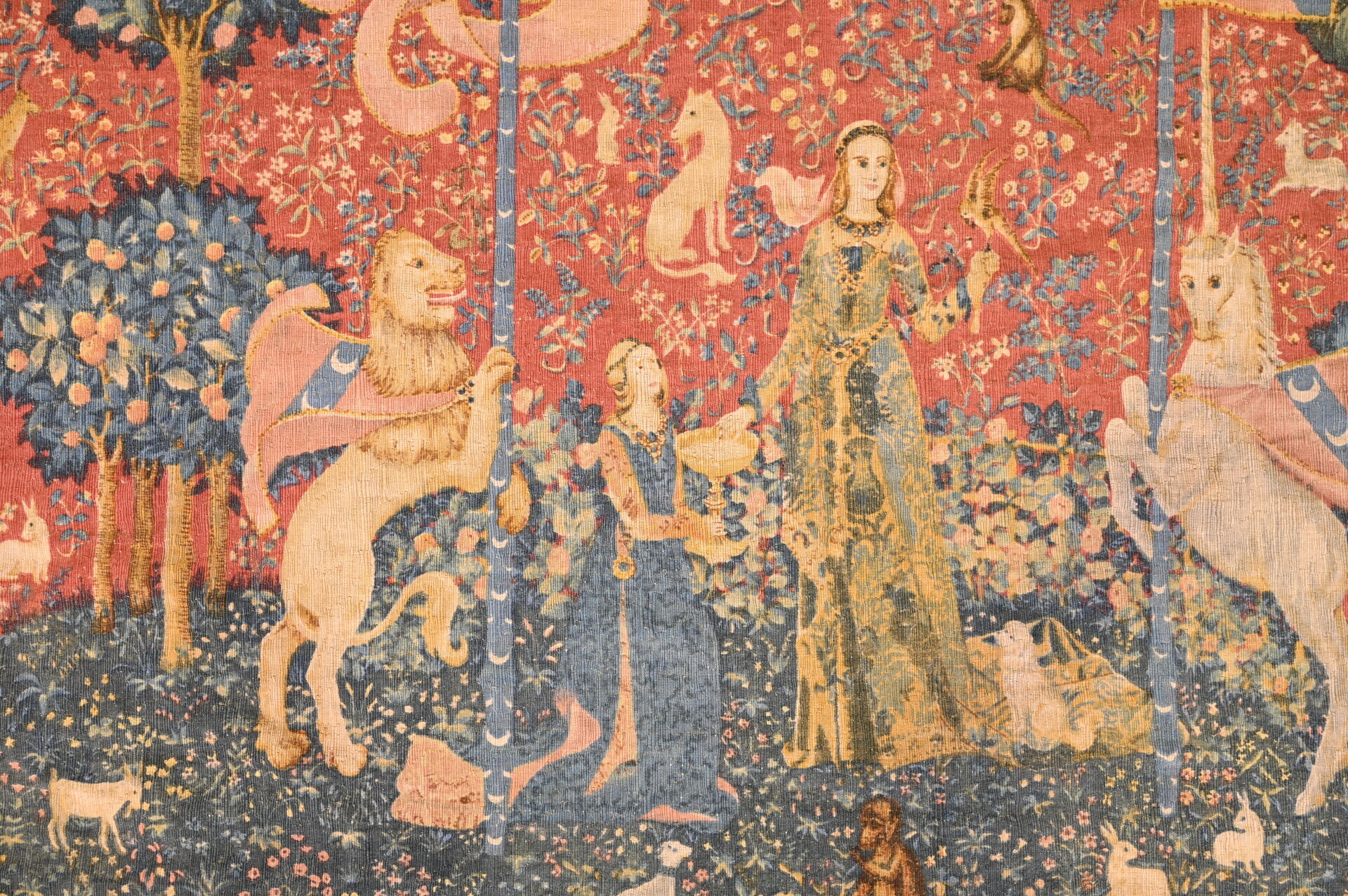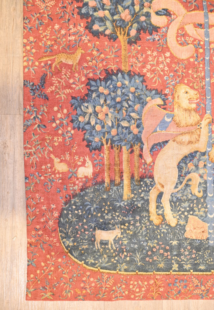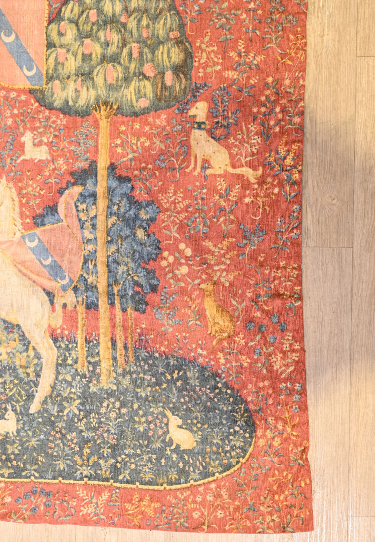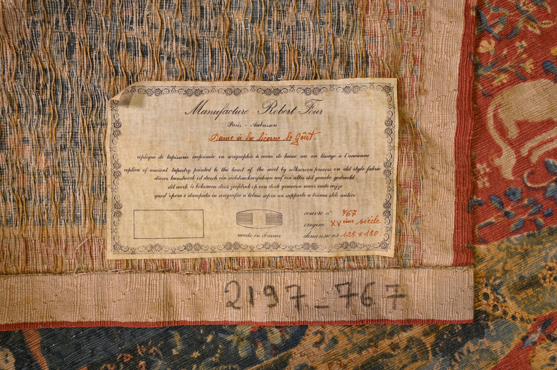 Tapisserie représentant la Dame à la Licorne – Le goût. Manufacture ROBERT FOUR. Avec bolduc, numérotée 767. 125 x 190 cm.