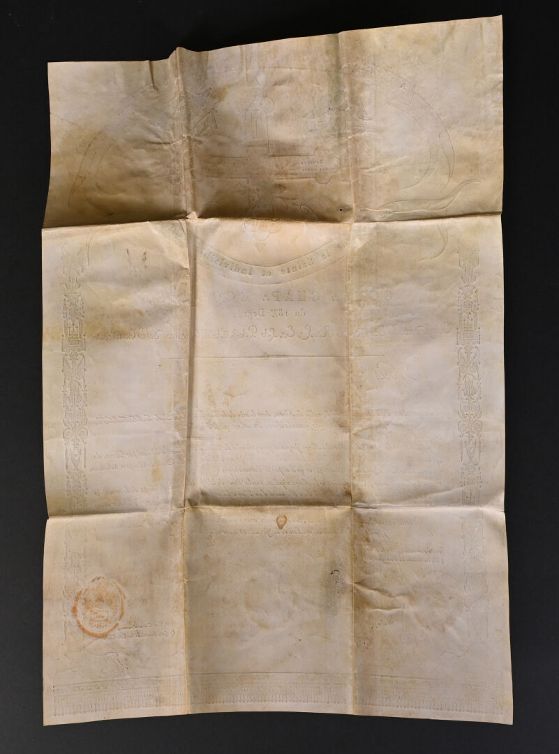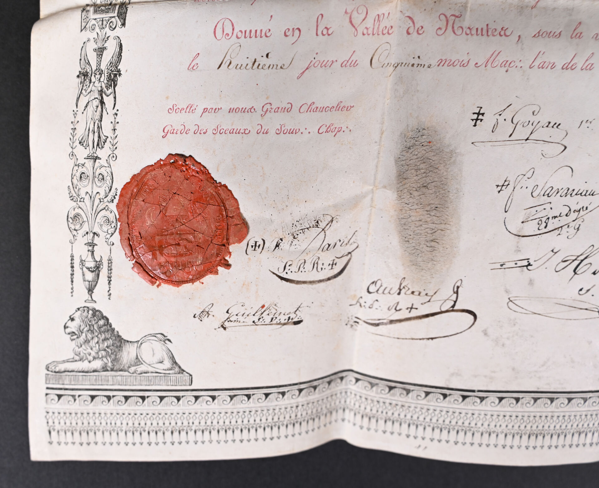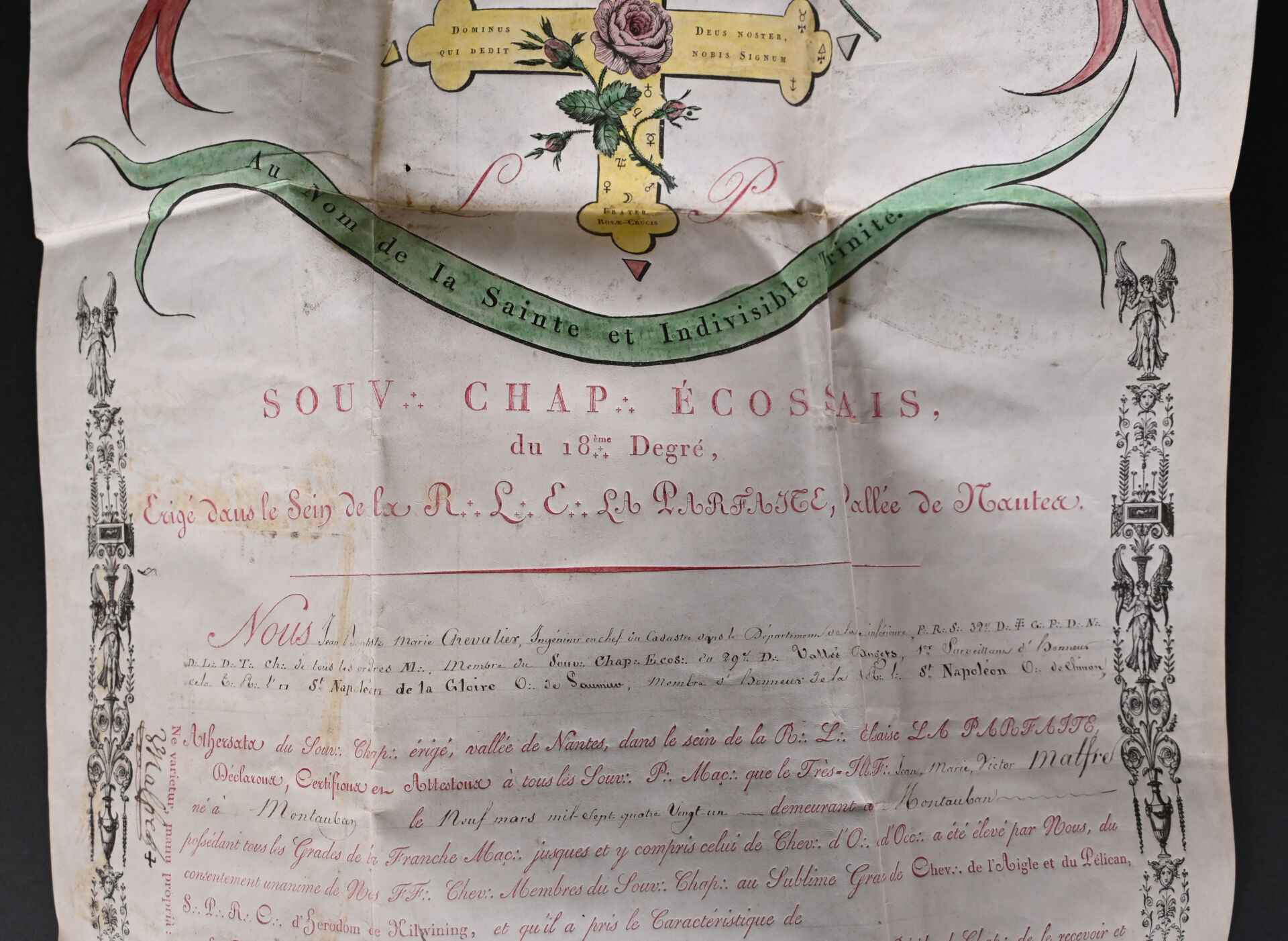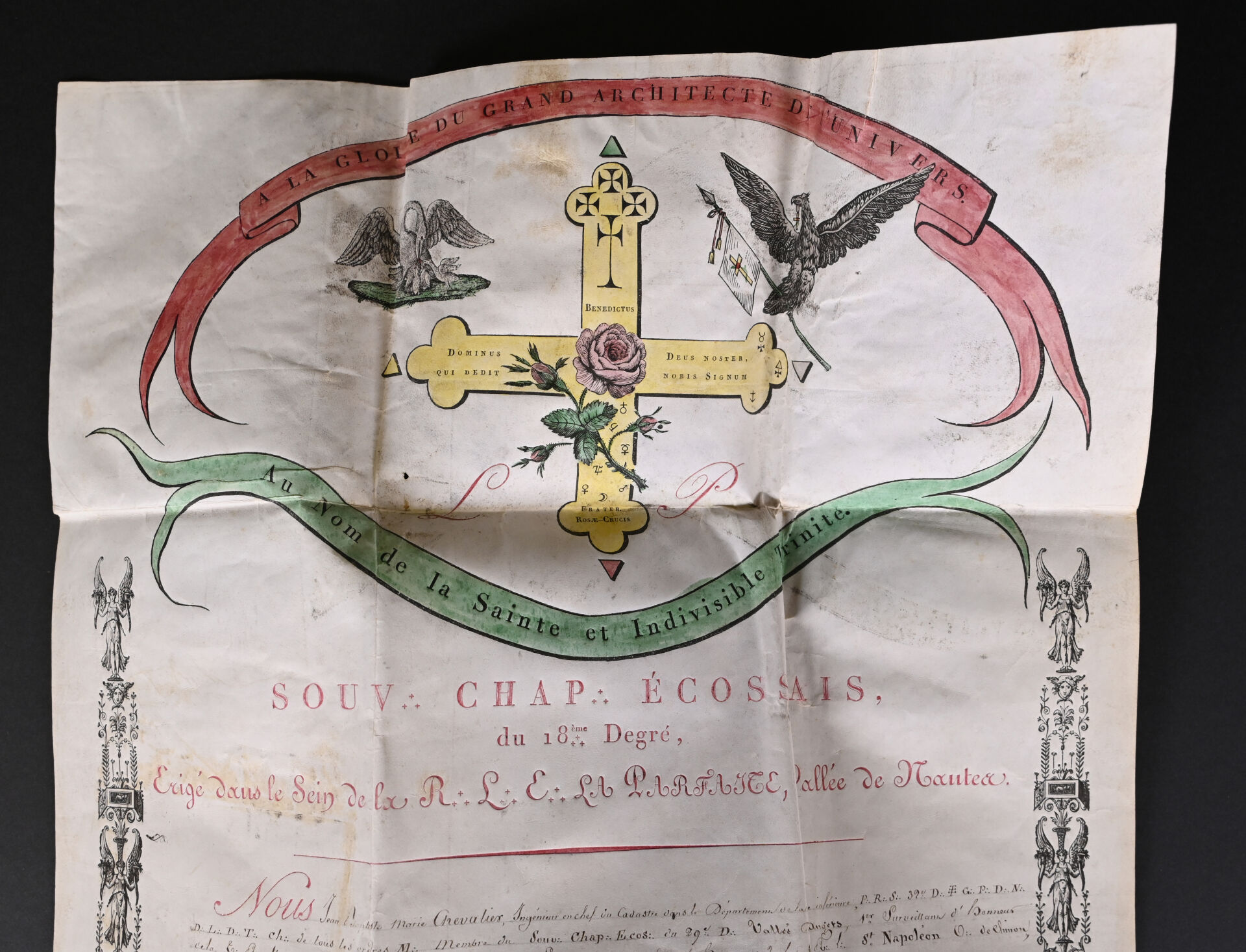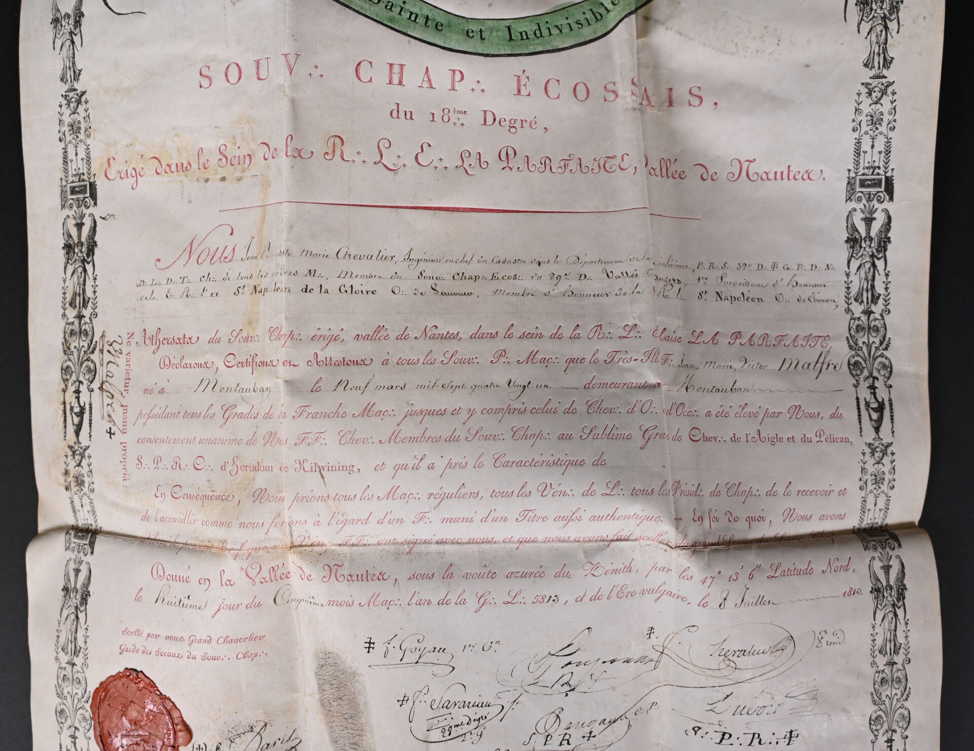 [TARN-ET-GARONNE – FRANC-MAÇONNERIE]. Diplôme Franc-maçon sur gravé sur vélin avec ajouts manuscrits et colorié à l’époque. « Donné en la Vallée de Nantes », 8 juillet 1813. 50 x 34 cm. Cachet de cire rouge conservé. « Souv. Chap écossais du 18e degré érigé dans le sein de la R. L. E. La Parfaite, vallée de Nantes […] », décerné à Jean Marie Victor Malfre à Montauban. Nombreuses signatures.