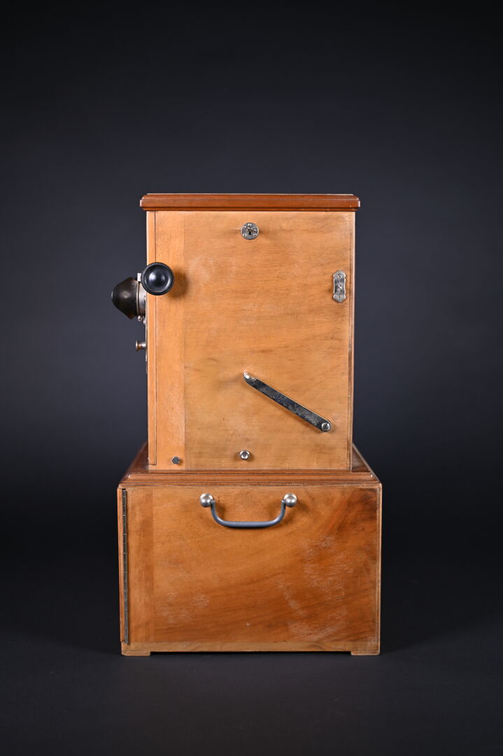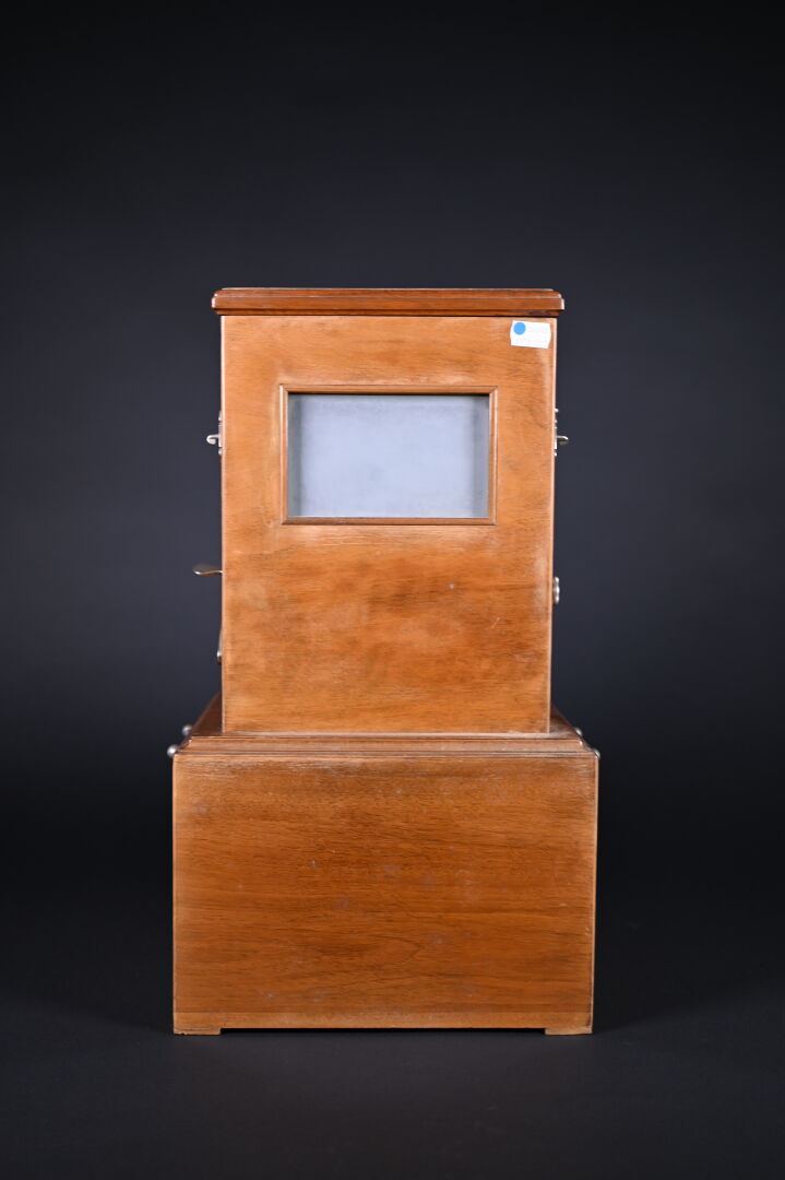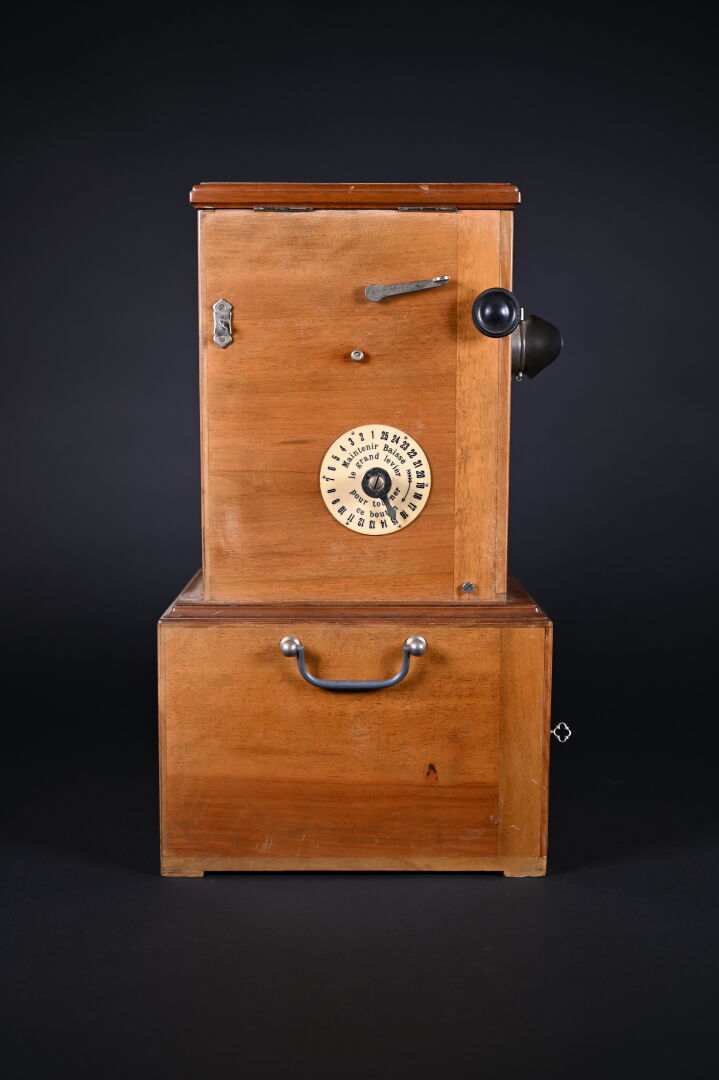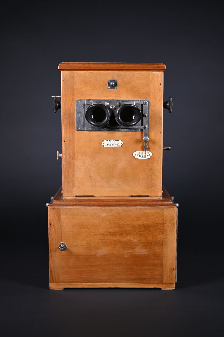 Taxiphote, visionneuse de plaques photographiques. Marqué TAXIPHOTE -STEREO CLASSEUR DISTRIBUTEUR AUTOMATIQUE BREVETE SGDG. Magasin 7 rue Lafayette – Paris. Compartiment à plaques en partie inférieure. Fonctionne. On joint environ 30 plaques photographiques, dont certaines sur Montauban. Haut. totale : 49,5 cm.