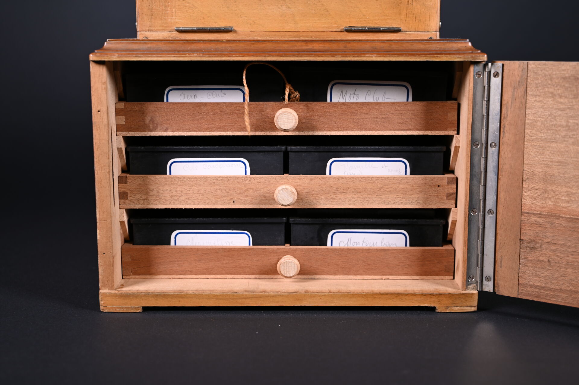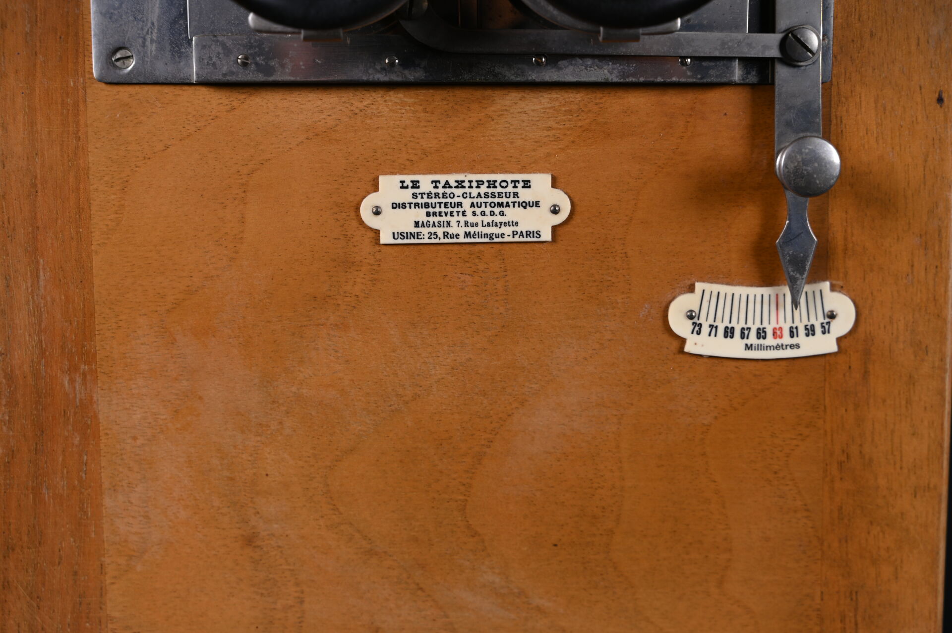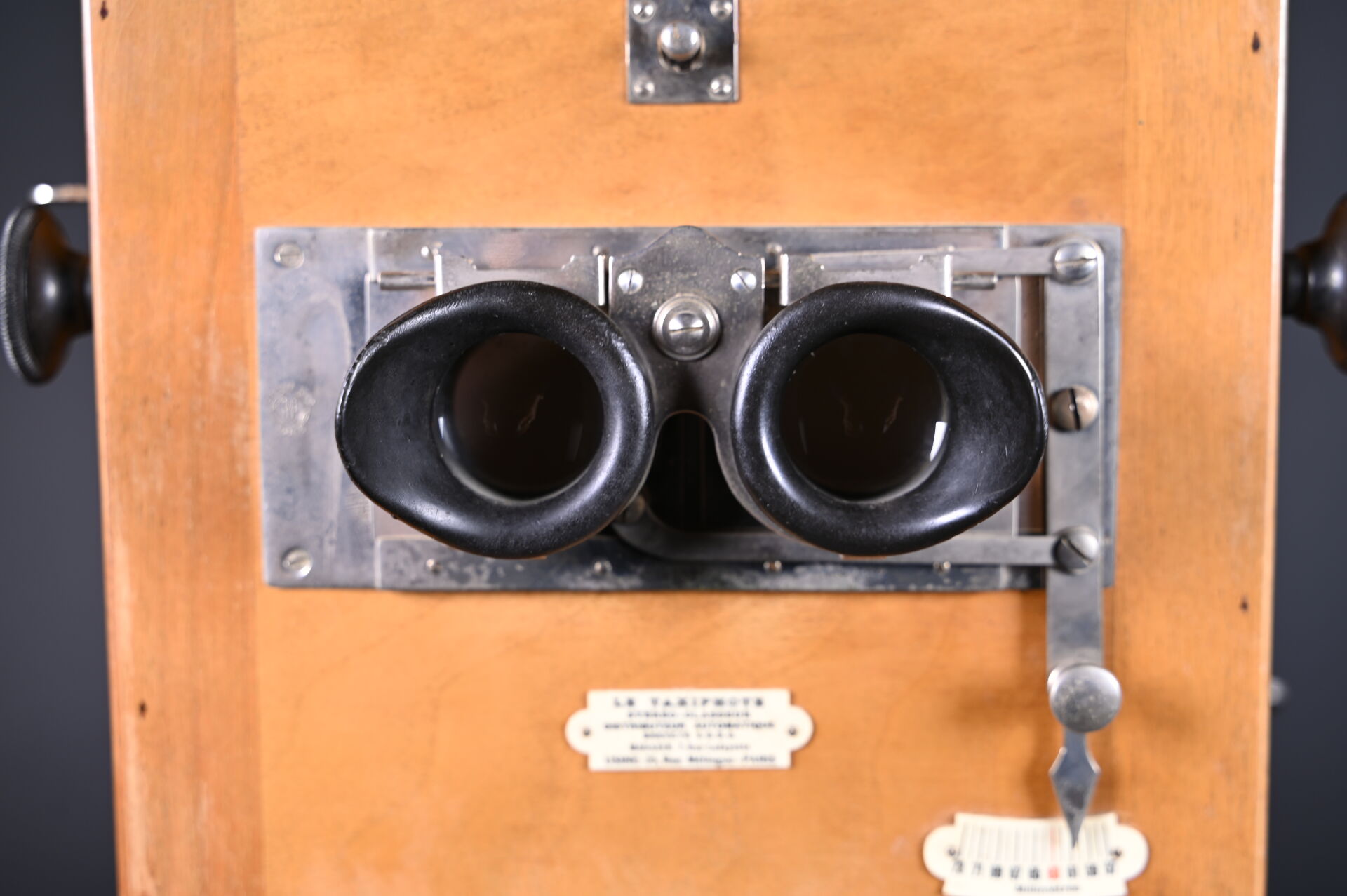 Taxiphote, visionneuse de plaques photographiques. Marqué TAXIPHOTE -STEREO CLASSEUR DISTRIBUTEUR AUTOMATIQUE BREVETE SGDG. Magasin 7 rue Lafayette – Paris. Compartiment à plaques en partie inférieure. Fonctionne. On joint environ 30 plaques photographiques, dont certaines sur Montauban. Haut. totale : 49,5 cm.