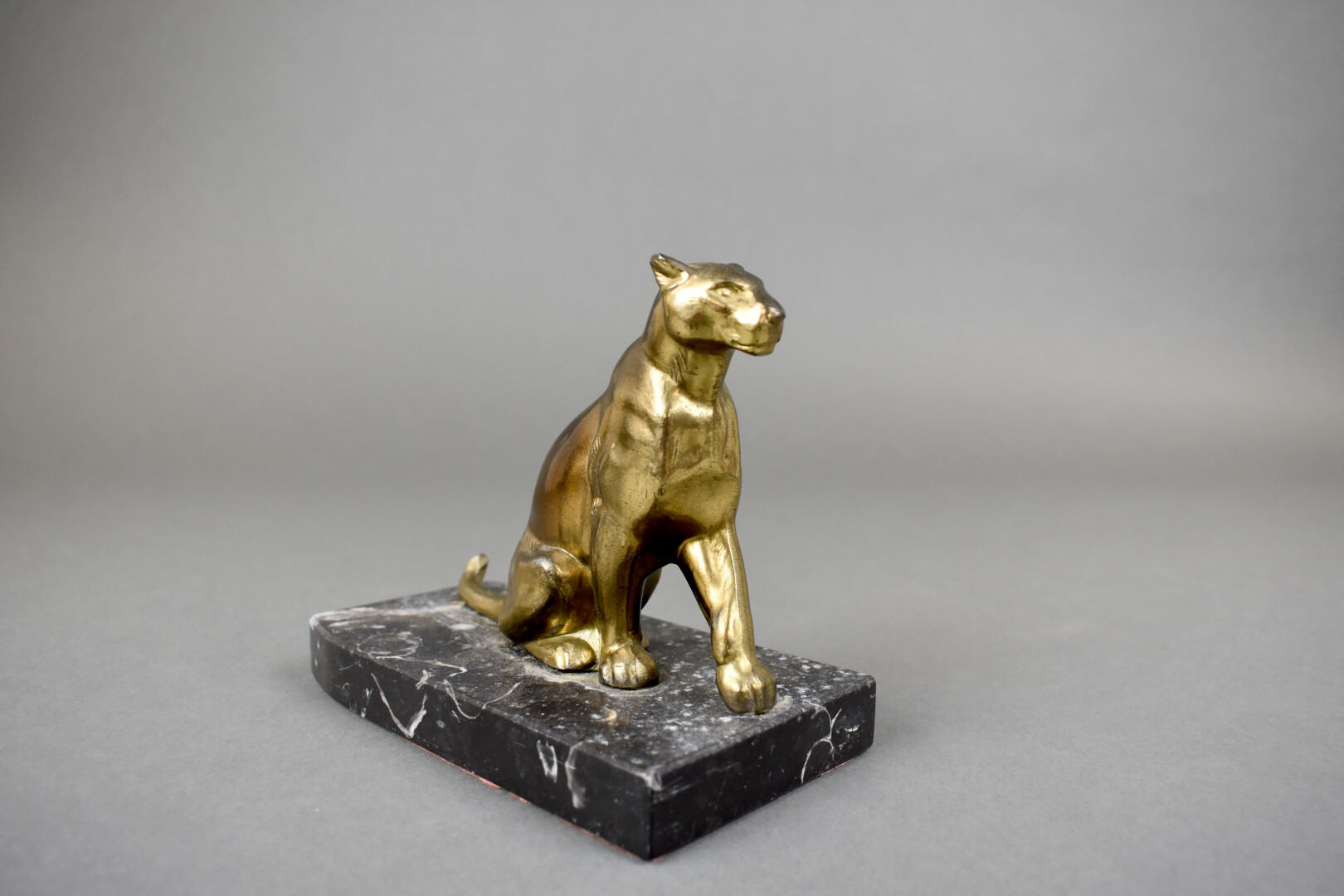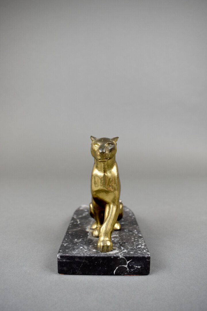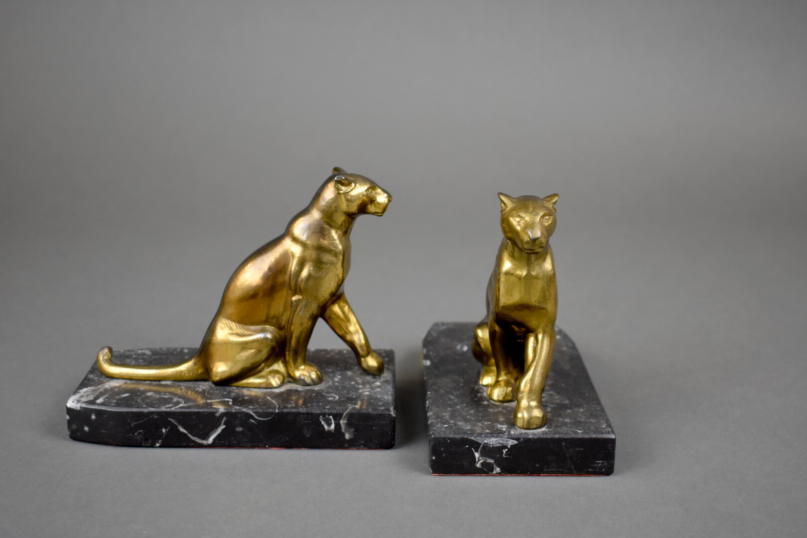 TEDD. Paire de serre-livres en régule doré représentant des panthères (légères usures à la dorrure). La base en marbre noir veiné blanc. XXe siècle. Haut. : 12,5 cm.