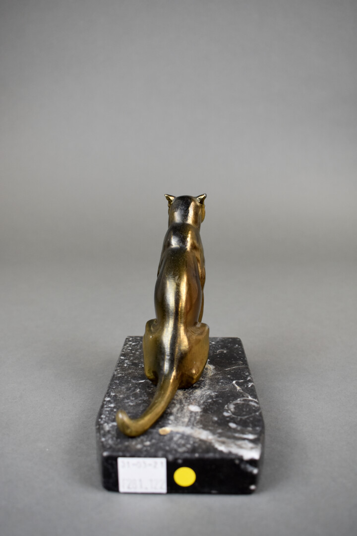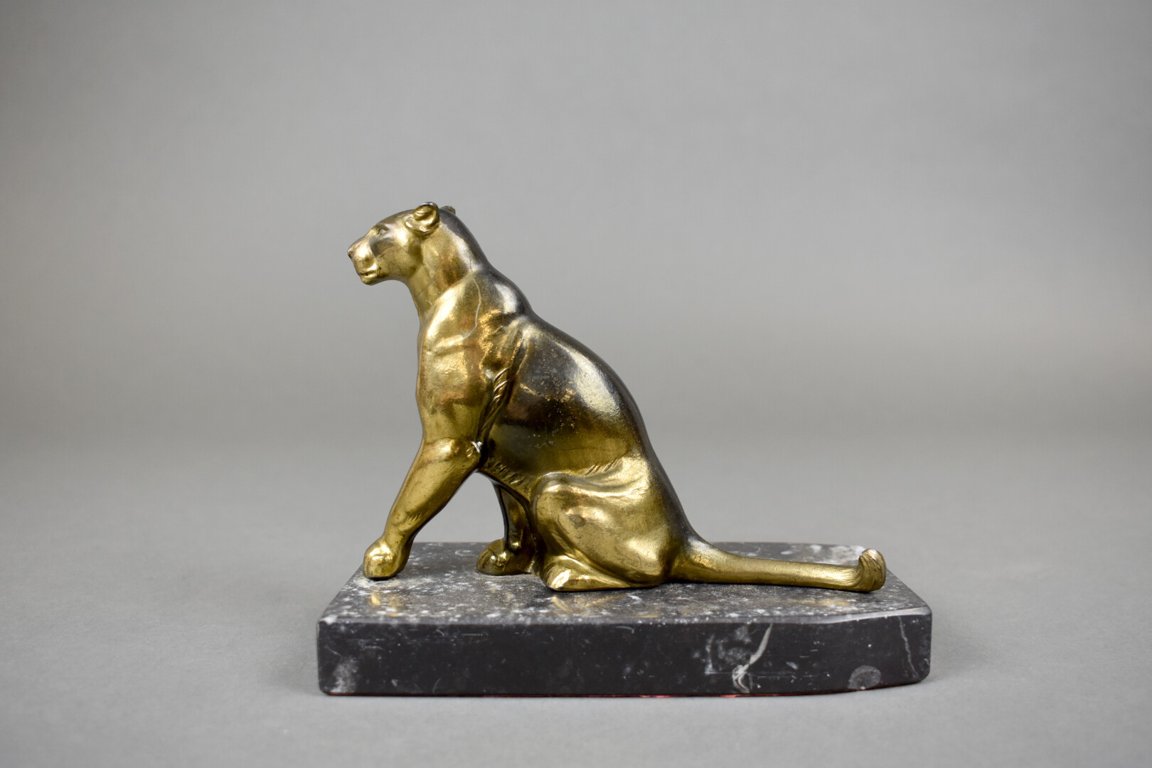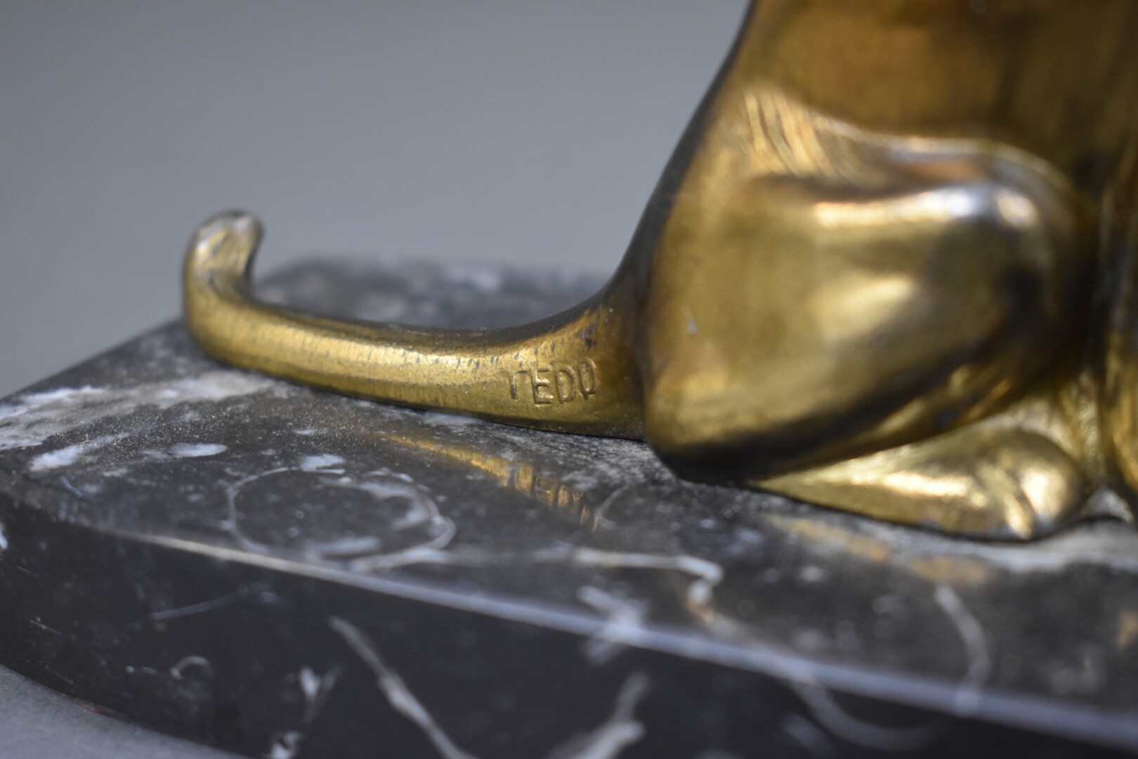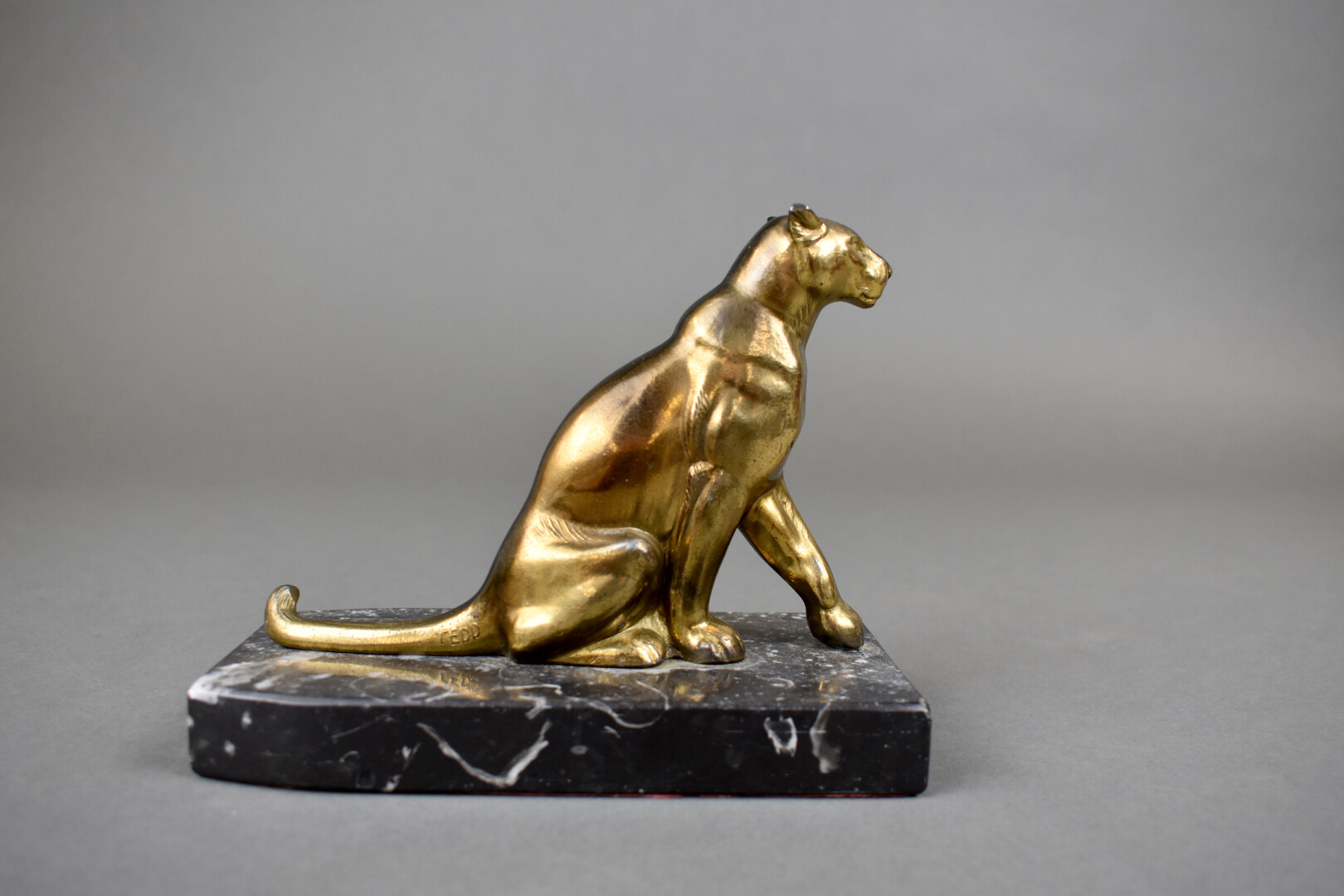 TEDD. Paire de serre-livres en régule doré représentant des panthères (légères usures à la dorrure). La base en marbre noir veiné blanc. XXe siècle. Haut. : 12,5 cm.