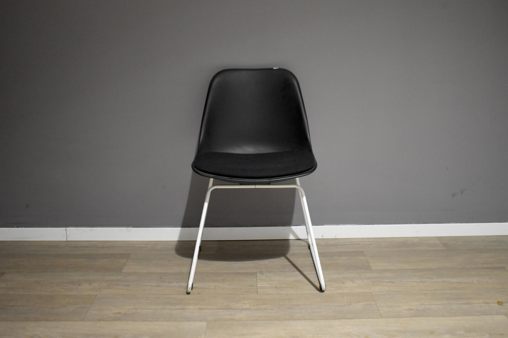 TENZO. Chaise à coque en polypropylène noire et coussin noir. Piétement luge en métal tubulaire laqué blanc (usures d’usage). Haut. : 78 cm.