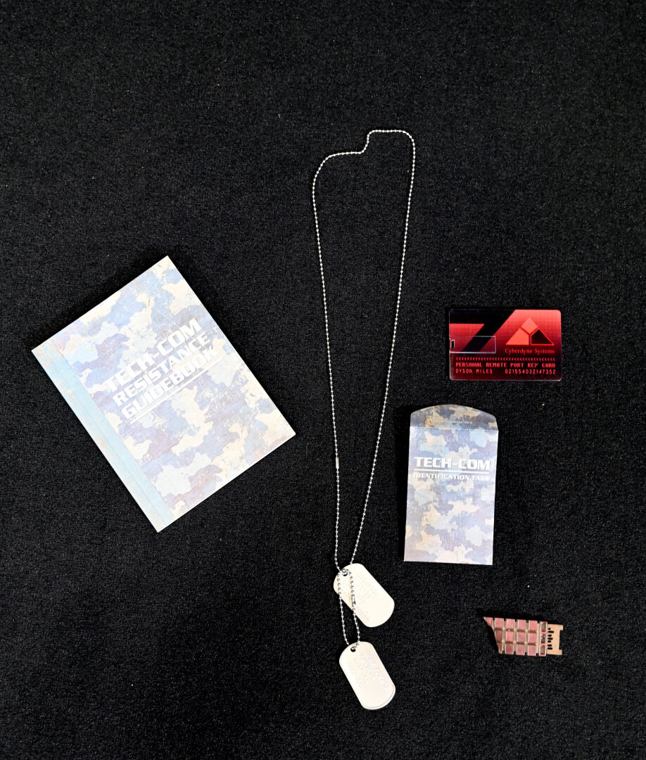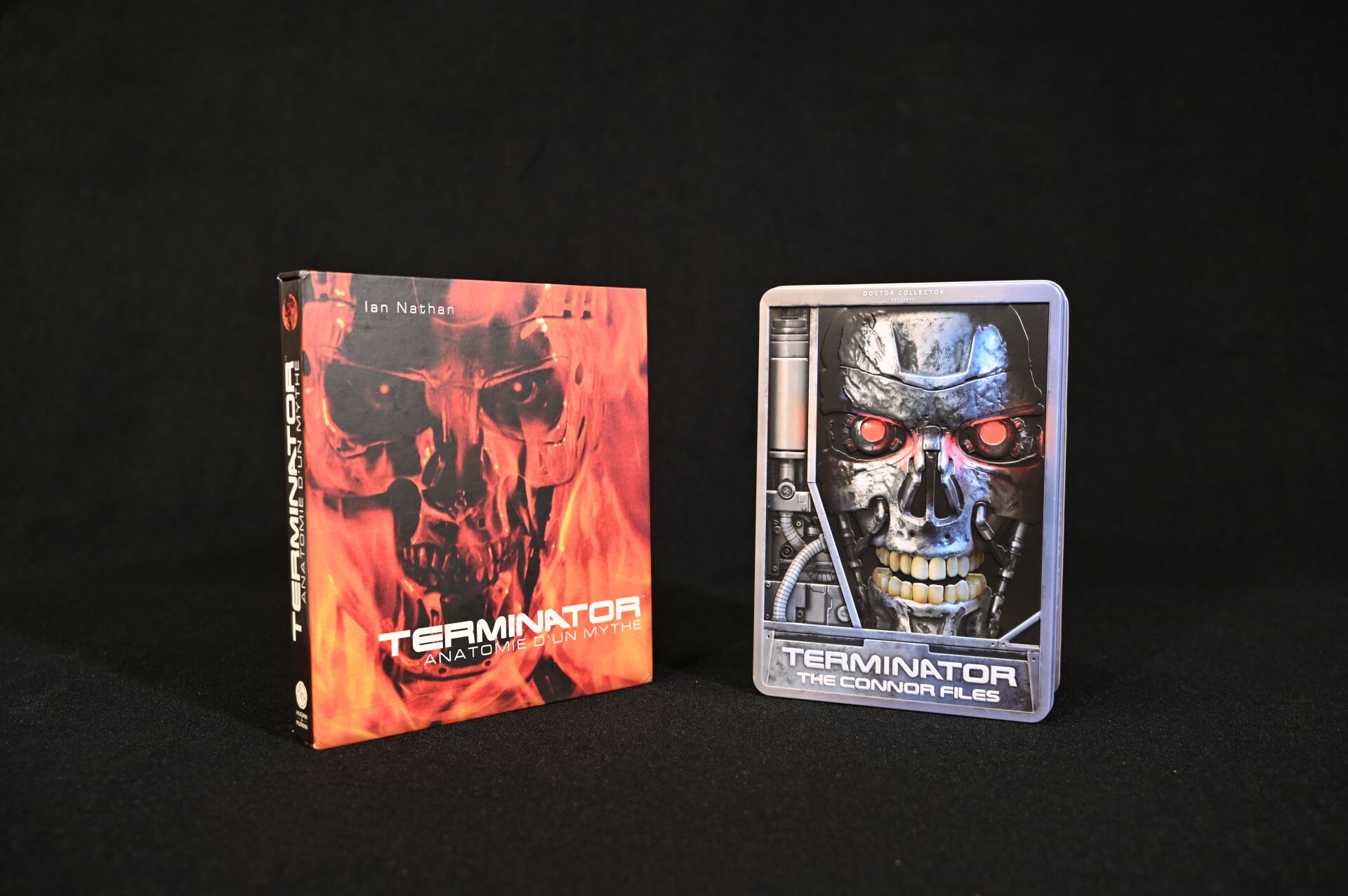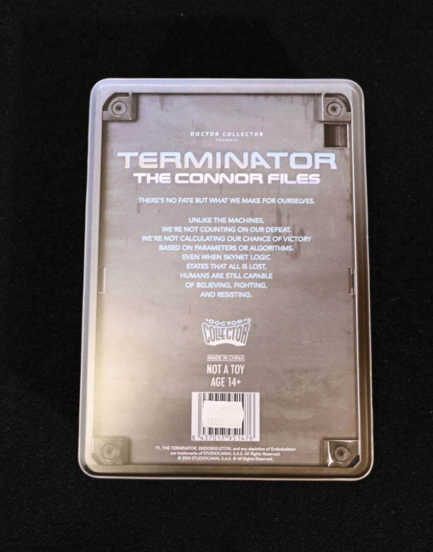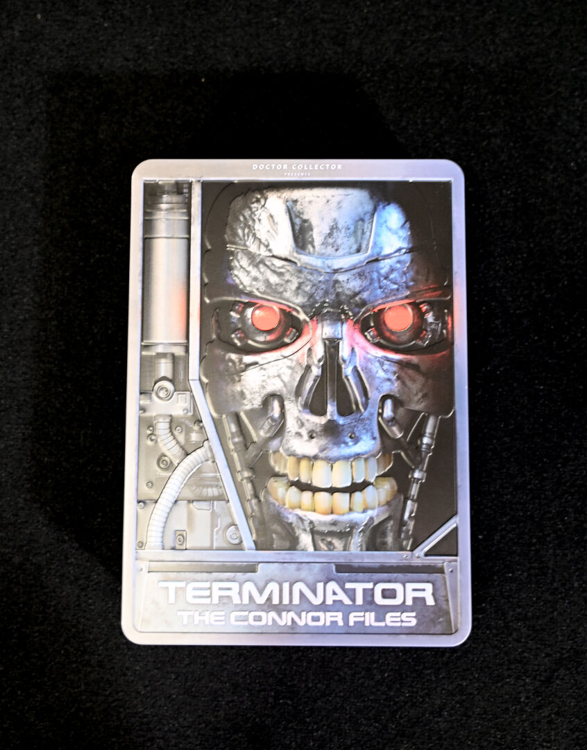 TERMINATOR – DOCTOR COLLECTOR. Boîte « Terminator The Connor Files » comprenant des goodies (plaques de matricule, poster, fausses photo. Dim. de la boîte : 25,5 x 18 x 6,5 cm. On joint un livre « Terminator – Anatomie d’un mythe » de Ian Nathan Huginn & Muninn 2013.