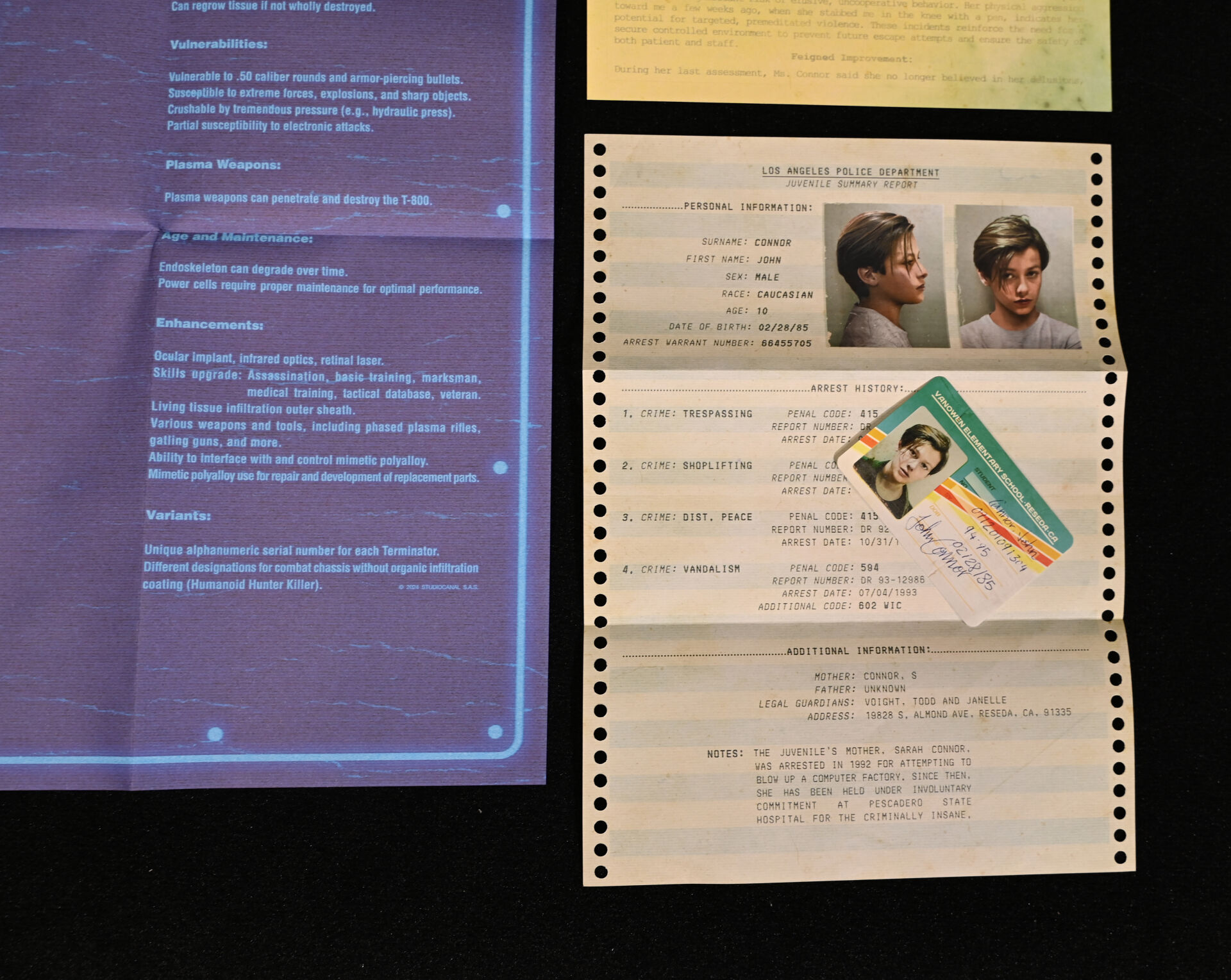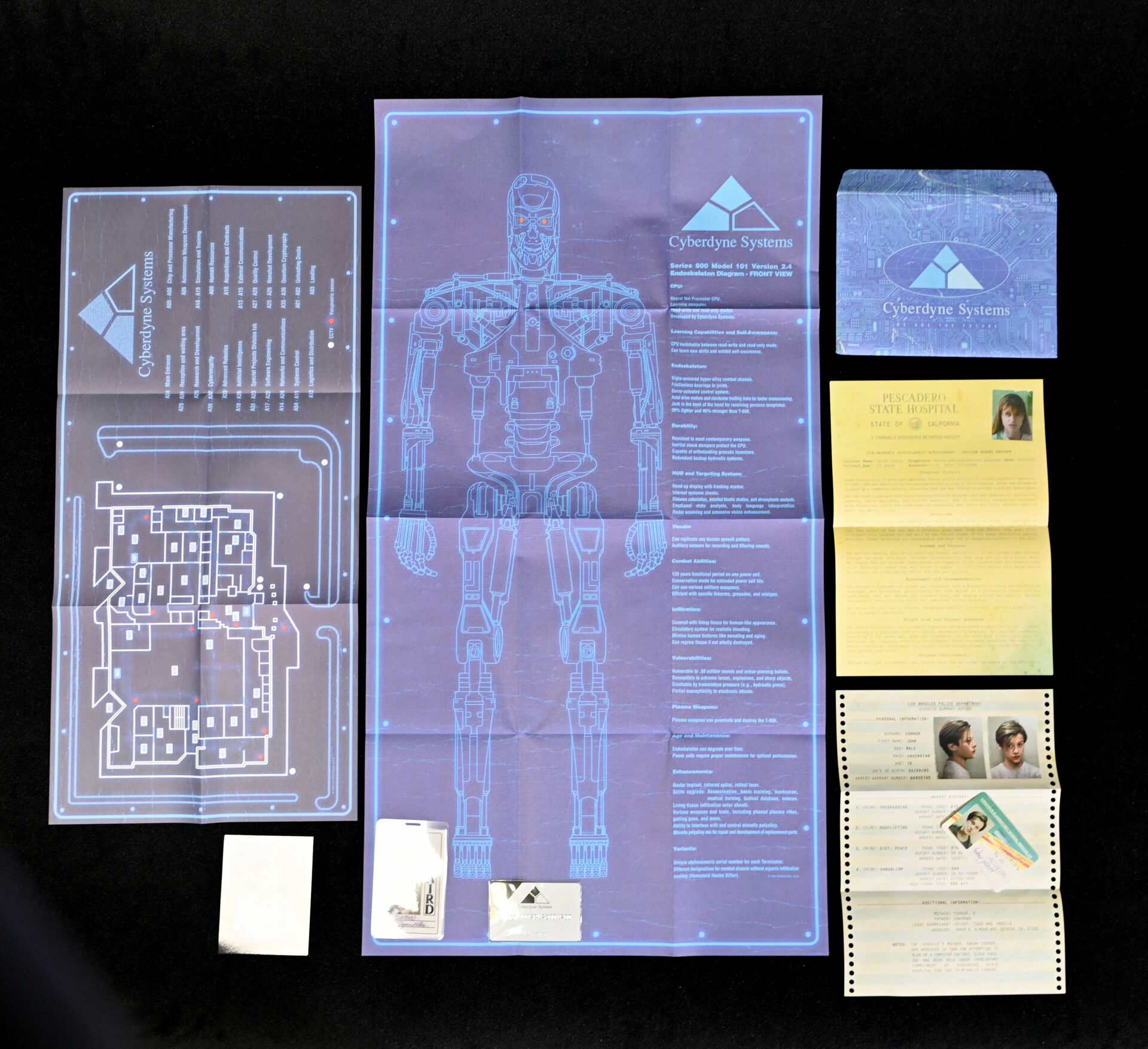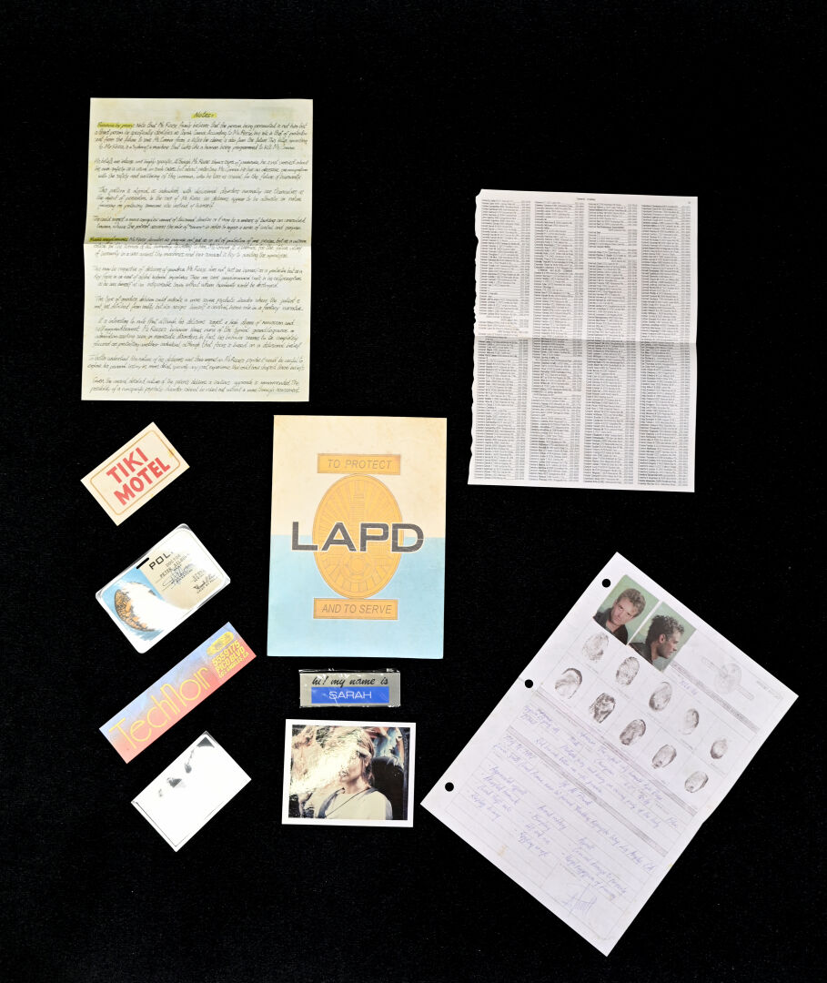 TERMINATOR – DOCTOR COLLECTOR. Boîte « Terminator The Connor Files » comprenant des goodies (plaques de matricule, poster, fausses photo. Dim. de la boîte : 25,5 x 18 x 6,5 cm. On joint un livre « Terminator – Anatomie d’un mythe » de Ian Nathan Huginn & Muninn 2013.